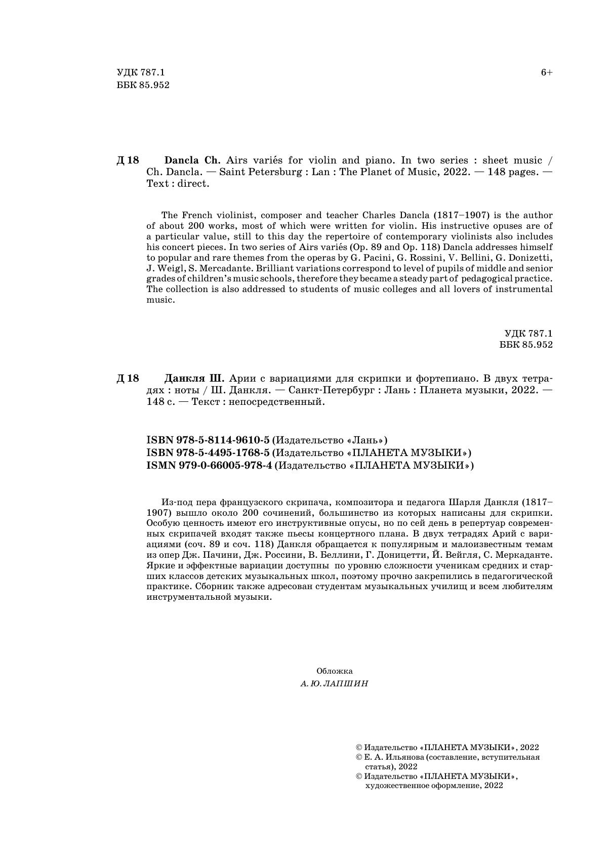 The French violinist, composer and teacher Charles Dancla (1817–1907) is the author of about 200 works, most of which were written for violin. His instructive opuses are of a particular value, still to this day the repertoire of contemporary violinists also includes his concert pieces. In two serieds of Airs variés (Op. 89 and Op. 118) Dancla addresses himself to popular and rare themes from the operas by G. Pacini, G. Rossini, V. Bellini, G. Donizetti, J. Weigl, S. Mercadante. Brilliant variations correspond to level of pupils of middle and senior grades of children’s music schools, therefore they became a steady part of pedagogical practice. The collection is also addressed to students of music colleges and all lovers of instrumental music.