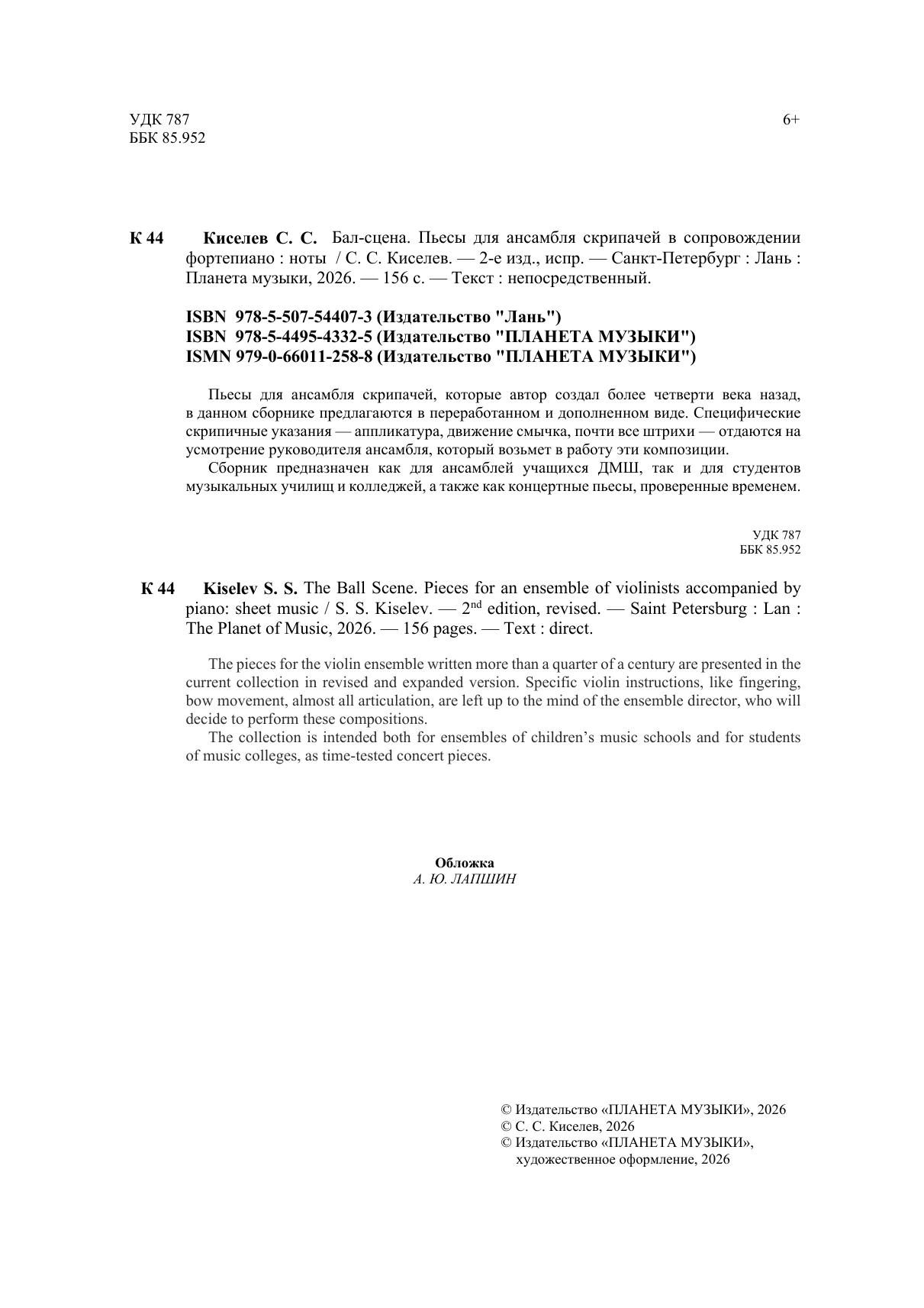 Пьесы для ансамбля скрипачей, которые автор создал более четверти века назад, в данном сборнике предлагаются в перерабонном и дополненном виде. Специфические скрипичные указания - аппликатура, движение смычка, почти все штрихи - отдаются на усмотрение руководителя ансамбля, который возьмет в работу эти композиции. Сборник предназначен как для ансамблей учащихся ДМШ, так и для студентов музыкальных училищ и колледжей, а также как концертные пьесы, проверенные временем. The pieces for the violin ensemble written more than a quarter of a century are presented in the current collection in revised and expanded version. Specific violin instructions, like fingering, bow movement, almost all articulation, are left up to the mind of the ensemble director, who will decide to perform these compositions. The collection is intended both for ensembles of children’s music schools and for students of music colleges, as time-tested concert pieces.
