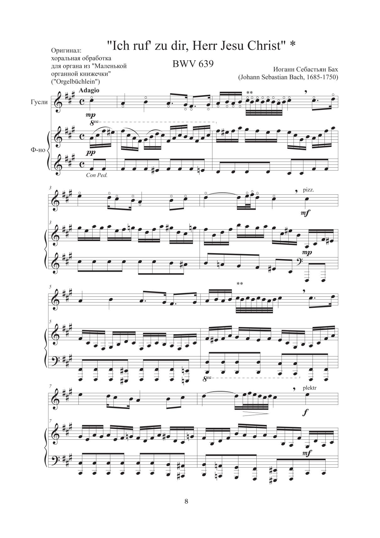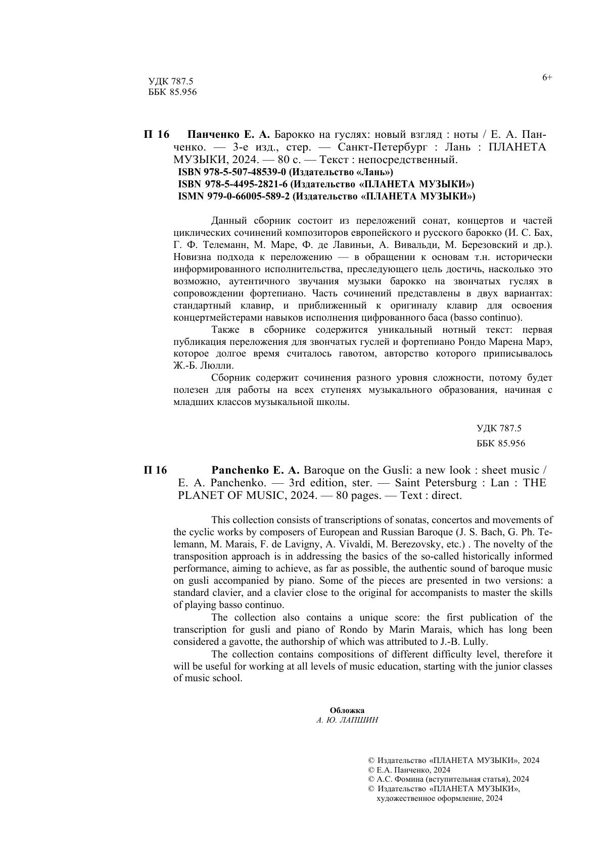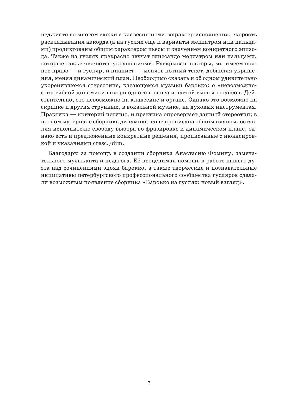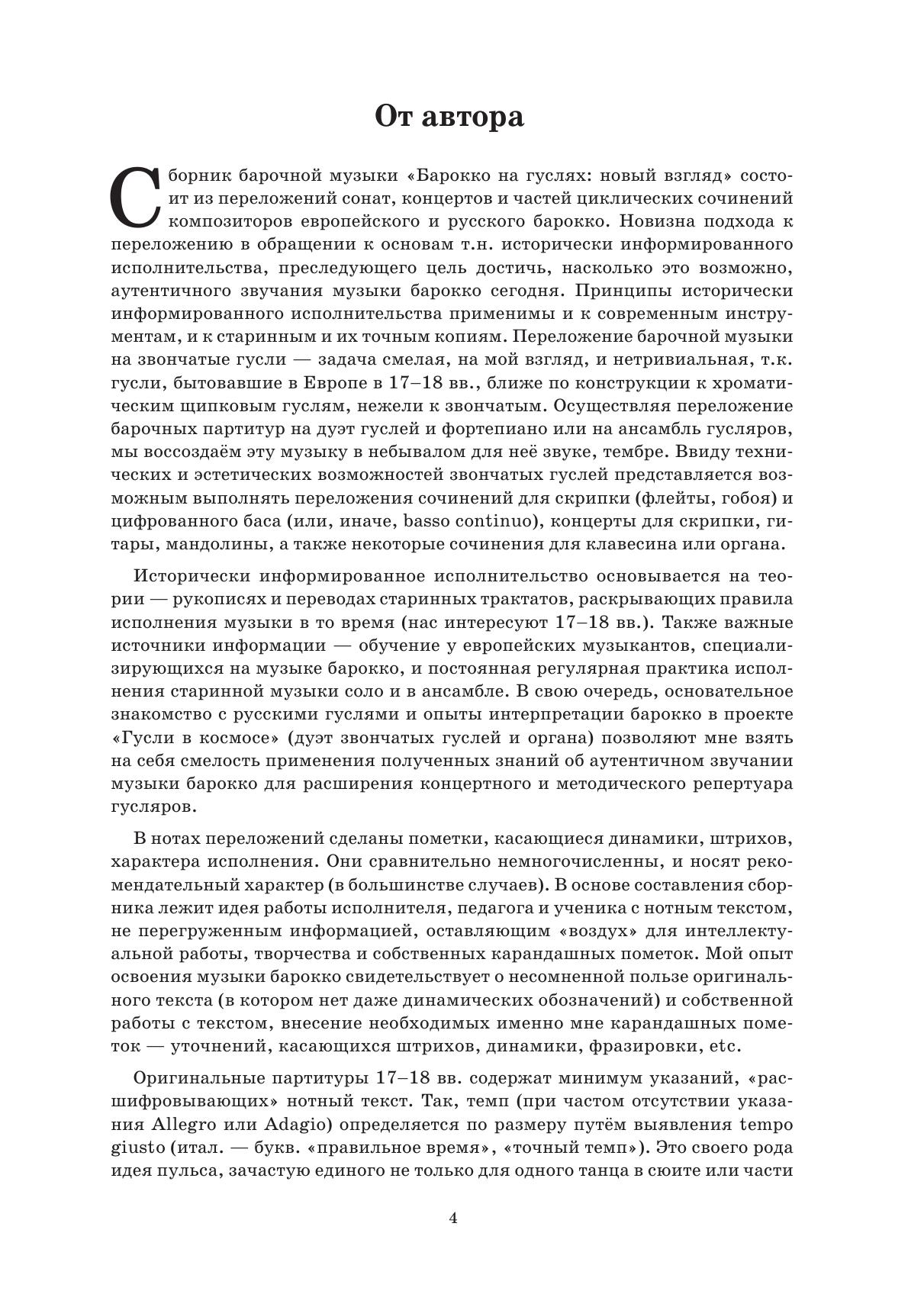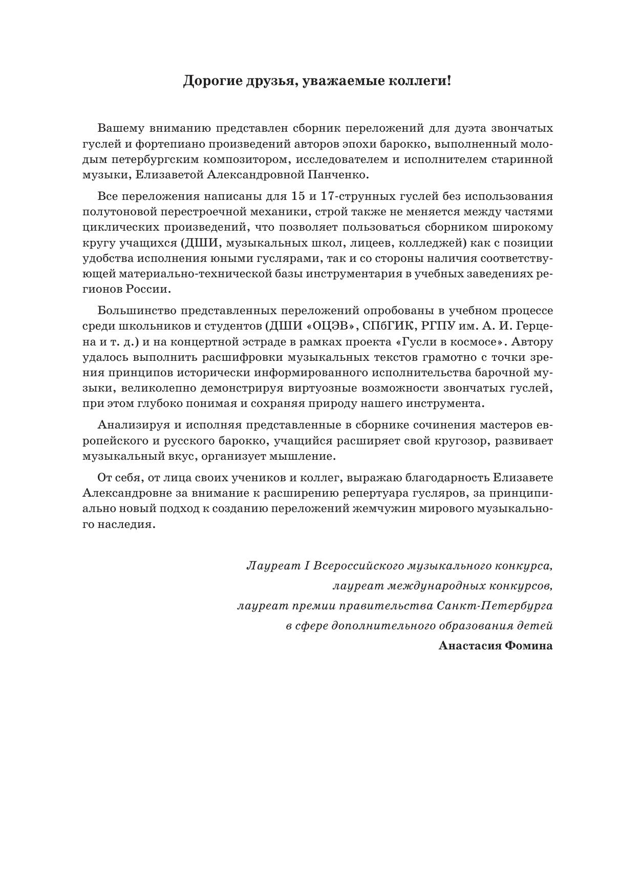 Данный сборник состоит из переложений сонат, концертов и частей циклических сочинений композиторов европейского и русского барокко, И.С. Бах, Г.Ф. Телеманн, М. Маре, Ф. де Лавиньи, А. Вивальди, М. Березовский и др.. Новизна подхода к переложению – в обращении к основам т.н. исторически информированного исполнительства, преследующего цель достичь, насколько это возможно, аутентичного звучания музыки барокко на звончатых гуслях в сопровождении фортепиано. Часть сочинений представлены в двух вариантах: стандартный клавир, и приближенный к оригиналу клавир для освоения концертмейстерами навыков исполнения цифрованного баса, basso continuo. Также в сборнике содержится уникальный нотный текст: первая публикация переложения для звончатых гуслей и фортепиано Рондо Марена Марэ, которое долгое время считалось гавотом, авторство которого приписывалось Ж.-Б. Люлли. Сборник содержит сочинения разного уровня сложности, потому будет полезен для работы на всех ступенях музыкального образования, начиная со средних классов музыкальной школы. This collection consists of transcriptions of sonatas, concertos and movements of the cyclic works by composers of European and Russian Baroque, J.S. Bach, G.Ph. Telemann, M. Marais, F. de Lavigny, A. Vivaldi, M. Berezovsky, etc. . The novelty of the transposition approach is in addressing the basics of the so-called historically informed performance, aiming to achieve, as far as possible, the authentic sound of baroque music on gusli accompanied by piano. Some of the pieces are presented in two versions: a standard clavier, and a clavier close to the original for accompanists to master the skills of playing basso continuo. The collection also contains a unique score: the first publication of the transcription for gusli and piano of Rondo by Marin Marais, which has long been considered a gavotte, the authorship of which was attributed to J.-B. Lully. The collection contains compositions of different difficulty level, therefore it will be us