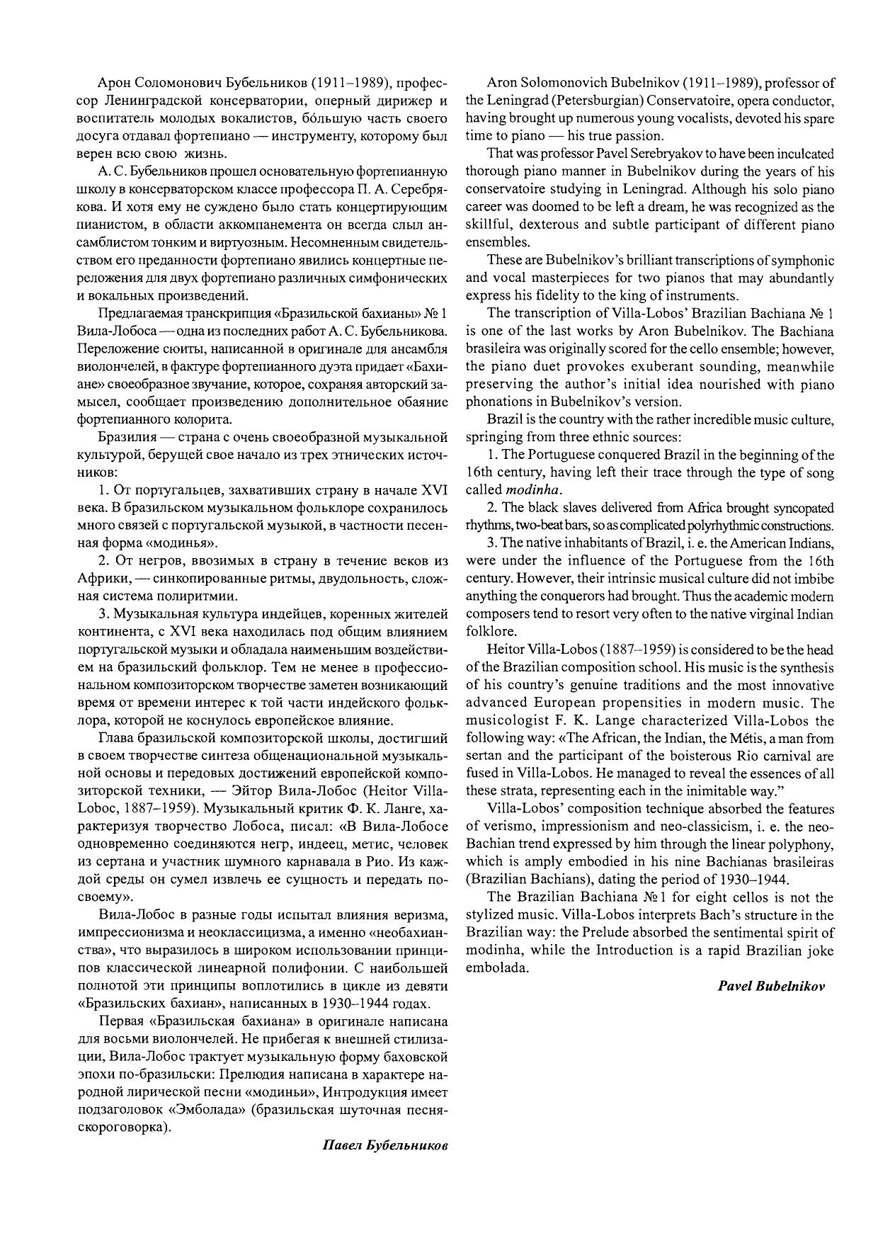 Предлагаемая транскрипция «Бразильской Бахианы» № 1 Вила-Лобоса — одна из последних работ А. Бубельникова. Переложение сюиты, написанной в оригинале для ансамбля виолончелей, в фактуре фортепианного дуэта придает «Бахиане» своеобразное звучание, которое, сохраняя авторский замысел, сообщает произведению дополнительное обаяние фортепианного колорита.