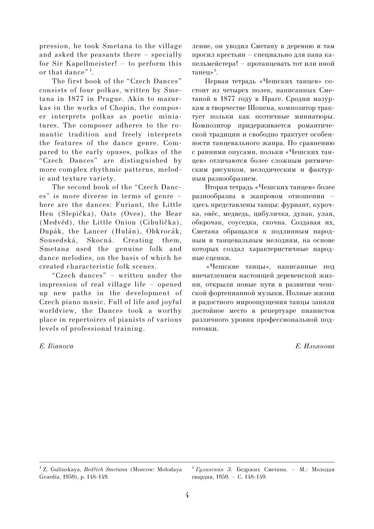 The work of Bedřich Smetana (1824–1884) played a huge role in the development of the Czech composers school. In "Czech Dances" the composer uses widely the authentic folk themes. Among the cycle’s dances, polkas and furiants predominate, and there are also various characteristic dances - "Obkorchak", "Chicken", "Sousedka", etc.