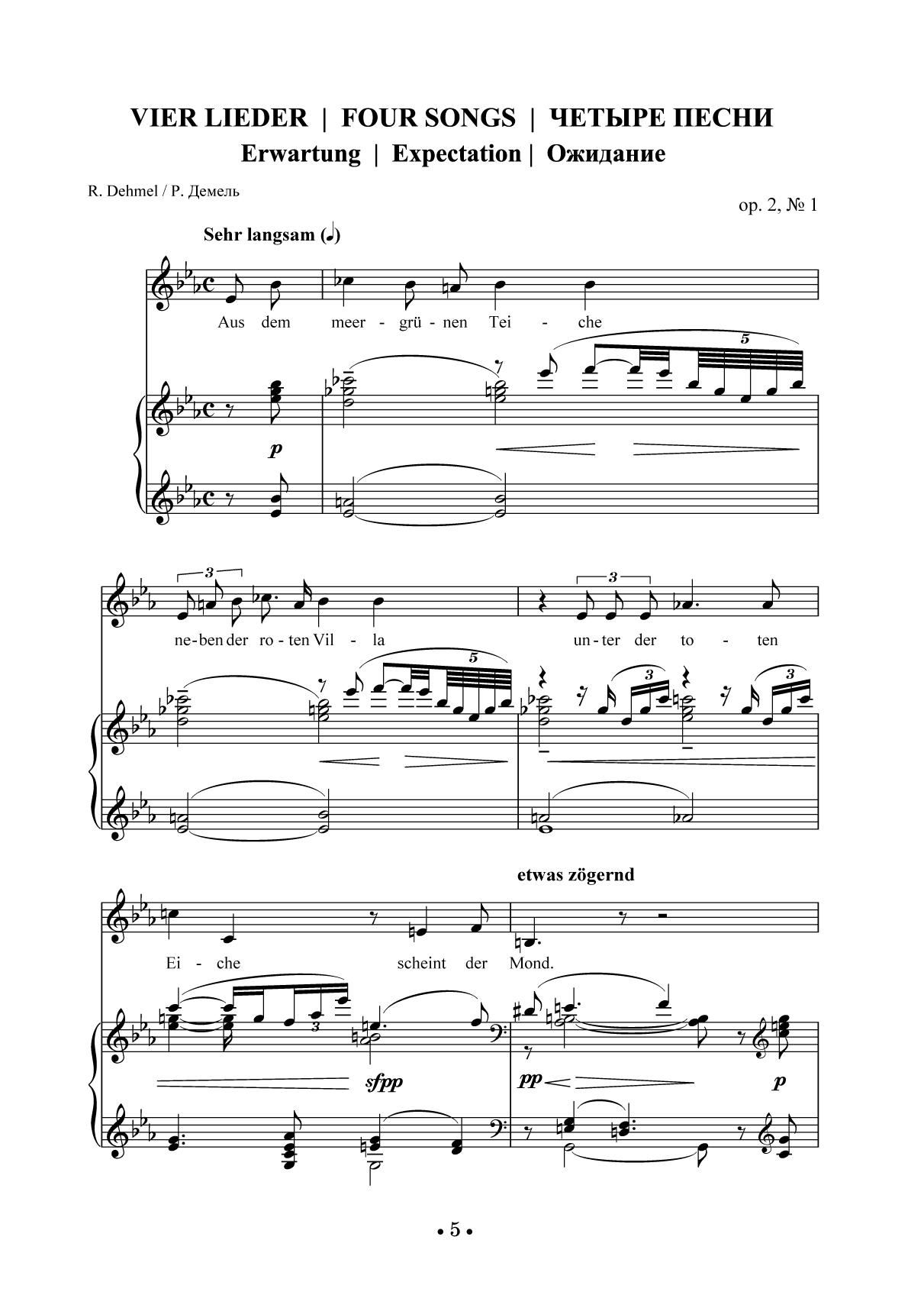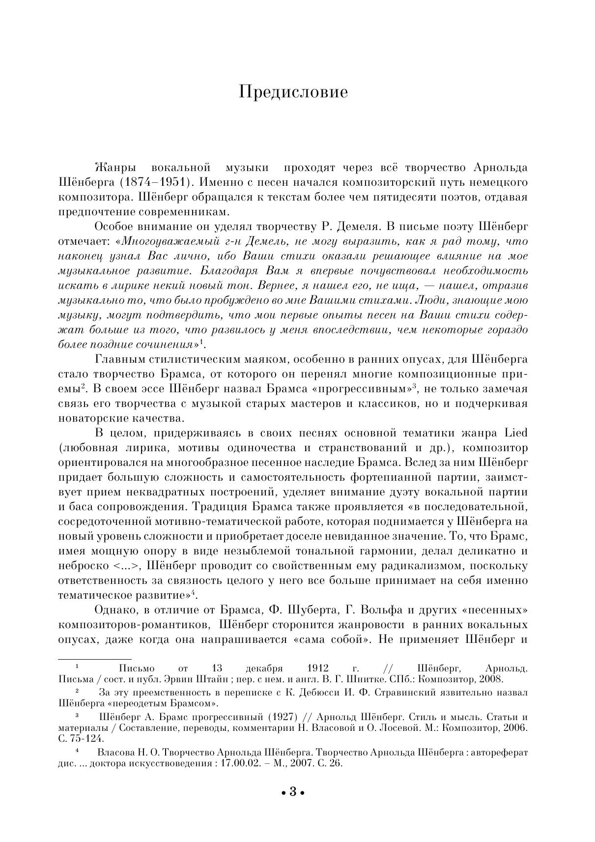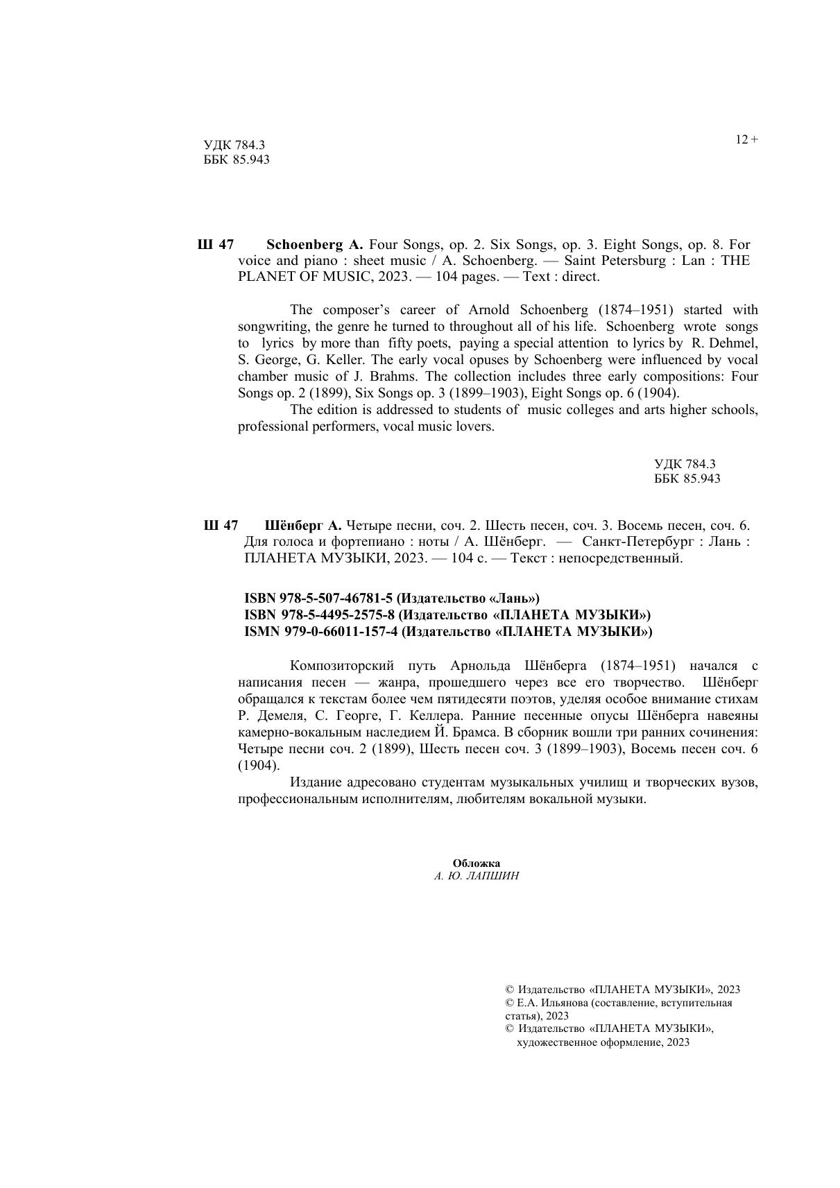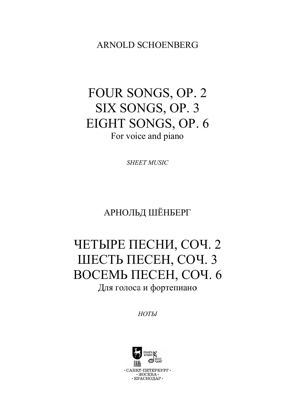 Композиторский путь Арнольда Шёнберга (1874–1951) начался с написания песен — жанра, прошедшего через все его творчество. Шёнберг обращался к текстам более чем пятидесяти поэтов, уделяя особое внимание стихам Р. Демеля, С. Георге, Г. Келлера. Ранние песенные опусы Шёнберга навеяны камерно-вокальным наследием Й. Брамса. В сборник вошли три ранних сочинения: Четыре песни соч. 2 (1899), Шесть песен соч. 3 (1899–1903), Восемь песен соч. 6 (1904). Издание адресовано студентам музыкальных училищ и творческих вузов, профессиональным исполнителям, любителям вокальной музыки. The composer’s career of Arnold Schoenberg (1874–1951) started with songwriting, the genre he turned to throughout all of his life. Schoenberg wrote songs to lyrics by more than fifty poets, paying a special attention to lyrics by R. Dehmel, S. George, G. Keller. The early vocal opuses by Schoenberg were influenced by vocal chamber music of J. Brahms. The collection includes three early compositions: Four Songs op. 2 (1899), Six Songs op. 3 (1899–1903), Eight Songs op. 6 (1904). The edition is addressed to students of music colleges and arts higher schools, professional performers, vocal music lovers.