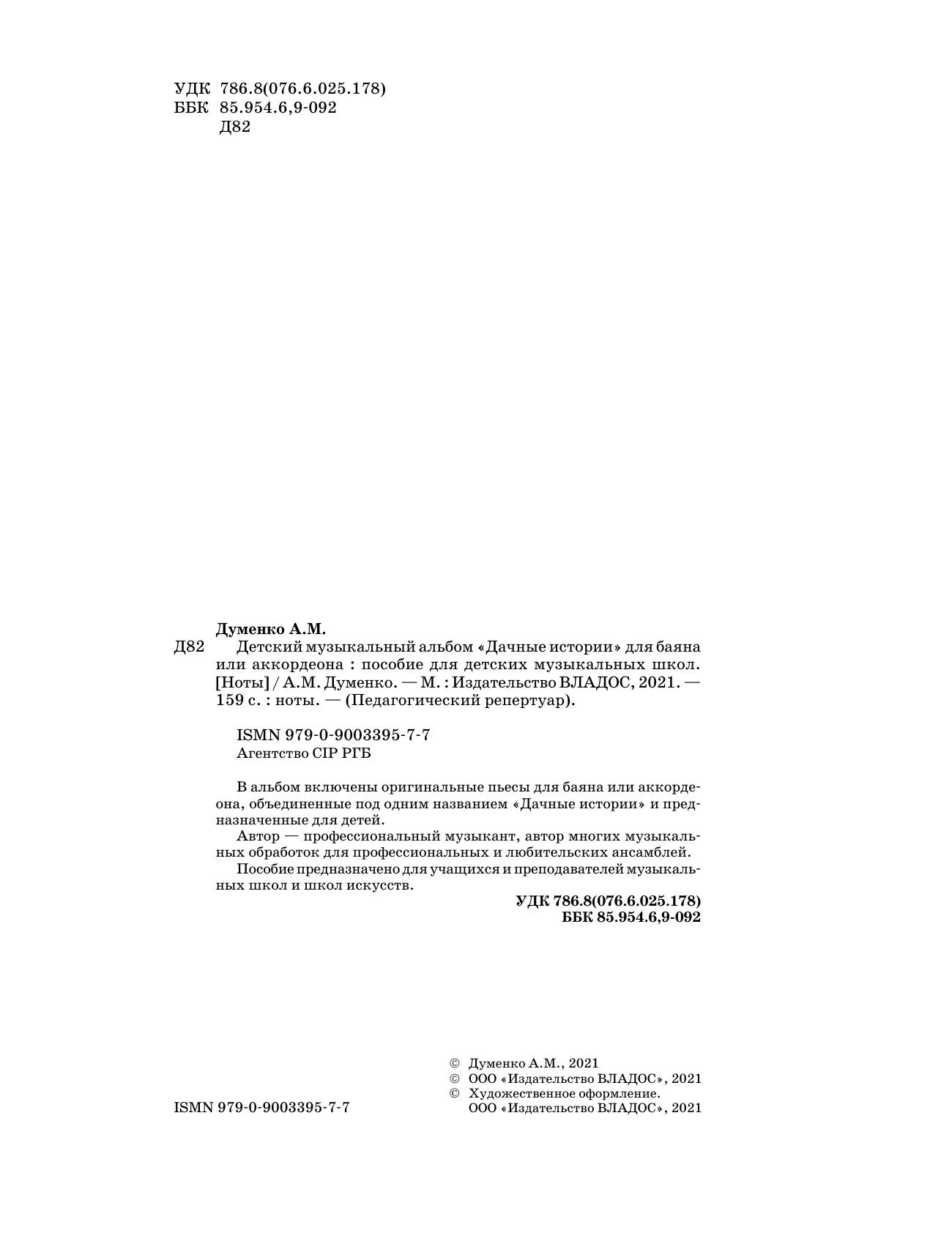 В сборник включены оригинальные пьесы для баяна или аккордеона, объединенные под одним названием: «Дачные истории». Автор — профессиональный музыкант, автор многих музыкальных обработок для профессиональных и любительских ансамблей народного и русского танца. Для учеников и преподавателей музыкальных школ, фольклорных музыкальных коллективов, любителей исполнительского искусства.