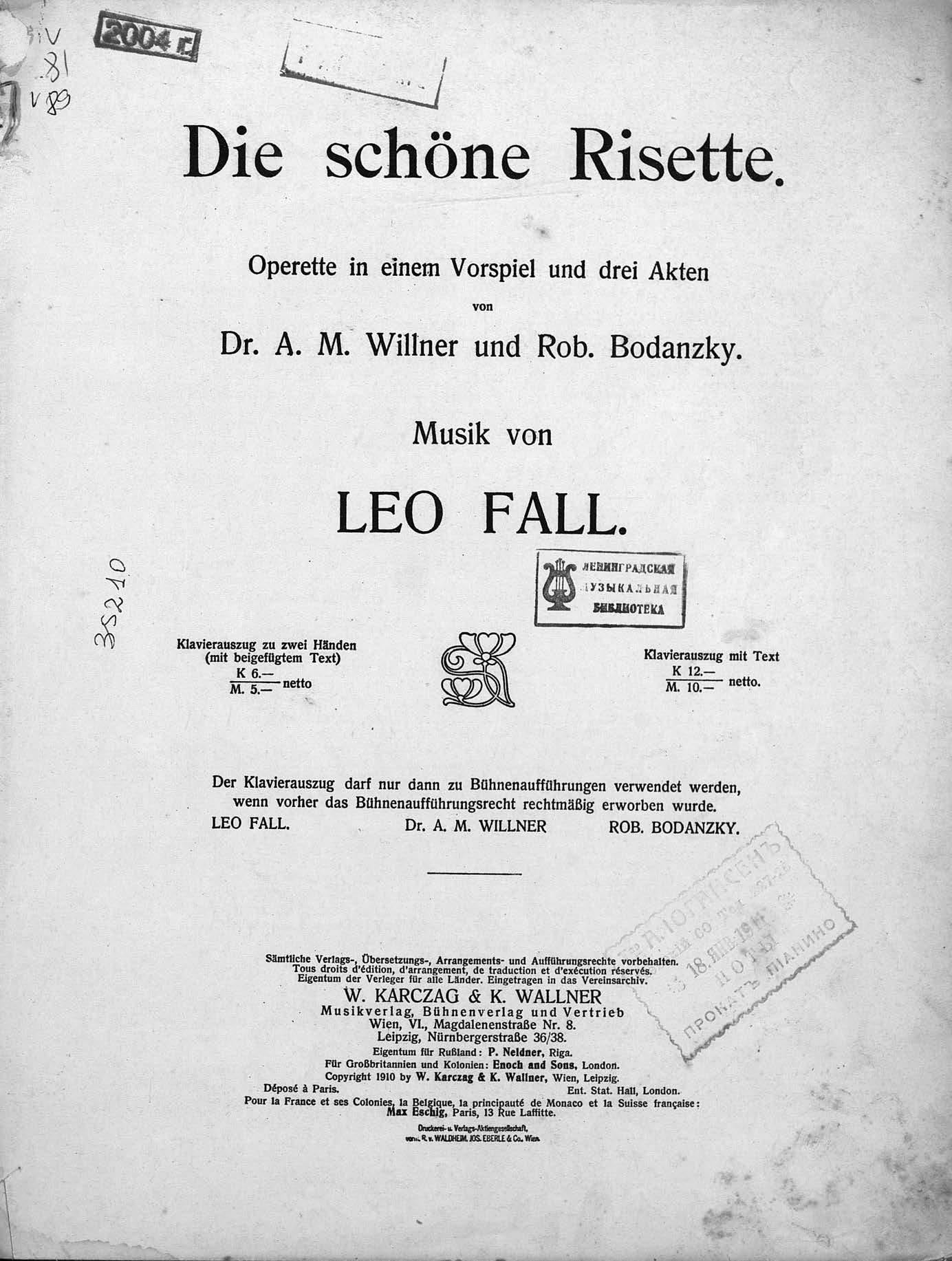 Перешедшие в общественное достояние материалы электронного фонда ЦГПБ им. В.В. Маяковского. Сведения о издательстве или типографии: W. Karczag & C. Wallner. Место издания: Лейпциг