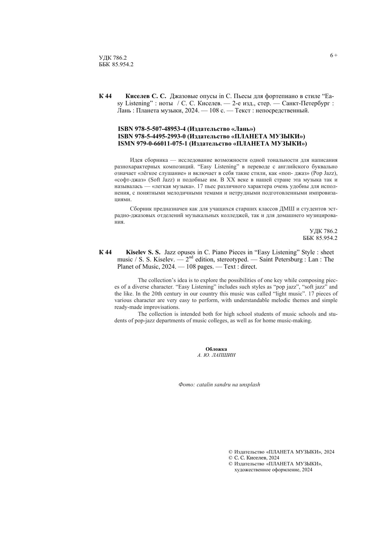 Идея сборника — исследование возможности одной тональности для написания разнохарактерных композиций. “Easy Listening” в переводе с английского буквально означает «лёгкое слушание» и включает в себя такие стили, как «поп-джаз» (Pop Jazz), «софт-джаз» (Soft Jazz) и подобные им. В XX веке в нашей стране эта музыка так и называлась — «легкая музыка». 17 пьес различного характера очень удобны для исполнения, с понятными мелодичными темами и нетрудными подготовленными импровизациями. Сборник предназначен как для учащихся старших классов ДМШ и студентов эстрадно-джазовых отделений музыкальных колледжей, так и для домашнего музицирования. The collection’s idea is to explore the possibilities of one key while composing pieces of a diverse character. “Easy Listening” includes such styles as “pop jazz”, “soft jazz” and the like. In the 20th century in our country this music was called “light music”. 17 pieces of various character are very easy to perform, with understandable melodic themes and simple ready-made improvisations. The collection is intended both for high school students of music schools and students of pop-jazz departments of music colleges, as well as for home music-making.