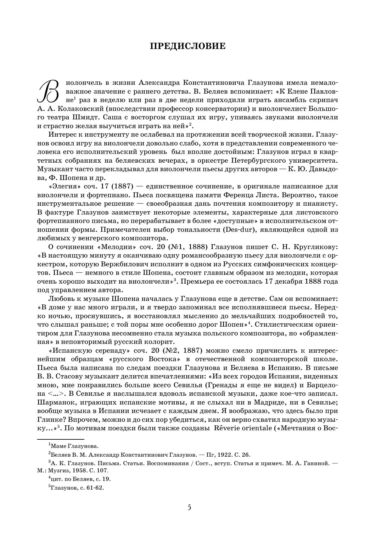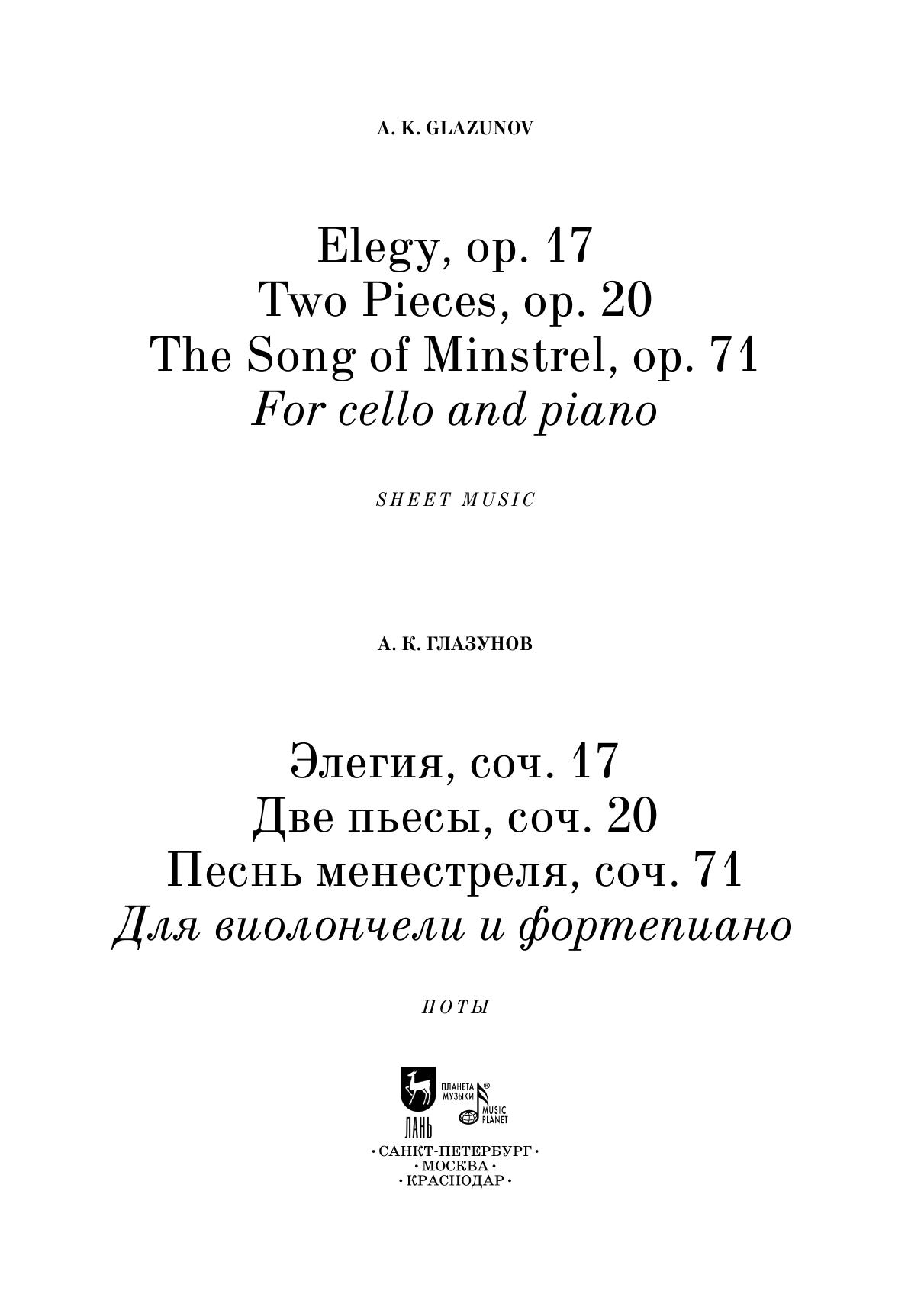 Музыка для виолончели в творчестве Александра Константиновича Глазунова (1865-1936) представлена всего несколькими опусами. Вместе с тем в пьесах отразились наиболее специфические черты его композиторского мышления. Элегия памяти Листа (соч. 17), Мелодия и Испанская серенада (соч. 20), Песнь менестреля (соч. 71) — сочинения, которые достойно украсят репертуар как обучающегося игре на инструменте, так и профессионального исполнителя.