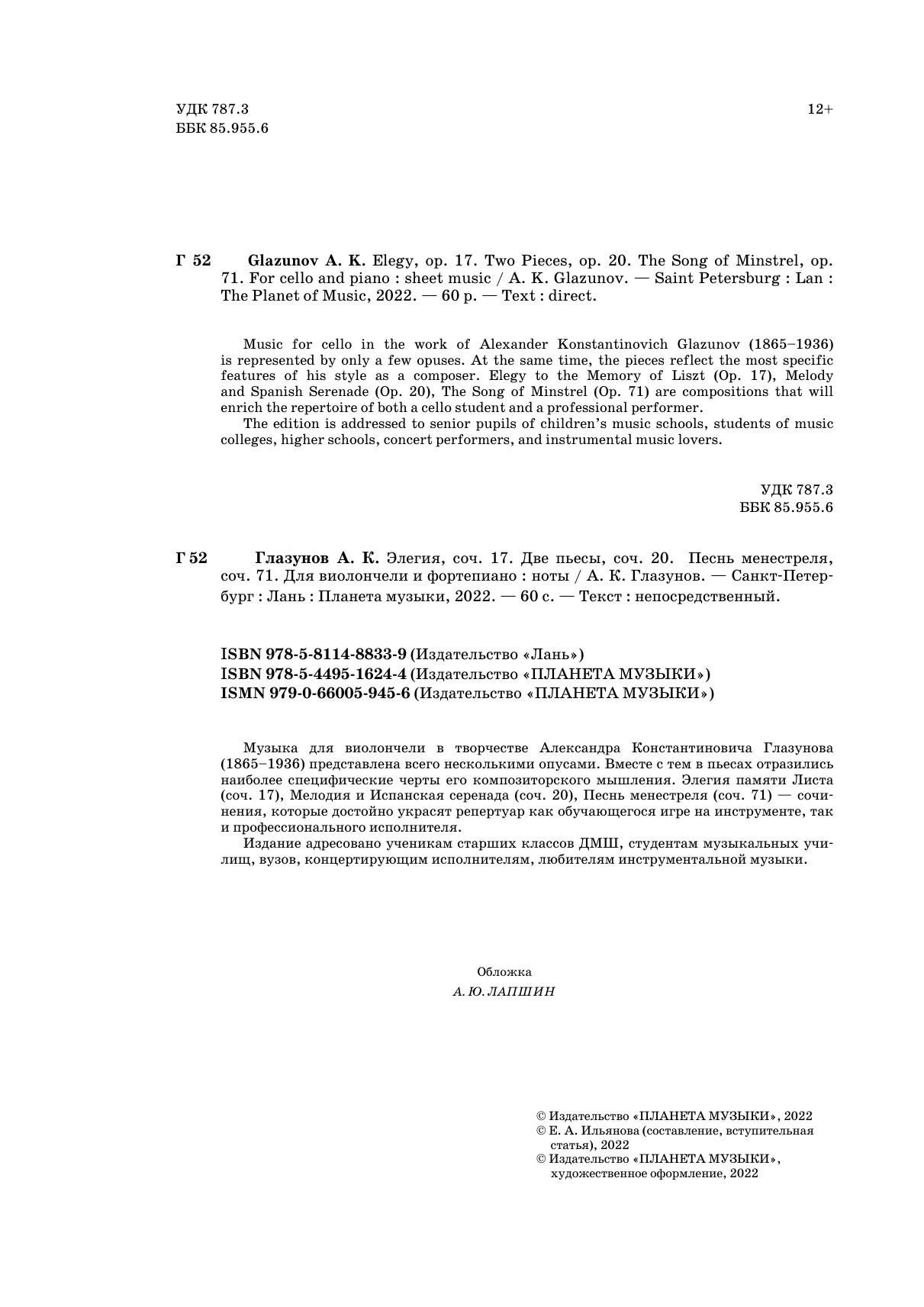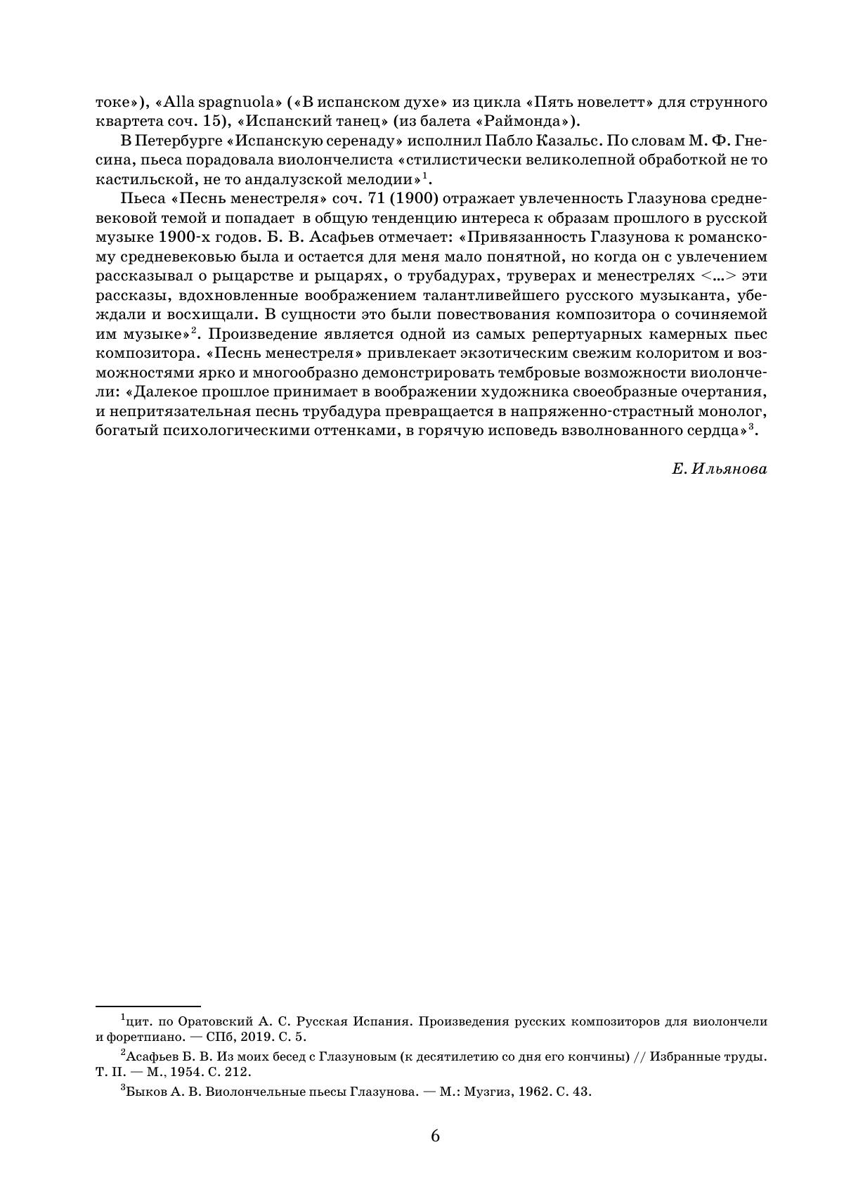 Music for cello in the work of Alexander Konstantinovich Glazunov (1865–1936) is represented by only a few opuses. At the same time, the pieces reflect the most specific features of his style as a composer. Elegy to the Memory of Liszt (Op. 17), Melody and Spanish Serenade (Op. 20), The Song of Minstrel (Op. 71) are compositions that will enrich the repertoire of both a cello student and a professional performer.