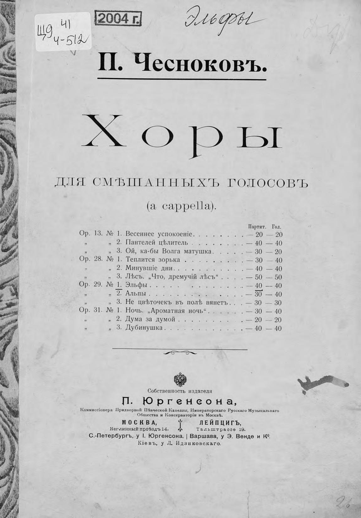 Перешедшие в общественное достояние материалы электронного фонда ЦГПБ им. В.В. Маяковского. Сведения о издательстве или типографии: П. Юргенсон. Место издания: Москва