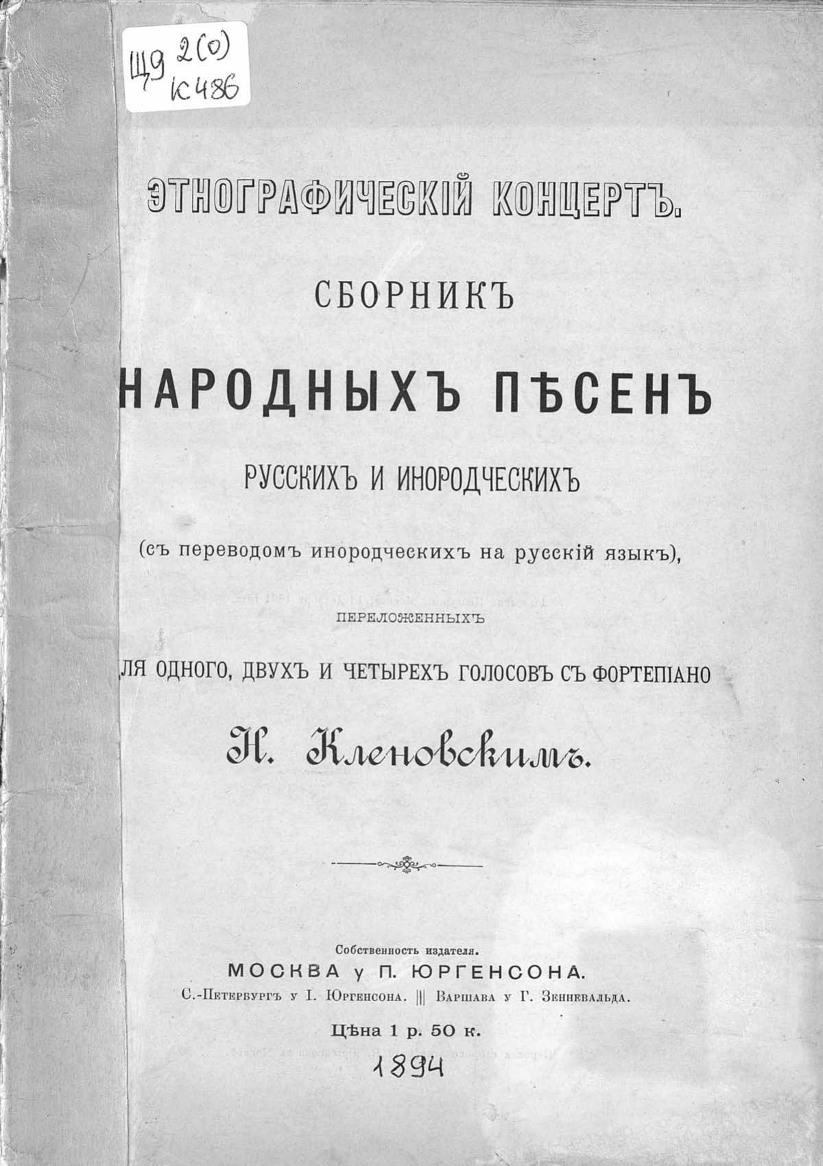 Перешедшие в общественное достояние материалы электронного фонда ЦГПБ им. В.В. Маяковского. Сведения о издательстве или типографии: П. Юргенсон. Место издания: Москва