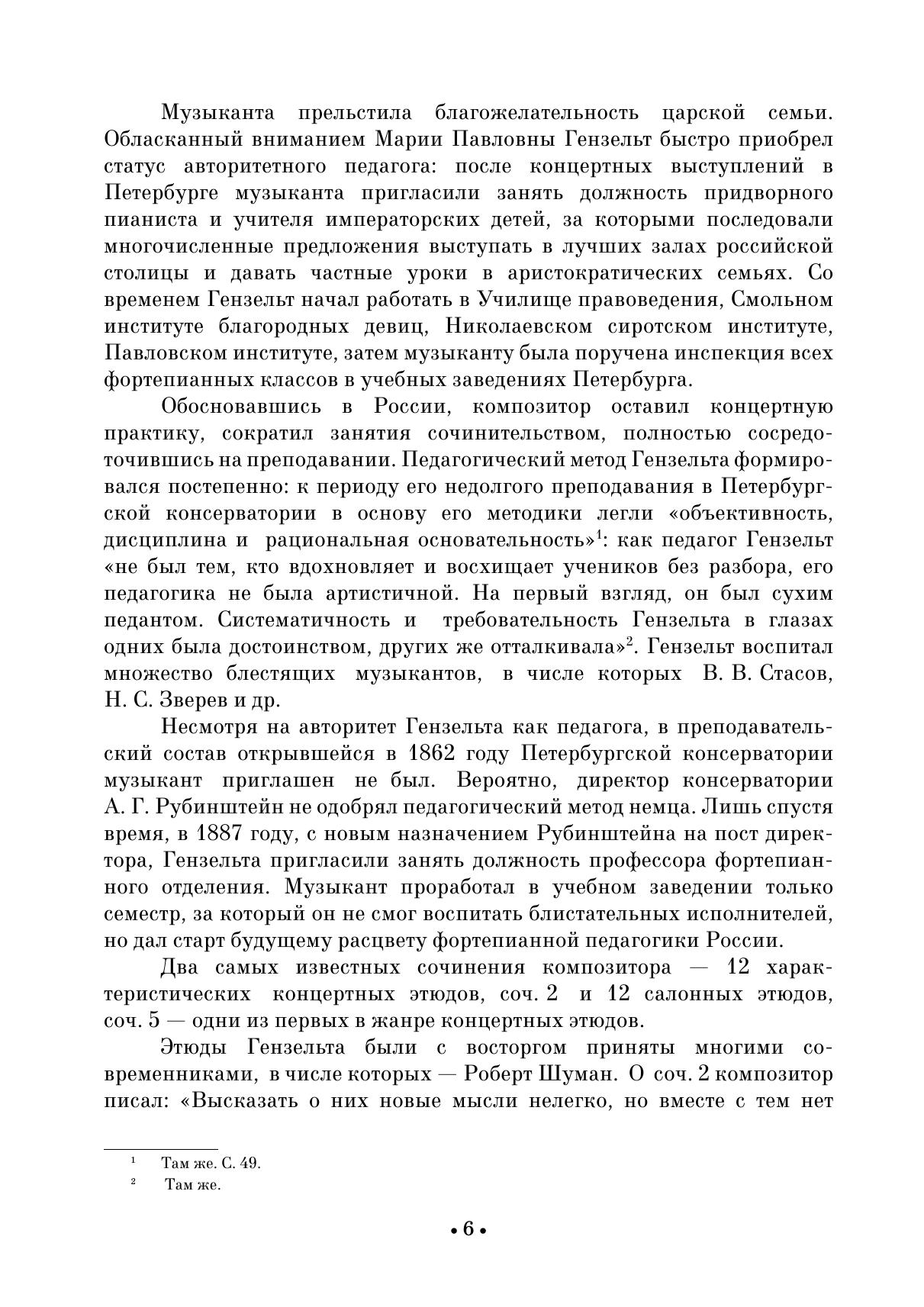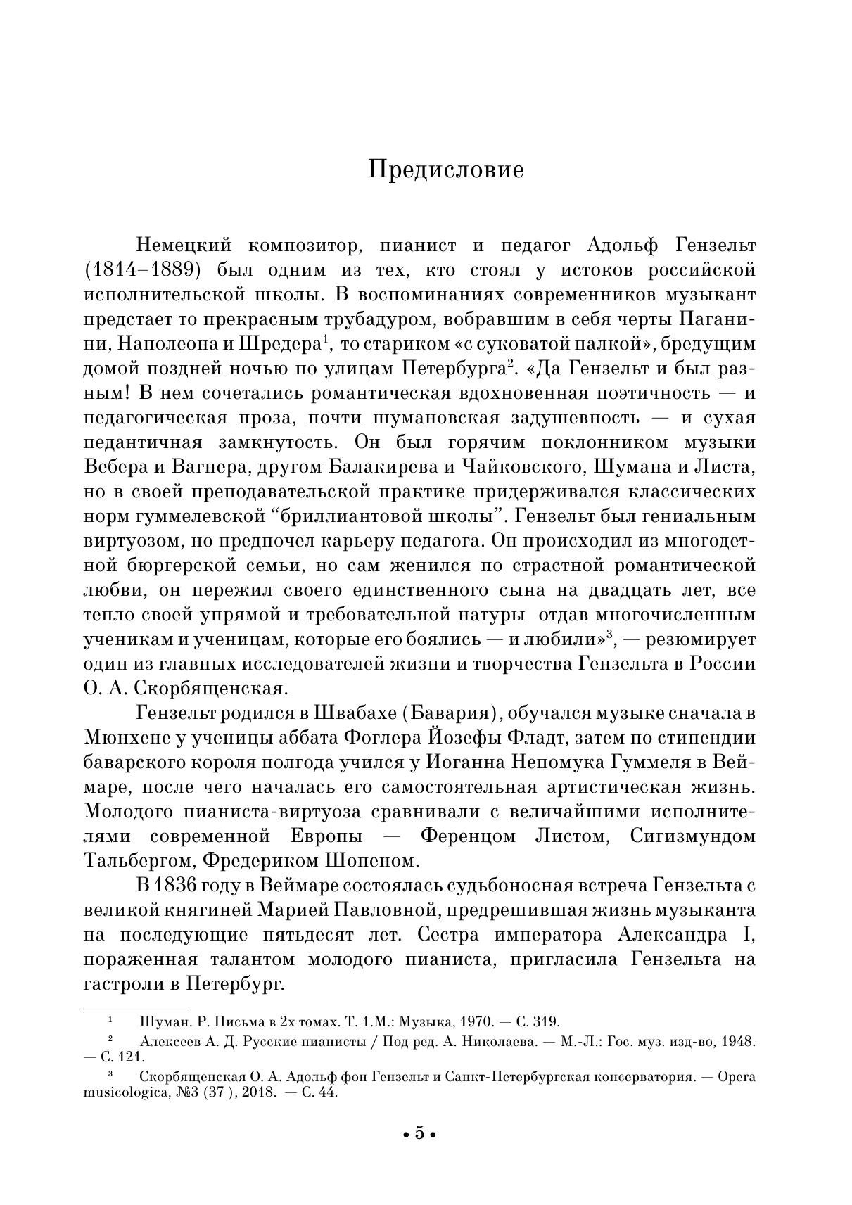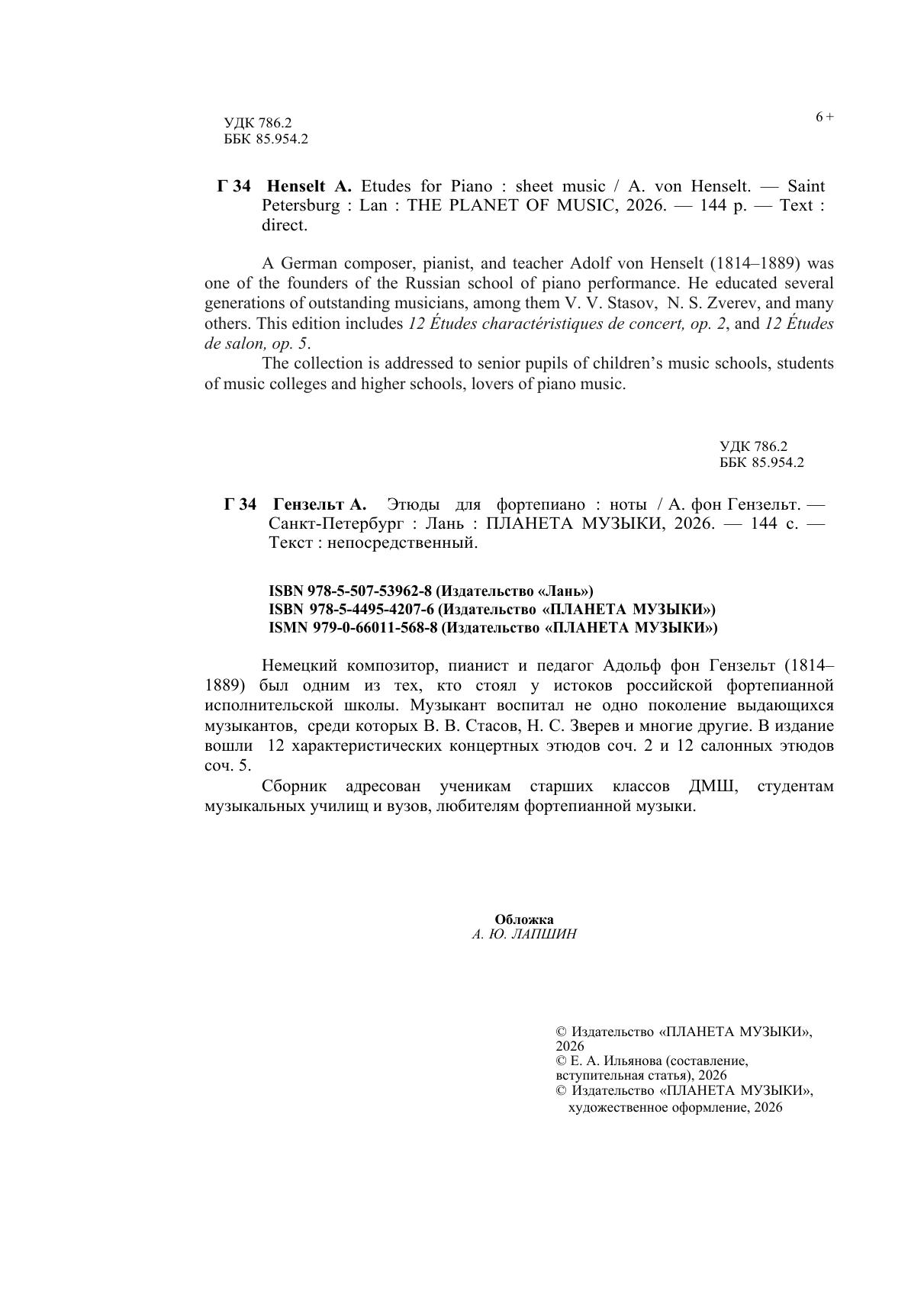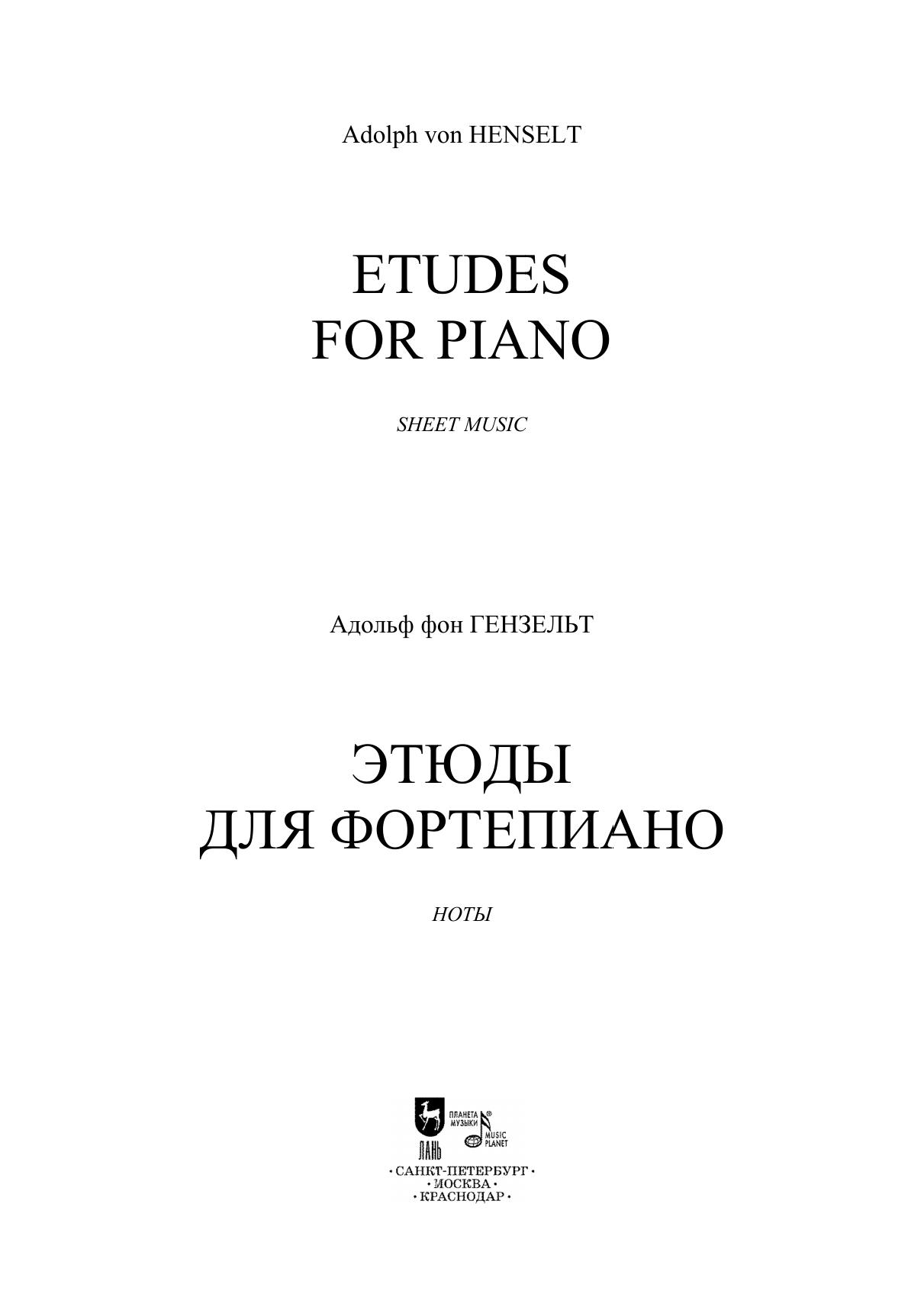Немецкий композитор, пианист и педагог Адольф фон Гензельт (1814–1889) был одним из тех, кто стоял у истоков российской фортепианной исполнительской школы. Музыкант воспитал не одно поколение выдающихся музыкантов, среди которых В. В. Стасов, Н. С. Зверев и многие другие. В издание вошли 12 характеристических концертных этюдов соч. 2 и 12 салонных этюдов соч. 5. Сборник адресован ученикам старших классов ДМШ, студентам музыкальных училищ и вузов, любителям фортепианной музыки. A German composer, pianist, and teacher Adolf von Henselt (1814–1889) was one of the founders of the Russian school of piano performance. He educated several generations of outstanding musicians, among them V. V. Stasov, N. S. Zverev, and many others. This edition includes 12 Études charactéristiques de concert, op. 2, and 12 Études de salon, op. 5. The collection is addressed to senior pupils of children’s music schools, students of music colleges and higher schools, lovers of piano music.