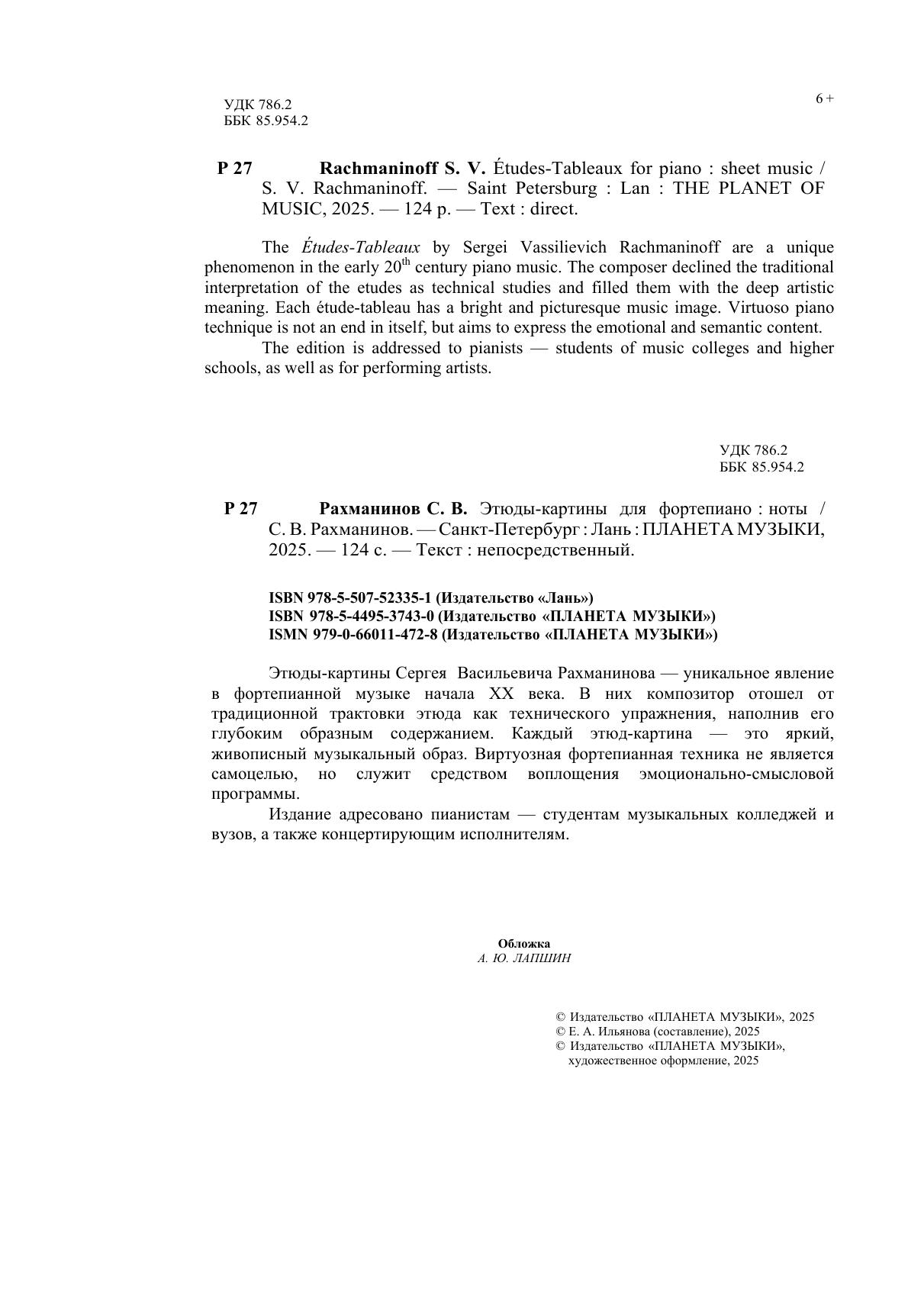 Этюды-картины Сергея Васильевича Рахманинова — уникальное явление в фортепианной музыке начала XX века. В них композитор отошёл от традиционной трактовки этюда как технического упражнения, наполнив его глубоким образным содержанием. Каждый этюд-картина — это яркий, живописный музыкальный образ. Виртуозная фортепианная техника не является самоцелью, но служит средством воплощения эмоционально-смысловой программы. Издание адресовано пианистам – студентам музыкальных колледжей и вузов, а также концертирующим исполнителям. The Études-Tableaux by Sergei Vassilievich Rachmaninoff are a unique phenomenon in the early 20th century piano music. The composer declined the traditional interpretation of the etudes as technical studies and filled them with the deep artistic meaning. Each étude-tableau has a bright and picturesque music image. Virtuoso piano technique is not an end in itself, but aims to express the emotional and semantic content. The edition is addressed to pianists — students of music colleges and higher schools, as well as for performing artists.