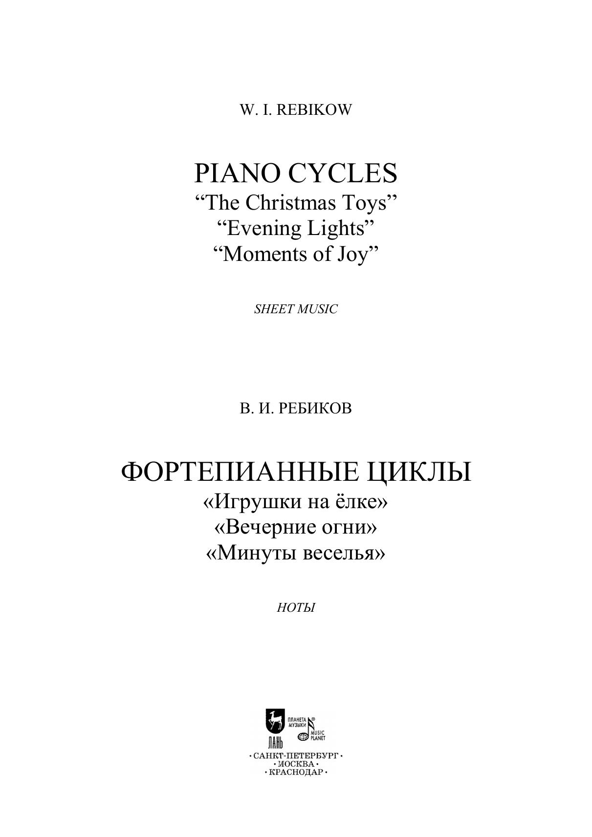 Владимир Иванович Ребиков (1866–1920) — русский композитор, пианист, писатель, новатор, во многом опередивший своих современников, автор десяти опер, двух балетов, множества инструментальных пьес и романсов. Эстетические принципы Ребикова созвучны идеям импрессионизма и символизма, а его художественный интерес связан с исследованием взаимовлияния музыки, слова и живописи. Он создавал свои произведения под влиянием живописи Арнольда Бёклина, а на стихи Валерия Брюсова написал несколько циклов романсов. «Игрушки на елке», «Вечерние огни» и «Минуты веселья» — фортепианные сюиты, состоящие из пьес лирического плана: изящных, образных и технически несложных. Предназначено для учащихся музыкальных школ, студентов средних и высших учебных заведений, а также для любителей фортепианной музыки. Wladimir Ivanovich Rebikow (1866–1920) is a Russian composer, pianist, writer, an innovator who was in many ways ahead of his contemporaries, author of ten operas, two ballets, plenty of instrumental pieces and romances. Rebikow’s aesthetic views were much alike the ideas of impressionism and symbolism, and as an artist he was into the study of a mutual influence of music, words and painting. He created his works under the influence of the Arnold Böcklin art, and composed several cycles of romances to lyrics by Valery Bryusov. “The Christmas Toys”, “Evening Lights” and “Moments of Joy” are piano suites consisting of lyric pieces that are graceful, imaginative and easy. It is intended for pupils of music schools, students of music colleges and higher schools, as well as for piano music lovers.