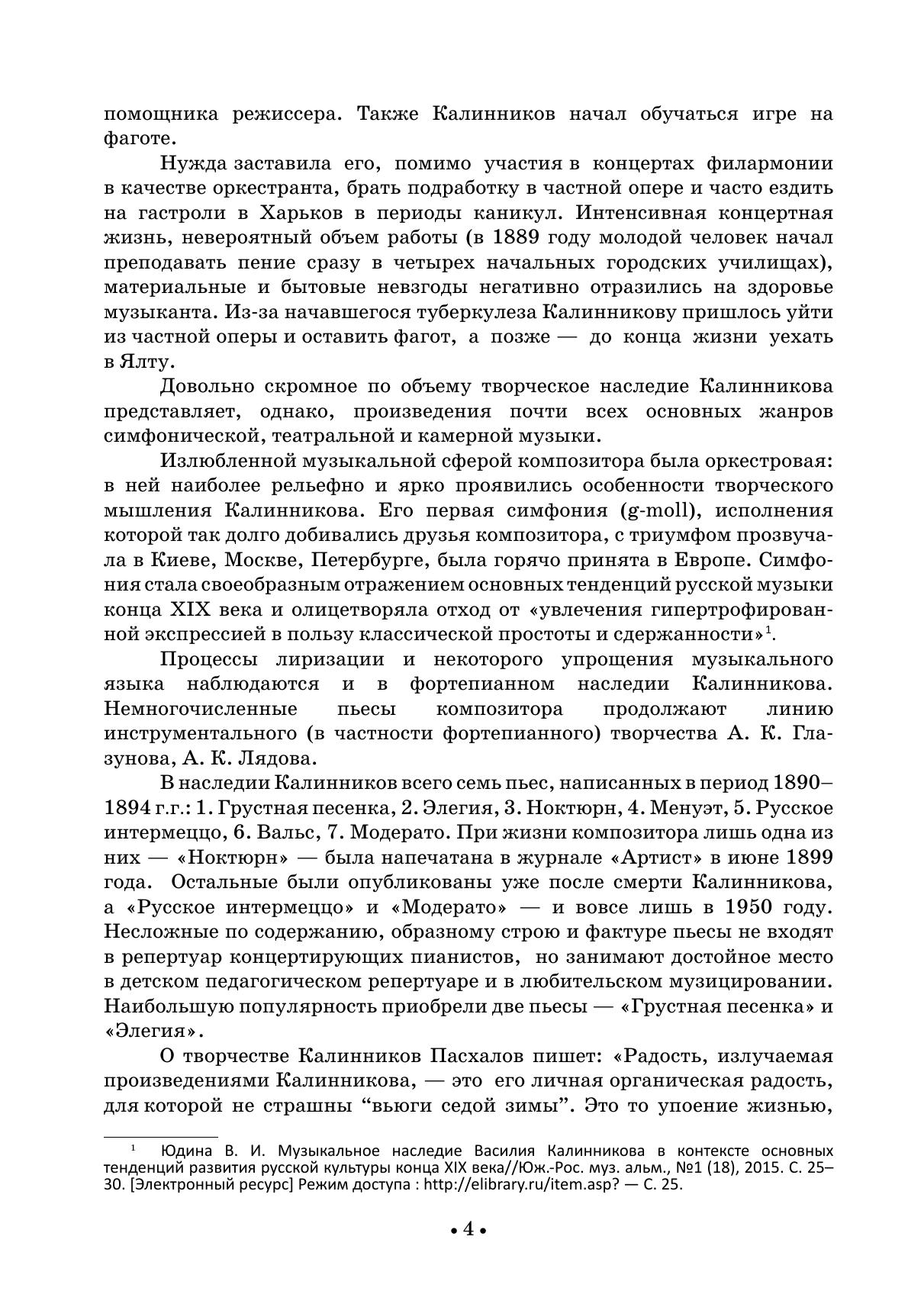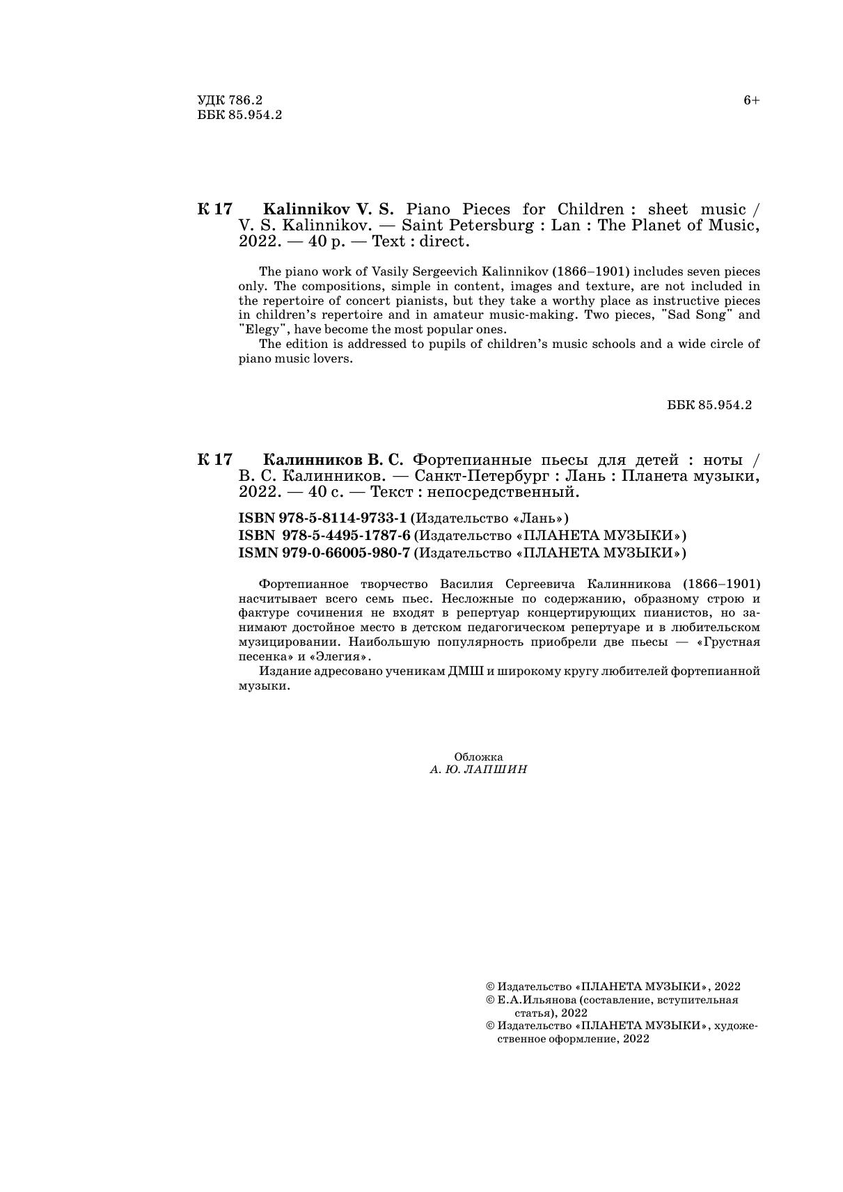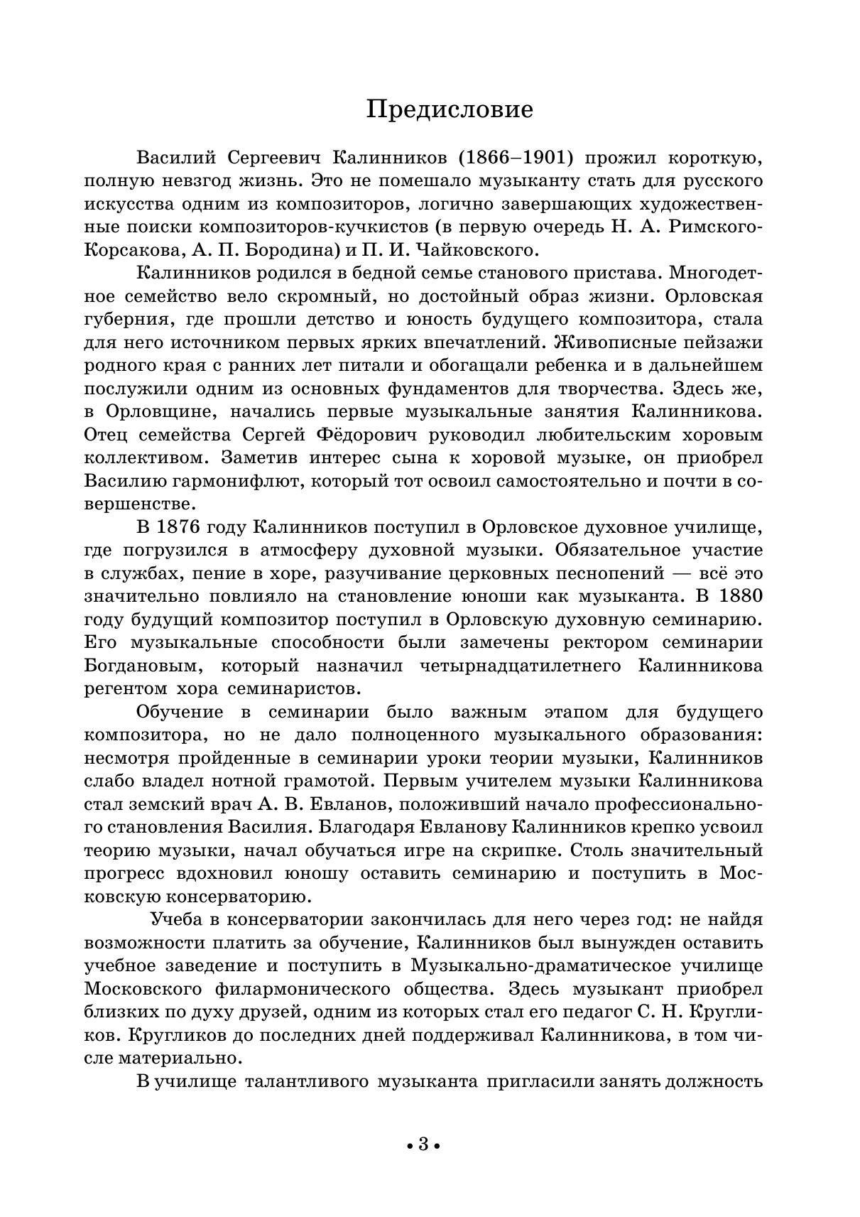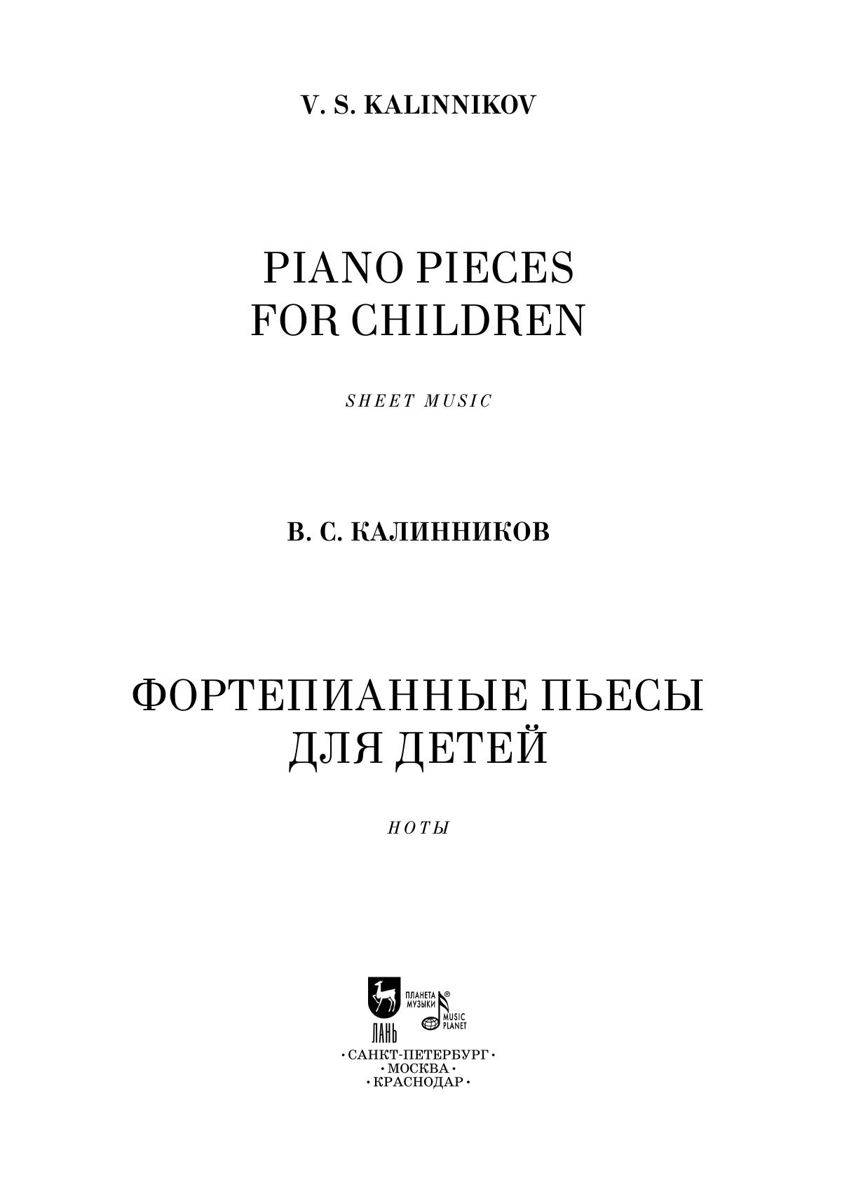 Фортепианное творчество Василия Сергеевича Калинникова (1866-1901) насчитывает всего семь пьес. Несложные по содержанию, образному строю и фактуре сочинения не входят в репертуар концертирующих пианистов, но занимают достойное место в детском педагогическом репертуаре и в любительском музицировании. Наибольшую популярность приобрели две пьесы — «Грустная песенка» и «Элегия». Издание адресовано ученикам дмш и широкому кругу любителей фортепианной музыки.