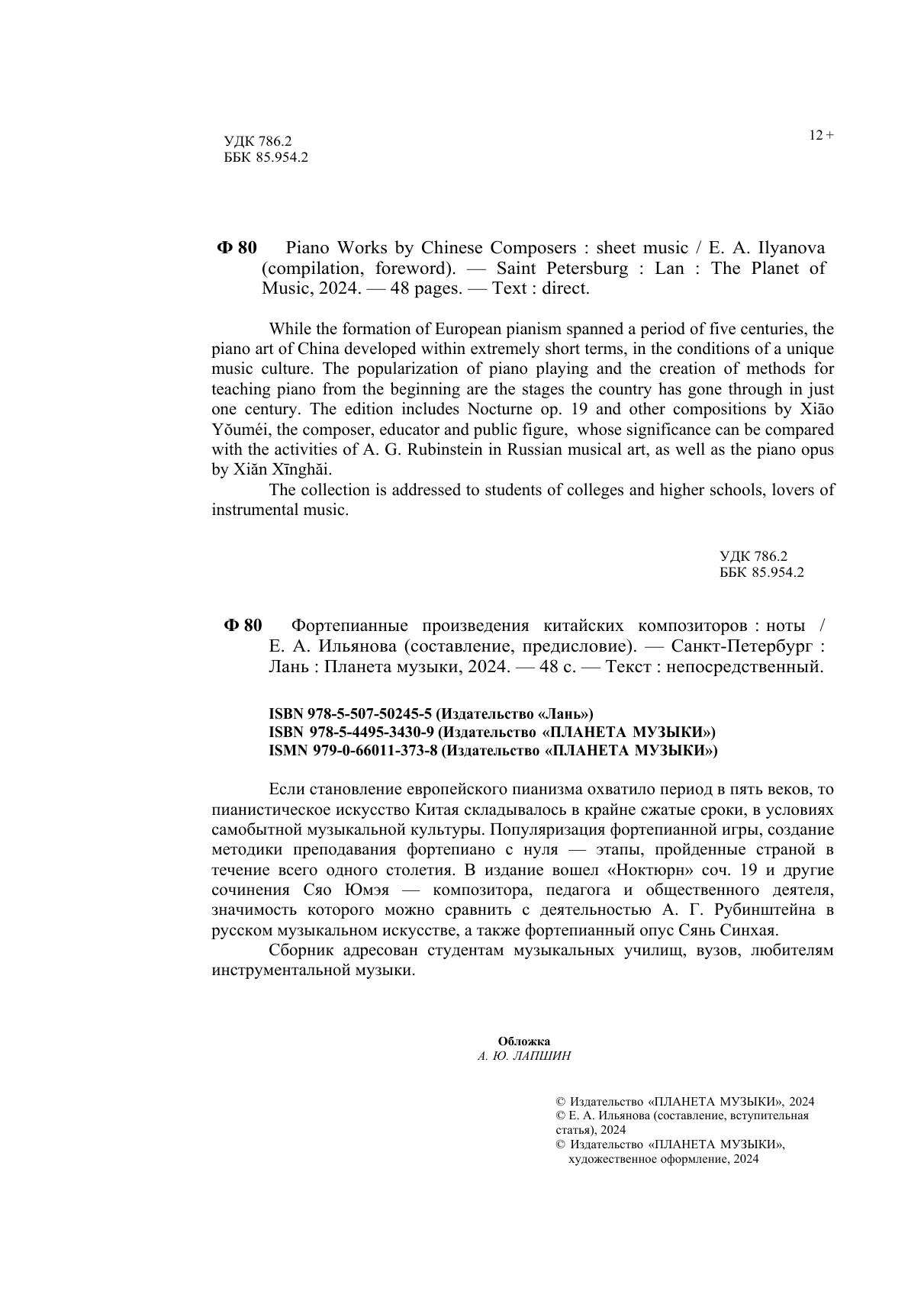 Если становление европейского пианизма охватило период в пять веков, то пианистическое искусство Китая складывалось в крайне сжатые сроки, в условиях самобытной музыкальной культуры. Популяризация фортепианной игры, создание методики преподавания фортепиано с нуля — этапы, пройденные страной в течение всего одного столетия. В издание вошел «Ноктюрн» соч. 19 и другие сочинения Сяо Юмэя — композитора, педагога и общественного деятеля, значимость которого можно сравнить с деятельностью А. Г. Рубинштейна в русском музыкальном искусстве, а также фортепианный опус Сянь Синхая. Сборник адресован студентам музыкальных училищ, вузов, любителям инструментальной музыки. While the formation of European pianism spanned a period of five centuries, the piano art of China developed within extremely short terms, in the conditions of a unique music culture. The popularization of piano playing and the creation of methods for teaching piano from the beginning are the stages the country has gone through in just one century. The edition includes Nocturne op. 19 and other compositions by Xiāo Yŏuméi, the composer, educator and public figure, whose significance can be compared with the activities of A. G. Rubinstein in Russian musical art, as well as the piano opus by Xiăn Xīnghăi. The collection is addressed to students of colleges and higher schools, lovers of instrumental music.