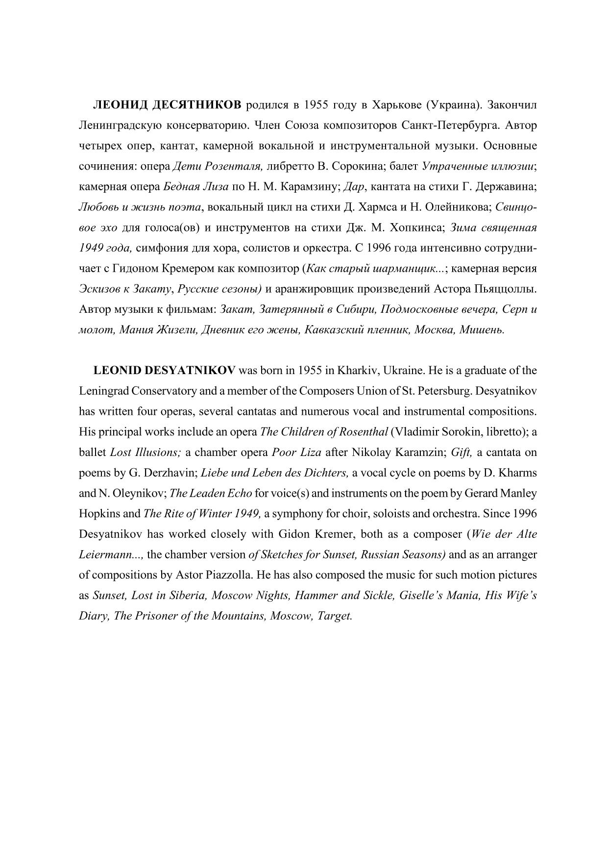 Леонид Десятников — выдающаяся фигура современного музыкального пространства, композитор, балансирующий на грани иронии и беззащитной открытости, эпатажа и затворничества, смеха и слёз. Ничто так не современно, как его музыка, насквозь «пропитанная» многовековым классическим наследием. Неизвестный природе материал, чудесный сплав несоединимого. Но победитель в этой гонке за временем лишь один — красота. Вот кто всегда укрыт за масками десятниковского балаганчика, да и как иначе уберечь эту хрупкую субстанцию в «вавилонской башне» современности.