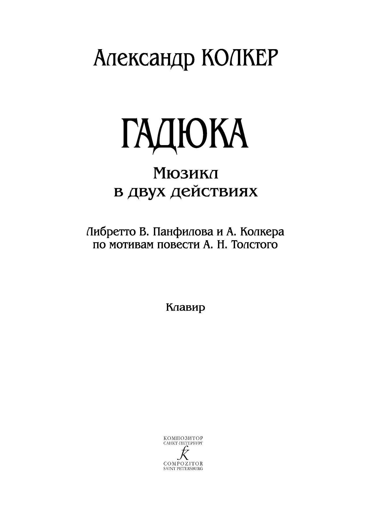 Мюзикл Александра Колкера «Гадюка» (либретто В. Панфилова и А. Колкера) на сюжет одноименной повести Алексея Николаевича Толстого был впервые поставлен в Новосибирском государственном театре музыкальной комедии 18 июня 2008 года. А в 2009-м режиссер спектакля Гали Абайдулов и дирижер Эхтибар Ахмедов стали лауреатами Национальной театральной премии «Золотая маска». Автор мюзикла тогда же был удостоен Национальной премии «Музыкальное сердце театра».