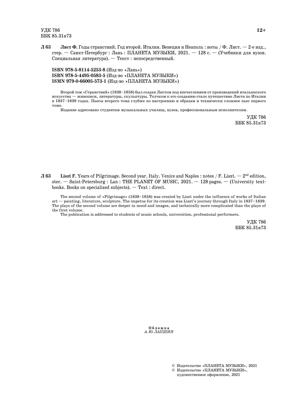 Второй том "Странствий" (1838-1858) был создан Листом под впечатлением от произведений итальянского искусства — живописи, литературы, скульптуры. Толчком к его созданию стало путешествие Листа по Италии в 1837-1839 годах. Пьесы второго тома глубже по настроению и образам и технически сложнее пьес первого тома. Издание адресовано студентам музыкальных училищ, вузов, профессиональным исполнителям.