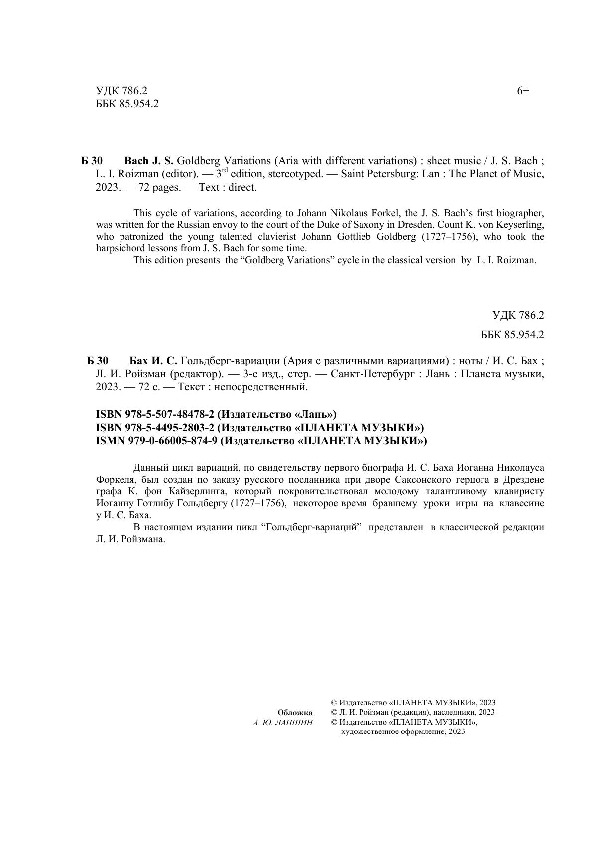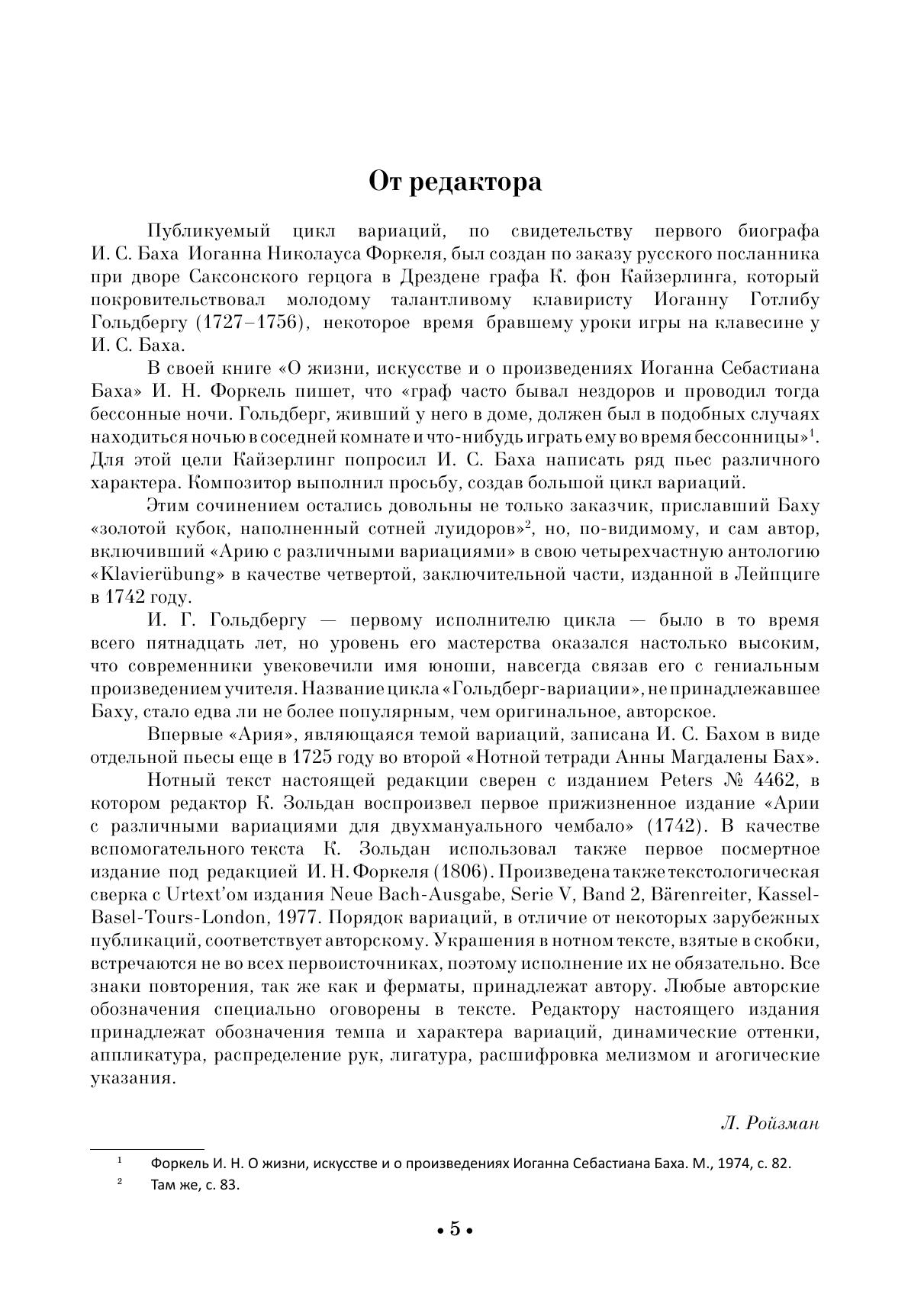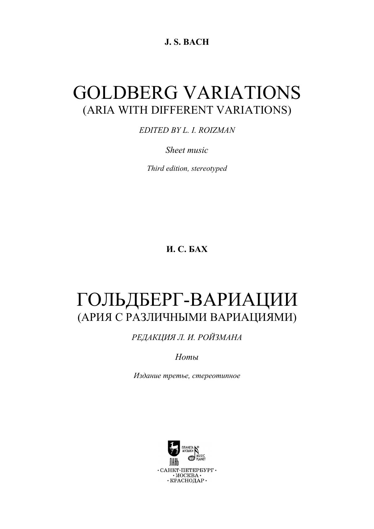 Данный цикл вариаций, по свидетельству первого биографа И. С. Баха Иоганна Николауса Форкеля, был создан по заказу русского посланника при дворе Саксонского герцога в Дрездене графа К. фон Кайзерлинга, который покровительствовал молодому талантливому клавиристу Иоганну Готлибу Гольдбергу (1727-1756), некоторое время бравшему уроки игры на клавесине у И. С. Баха. В настоящем издании цикл "Гольдберг-вариаций" представлен в классической редации Л. И. Ройзмана. This cycle of variations, according to Johann Nikolaus Forkel, the J. S. Bach’s first biographer, was written for the Russian envoy to the court of the Duke of Saxony in Dresden, Count K. von Keyserling, who patronized the young talented clavierist Johann Gottlieb Goldberg (1727–1756), who took the harpsichord lessons from J. S. Bach for some time. In this edition, the "Goldberg Variations" cycle is presented in the classical version by L. I. Roizman.
