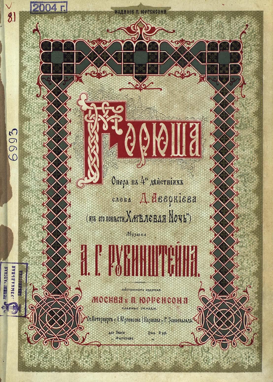 Перешедшие в общественное достояние материалы электронного фонда ЦГПБ им. В.В. Маяковского. Сведения о издательстве или типографии: изд. П. Юргенсона. Место издания: Москва