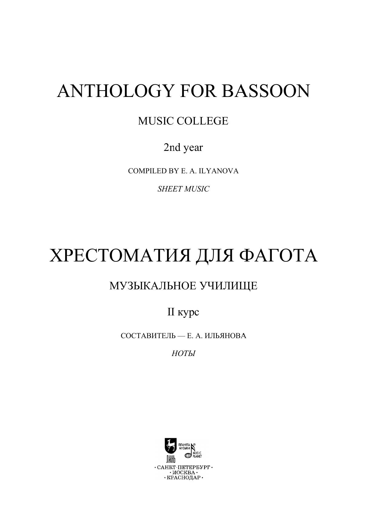 Хрестоматия содержит произведения крупной формы и пьесы. В сборник вошли сочинения, входящие в программы музыкальных училищ, а также опусы, менее популярные в педагогической практике. Издание адресовано преподавателям и студентам-фаготистам вторых курсов музыкальных училищ. The anthology consists of works of a sonata form and pieces. The collection presents works included in curriculums of music colleges as well as compositions no so widely performed by students. The edition is addressed to teachers and second-year bassoon students of music colleges.