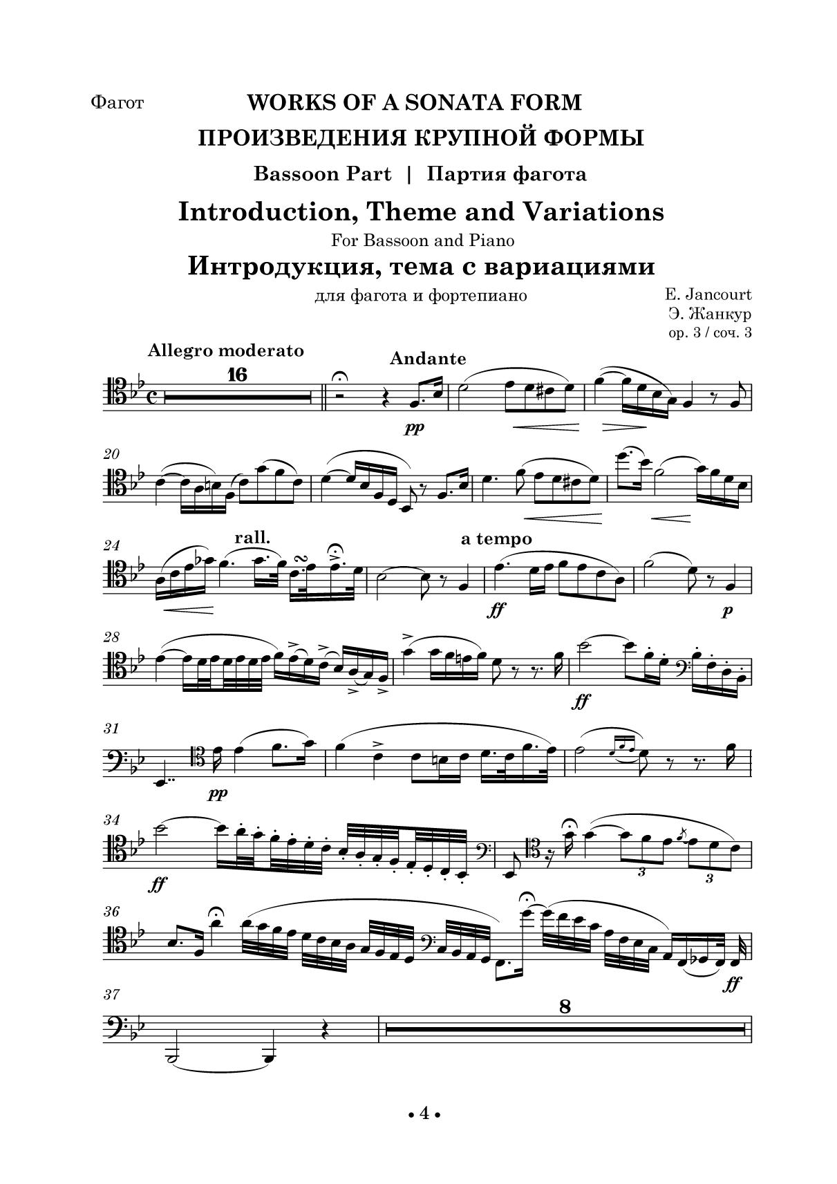 Хрестоматия содержит произведения крупной формы и пьесы. В сборник вошли сочинения, входящие в программы музыкальных училищ, а также опусы, менее популярные в педагогической практике. Издание адресовано преподавателям и студентам-фаготистам первых курсов музыкальных училищ. The anthology consists of works of a sonata form and pieces. The collection presents works included in curriculums of music colleges as well as compositions no so widely performed by students. The edition is addressed to teachers and first-year bassoon students of music colleges.
