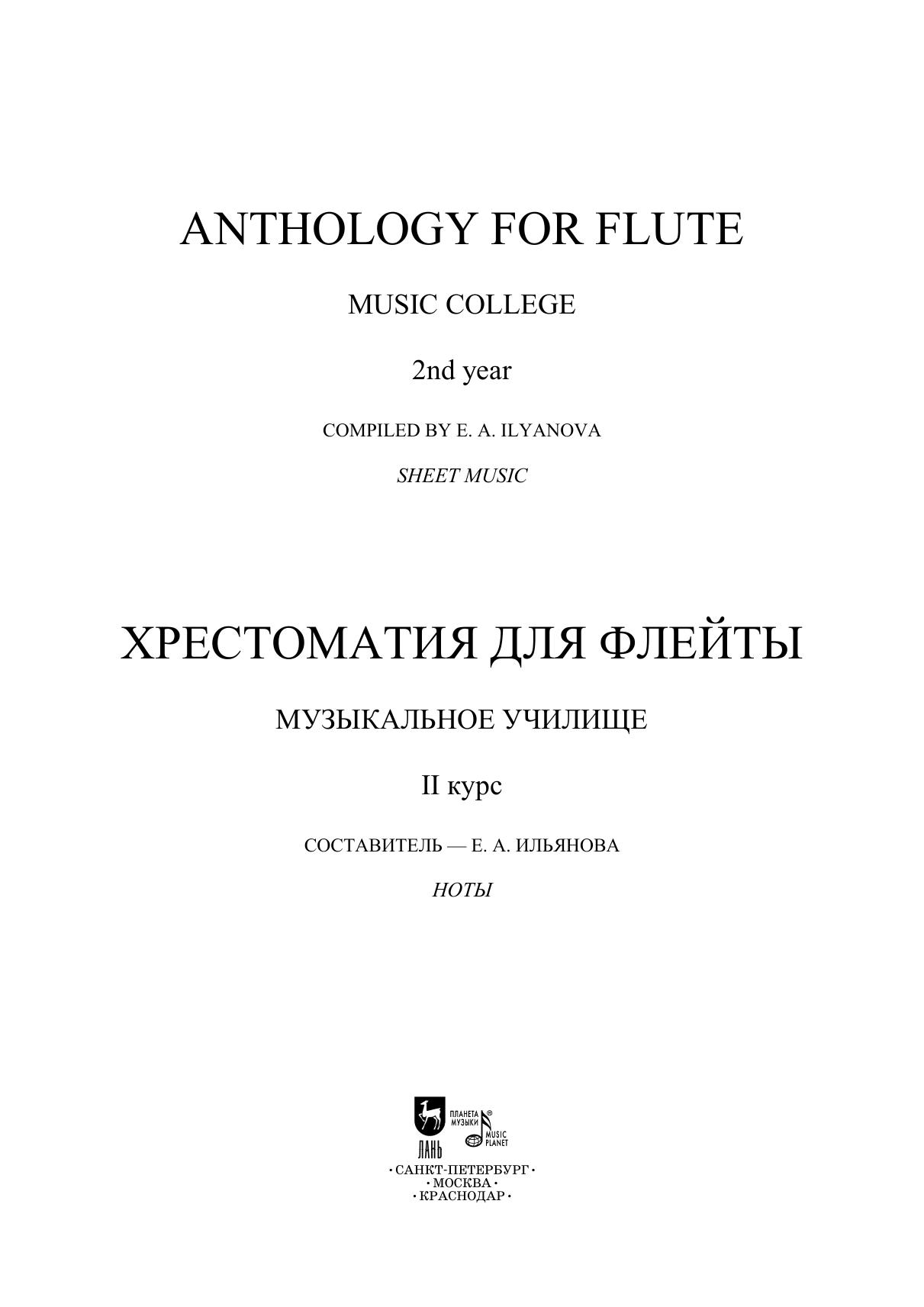 Хрестоматия для флейты составлена на основе программ российских музыкальных училищ и включает сочинения композиторов различных стилей и эпох. В сборник вошли произведения крупной формы и пьесы. Издание адресовано студентам вторых курсов и педагогам музыкальных училищ и колледжей. The anthology for flute is compiled basing on curriculums of music colleges in Russia and includes works by composers of different styles and times. The collection includes works of a sonata form and pieces. The edition is addressed to second-year students and teachers of music colleges.