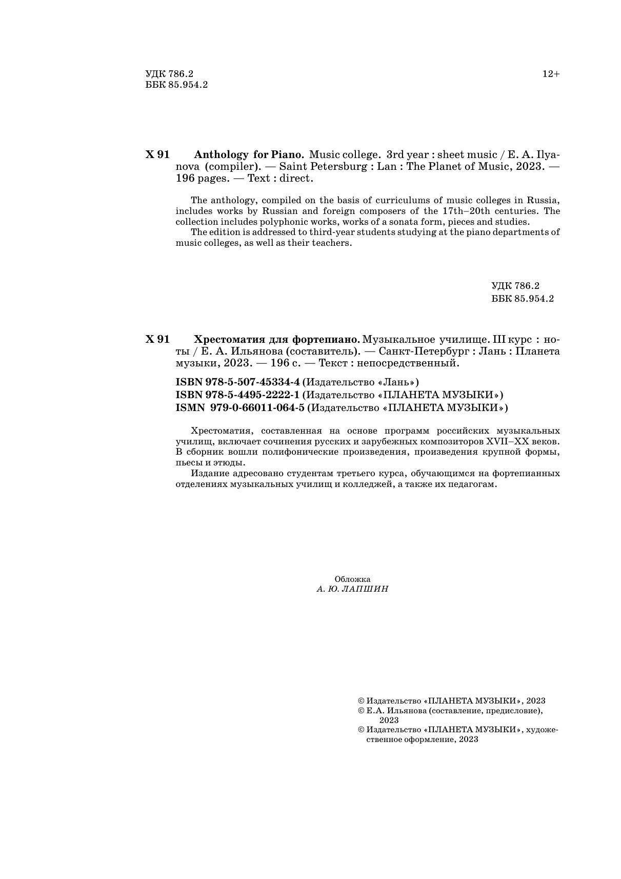 Хрестоматия, составленная на основе программ российских музыкальных училищ, включает сочинения русских и зарубежных композиторов XVII-XX веков. В сборник вошли полифонические произведения, произведения крупной формы, пьесы и этюды. Издание адресовано студентам второго курса, обучающимся на фортепианных отделениях музыкальных училищ и колледжей, а также их педагогам.