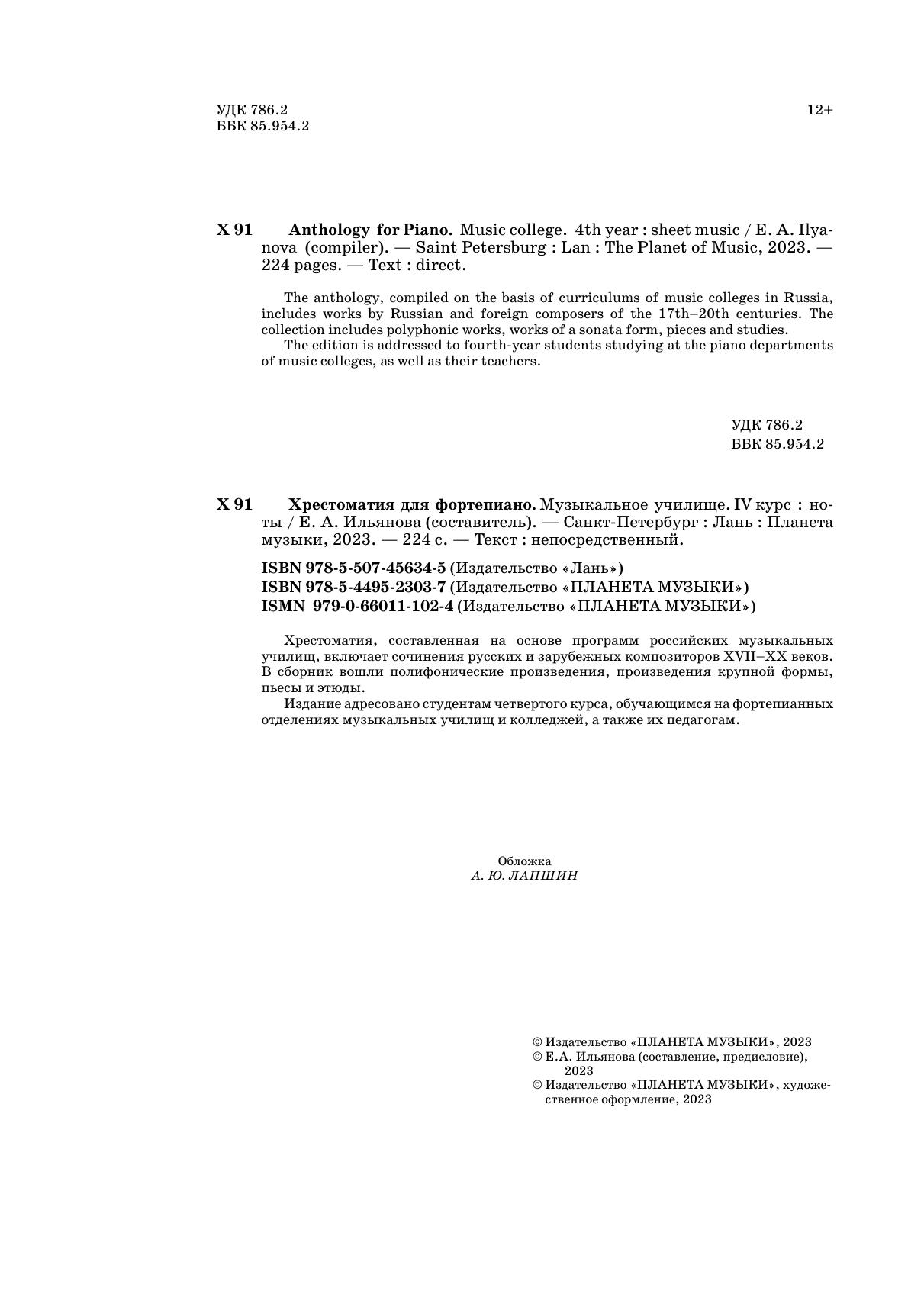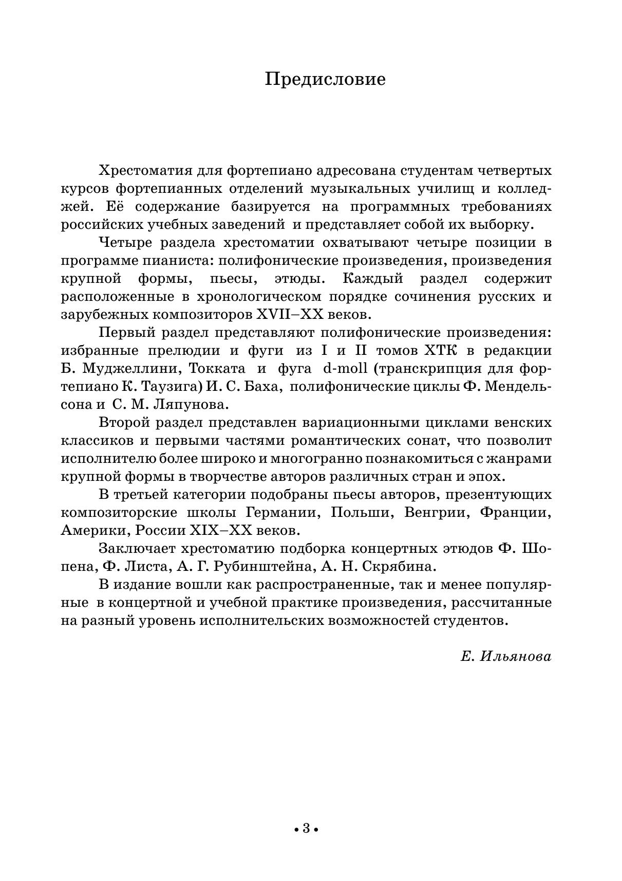 Хрестоматия, составленная на основе программ российских музыкальных училищ, включает сочинения русских и зарубежных композиторов XVII-XX веков. В сборник вошли полифонические произведения, произведения крупной формы, пьесы и этюды. Издание адресовано студентам второго курса, обучающимся на фортепианных отделениях музыкальных училищ и колледжей, а также их педагогам.