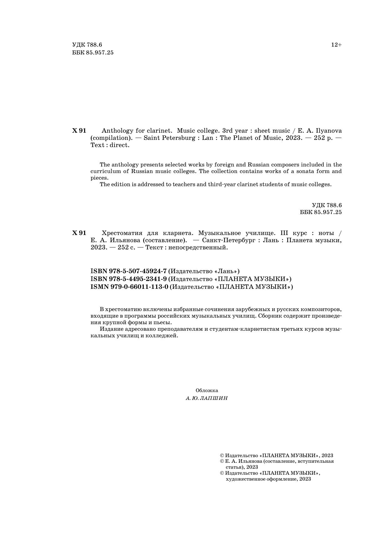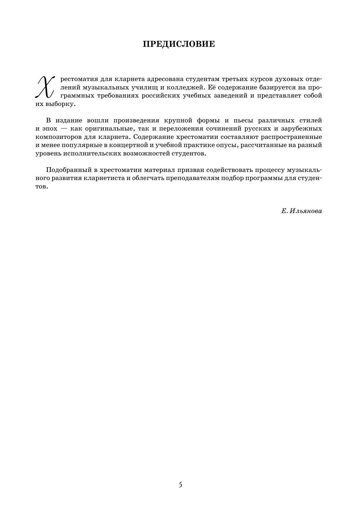 В хрестоматию включены избранные сочинения зарубежных и русских композиторов, входящие в программы российских музыкальных училищ. Сборник содержит произведения крупной формы и пьесы. Издание адресовано преподавателям и студентам-кларнетистам третьих курсов музыкальных училищ и колледжей.