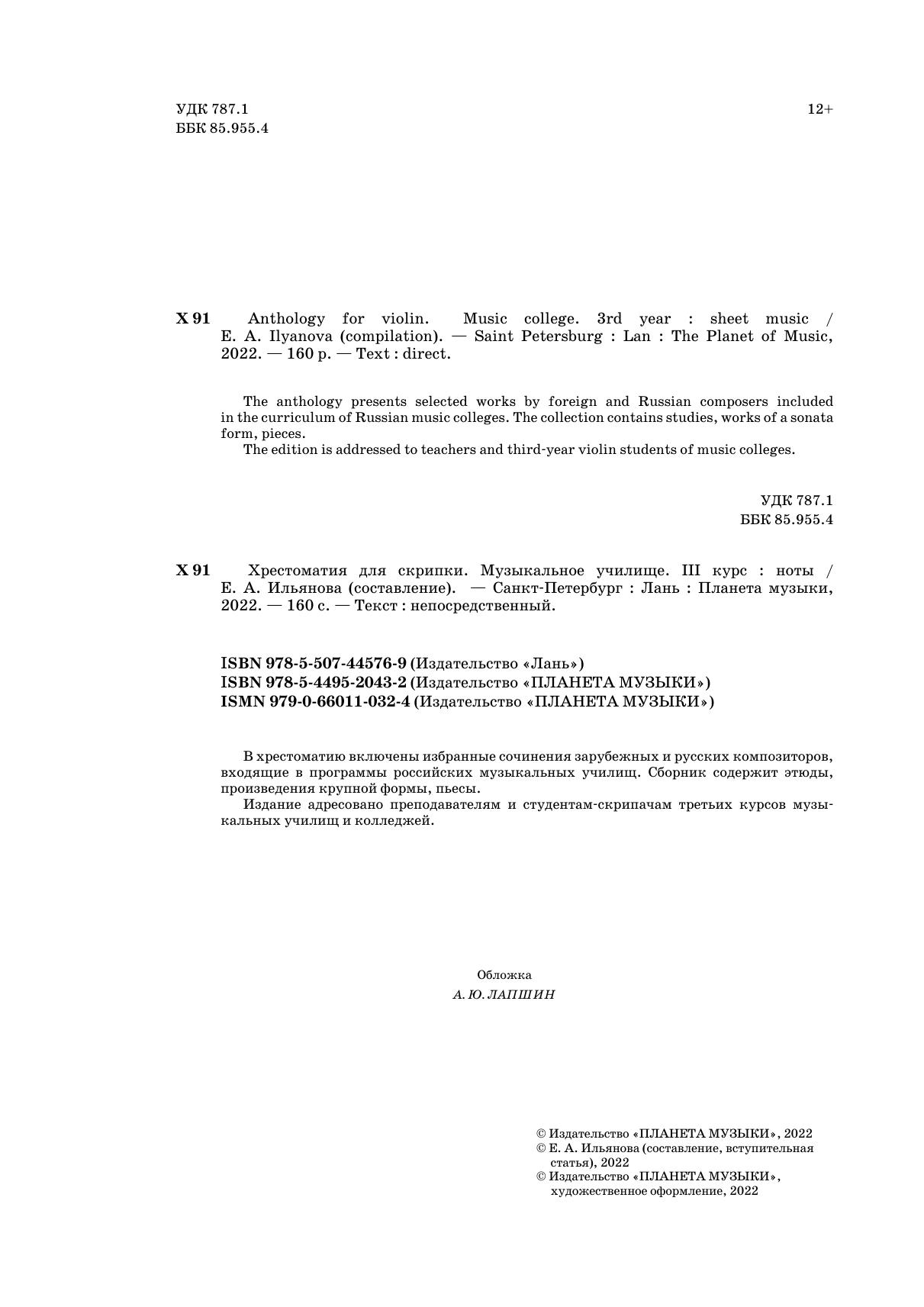 В хрестоматию включены избранные сочинения русских и зарубежных композиторов, входящие в программы музыкальных училищ. Сборник содержит этюды, произведения крупной формы, пьесы. Издание адресовано преподавателям и студентам-скрипачам вторых курсов музыкальных училищ и колледжей.