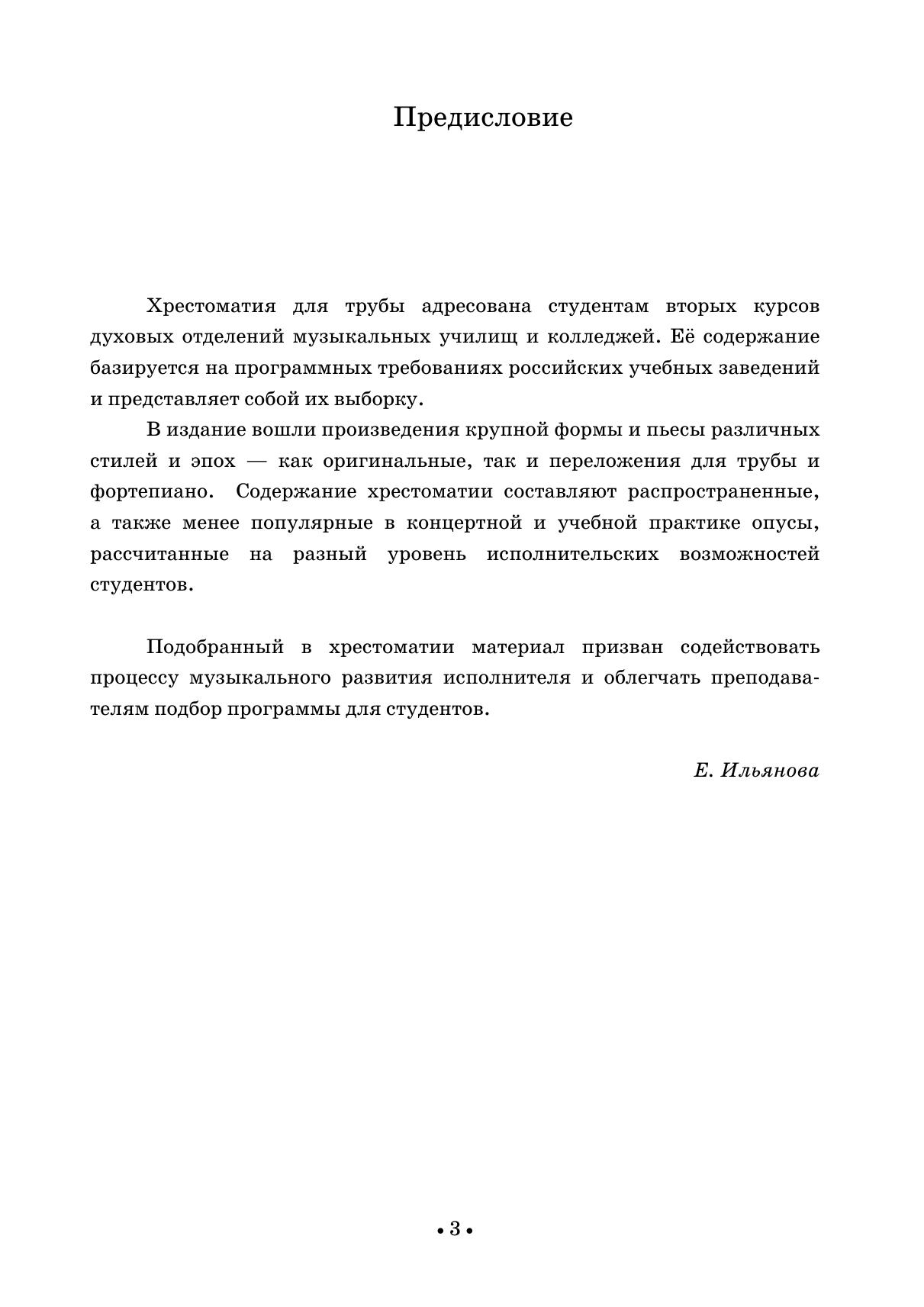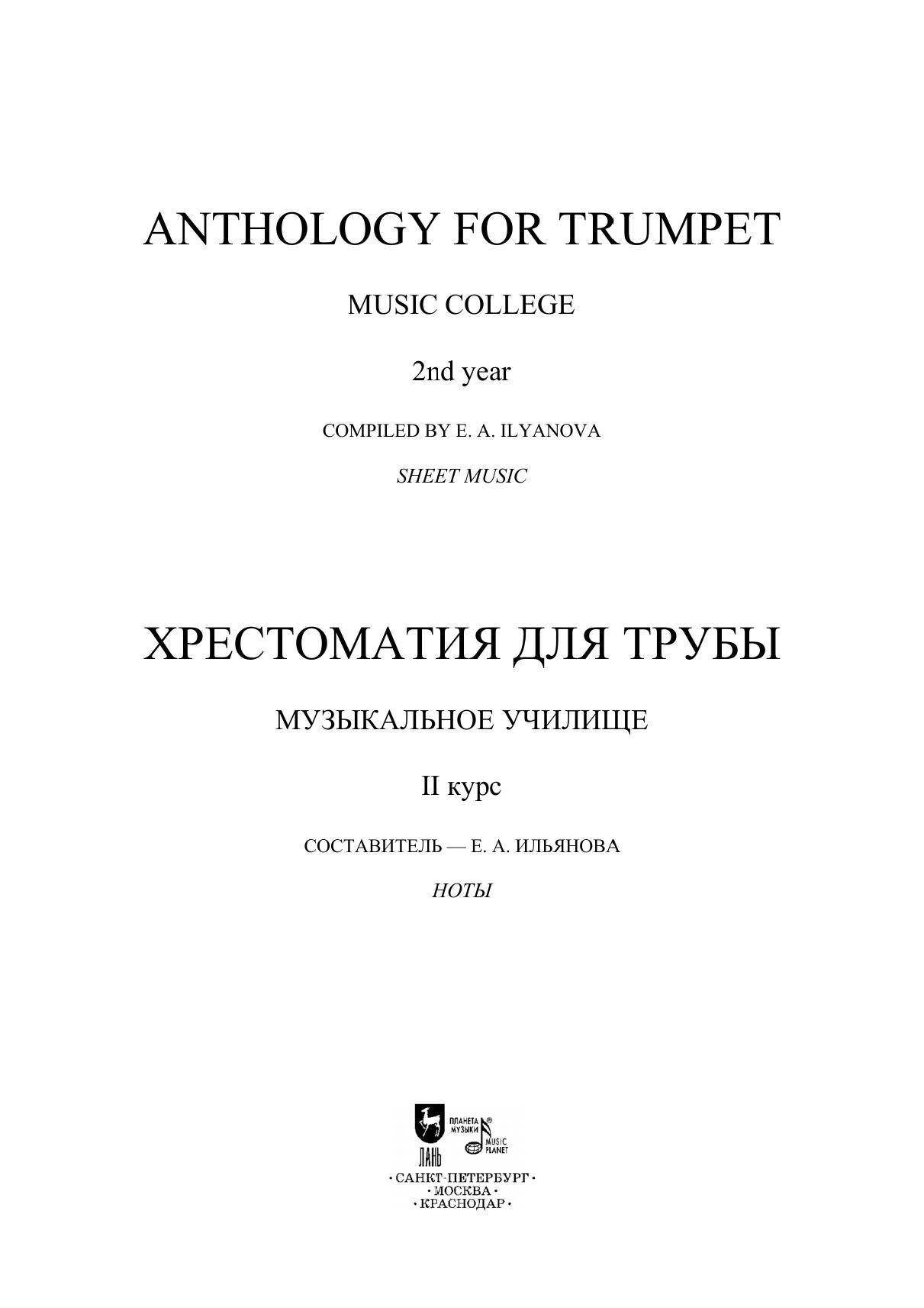 Хрестоматия содержит произведения крупной формы и пьесы. В сборник вошли сочинения, входящие в программы музыкальных училищ, а также опусы, менее популярные в педагогической практике. Издание адресовано преподавателям и студентам-трубачам вторых курсов музыкальных училищ. The anthology consists of works of a sonata form and pieces. The collection presents works included in curriculums of music colleges as well as compositions not so widely performed by students. The edition is addressed to teachers and second-year trumpet students of music colleges.