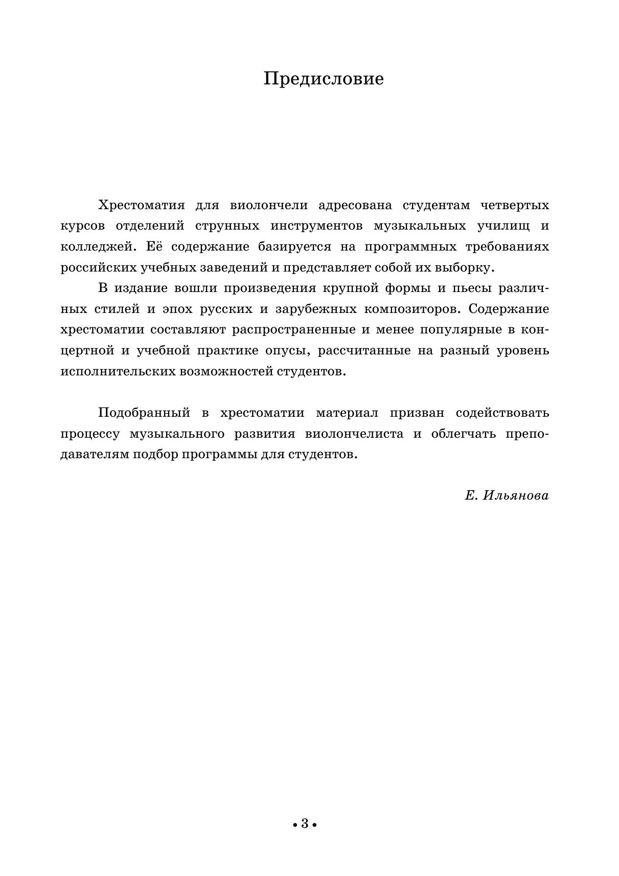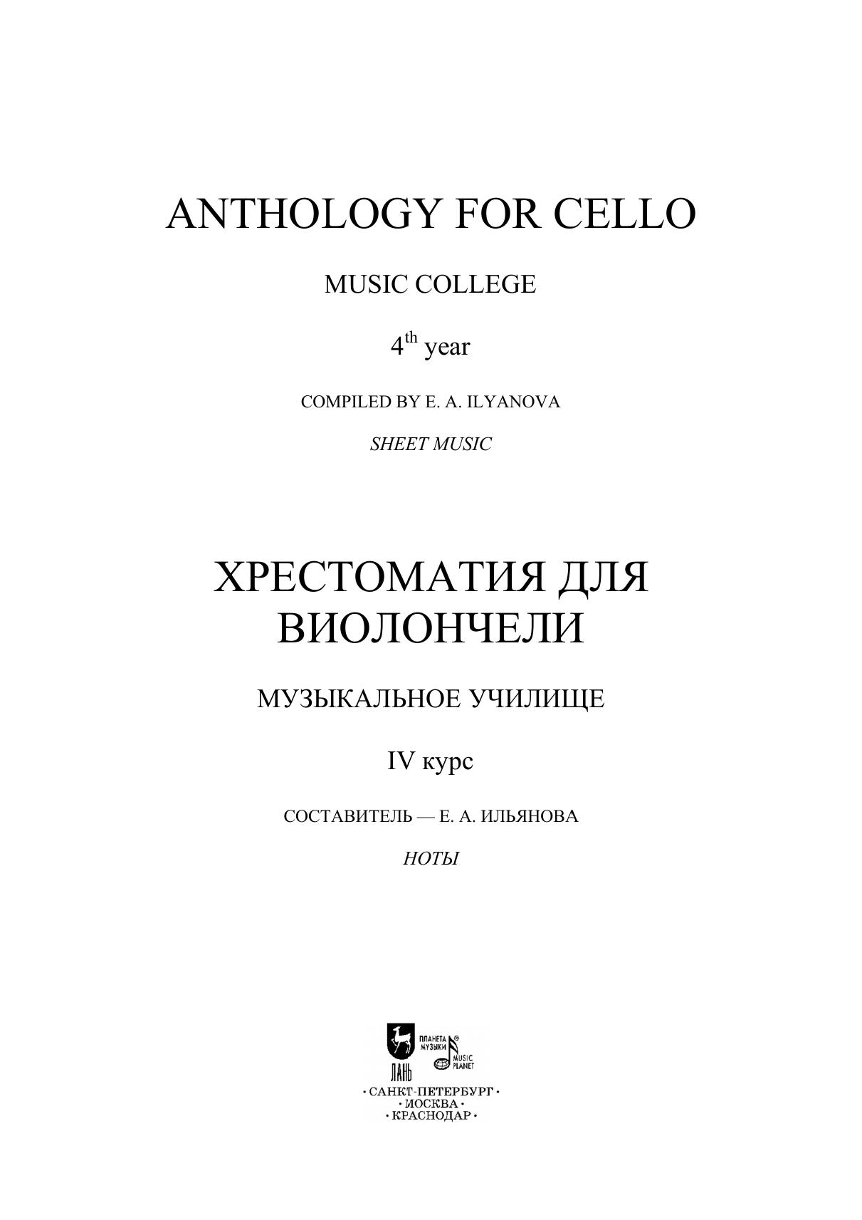 Хрестоматия содержит произведения крупной формы и пьесы. В сборник вошли сочинения, входящие в программы музыкальных училищ, а также опусы, менее популярные в педагогической практике. Издание адресовано преподавателям и студентам-виолончелистам четвертых курсов музыкальных училищ. The anthology consists of works of a sonata form and pieces. The collection presents works included in curriculums of music colleges as well as compositions not so widely performed by students. The edition is addressed to teachers and fourth-year cello students of music colleges.