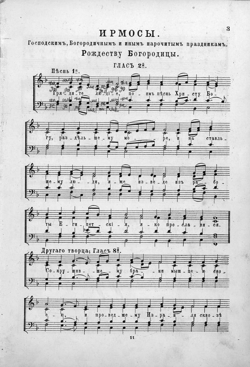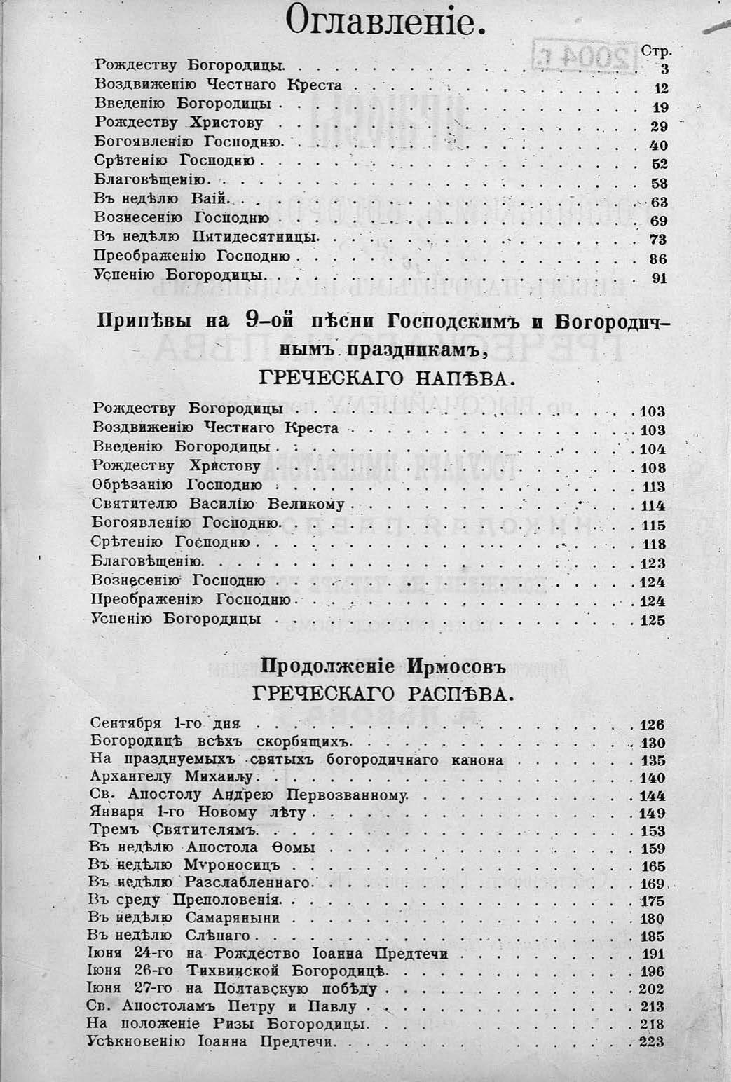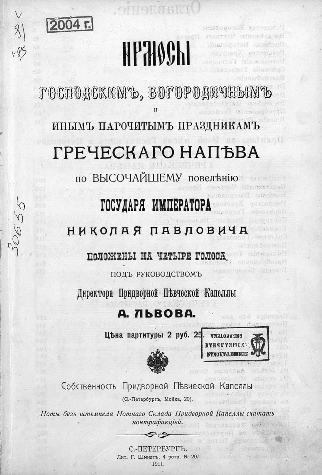 Ирмосы господским, богородичным и иным нарочитым праздникам Греческого напева... положены на четыре голоса под руководством директора Придворной Певческой Капеллы А. Львова