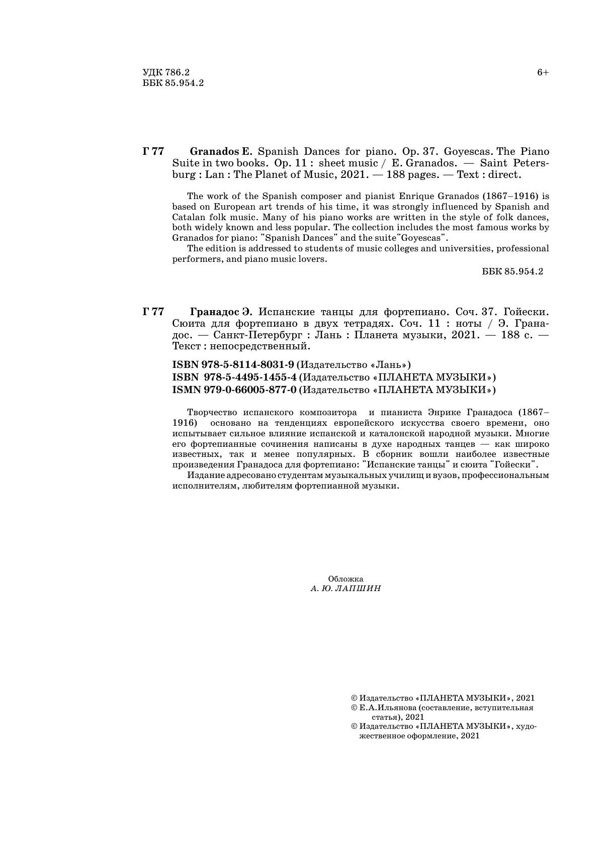 The work of the Spanish composer and pianist Enrique Granados (1867–1916) is based on European art trends of his time, it was strongly influenced by Spanish and Catalan folk music. Many of his piano works are written in the style of folk dances, both widely known and less popular. The collection includes the most famous works by Granados for piano: "Spanish Dances" and the suite"Goyescas".
