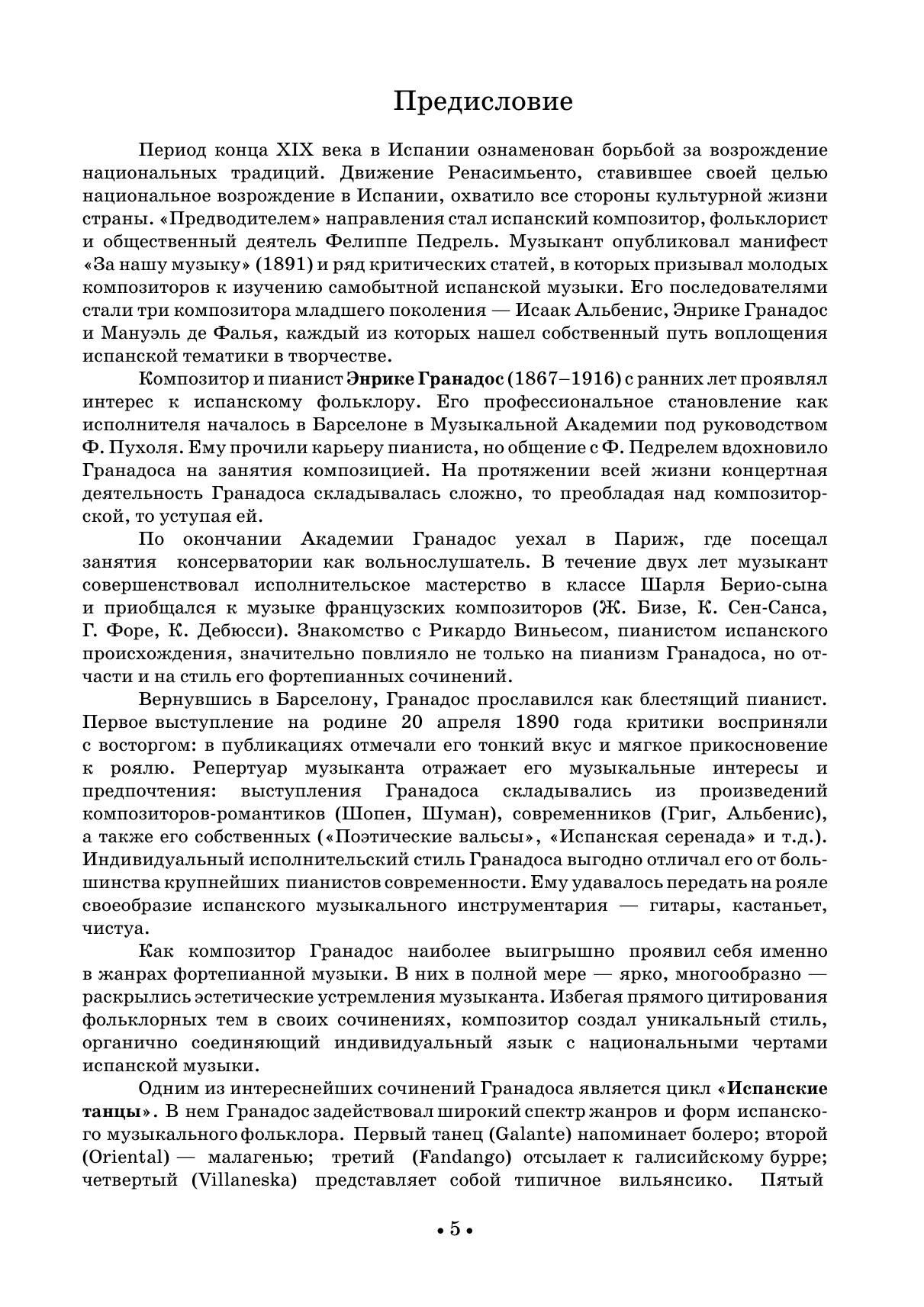 Творчество испанского композитора и пианиста Энрике Гранадоса (1867-1916) основано на тенденциях европейского искусства своего времени, оно испытывает сильное влияние испанской и каталонской народной музыки. Многие его фортепианные сочинения написаны в духе народных танцев — как широко известных, так и менее популярных. В сборник вошли наиболее известные произведения Гранадоса для фортепиано: "Испанские танцы" и сюита "Гойески". Издание адресовано студентам музыкальных училищ и вузов, профессиональным исполнителям, любителям фортепианной музыки.