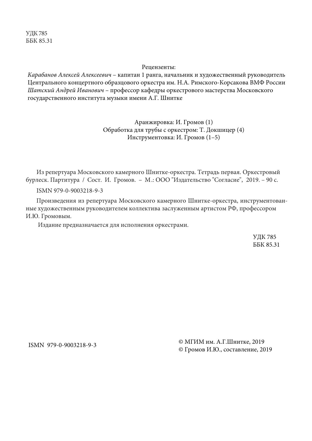 Произведения из репертуара Московского камерного Шнитке-оркестра, инструментованные художественным руководителем коллектива заслуженным артистом РФ, профессором И.Ю. Громовым. Издание предназначается для исполнения оркестрами.