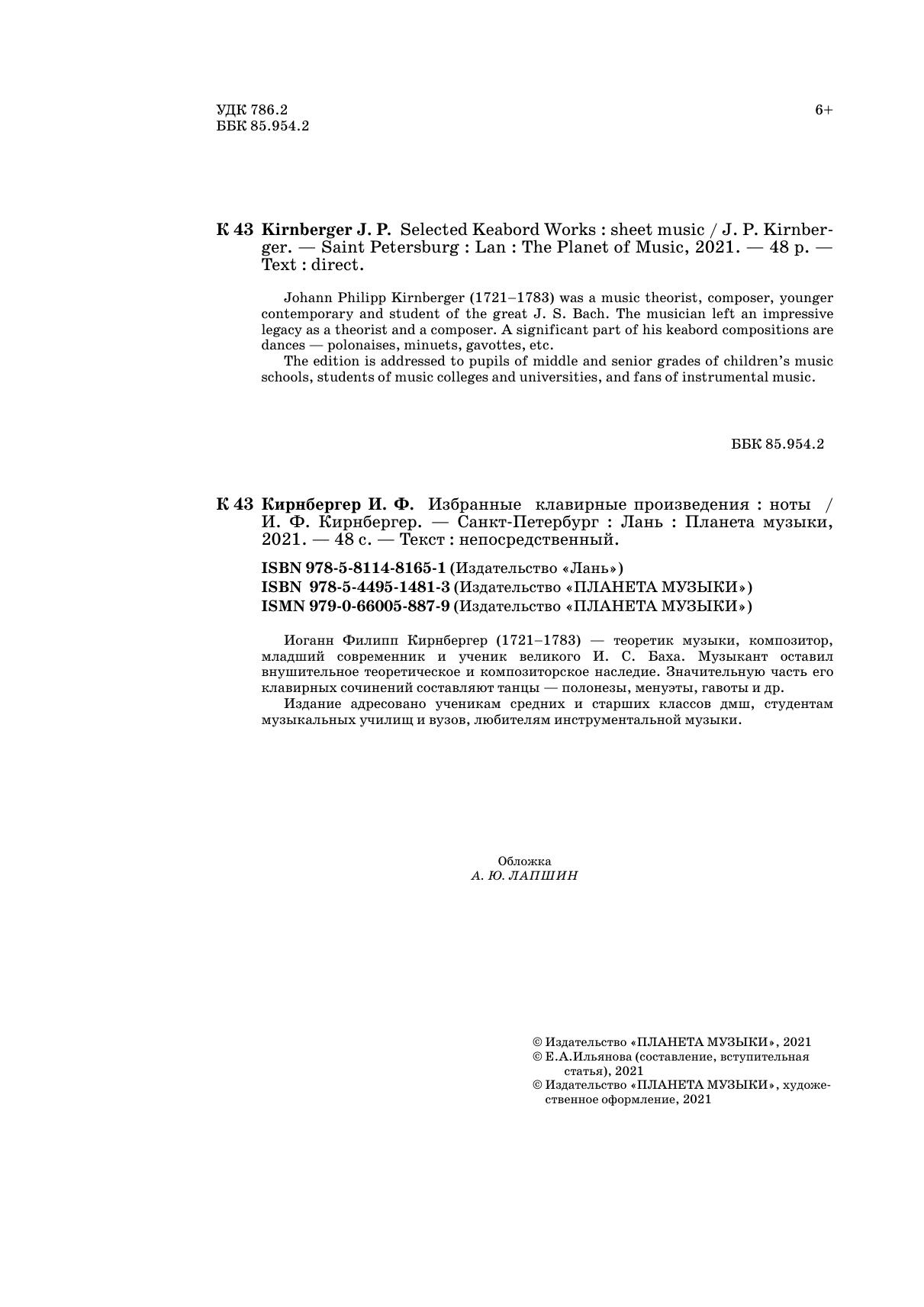 Иоганн Филипп Кирнбергер (1721-1783) — теоретик музыки, композитор, младший современник и ученик великого И. С. Баха. Музыкант оставил внушительное теоретическое и композиторское наследие. Значительную часть его клавирных сочинений составляют танцы — полонезы, менуэты, гавоты и др. Издание адресовано ученикам средних и старших классов дмш, студентам музыкальных училищ и вузов, любителям инструментальной музыки.