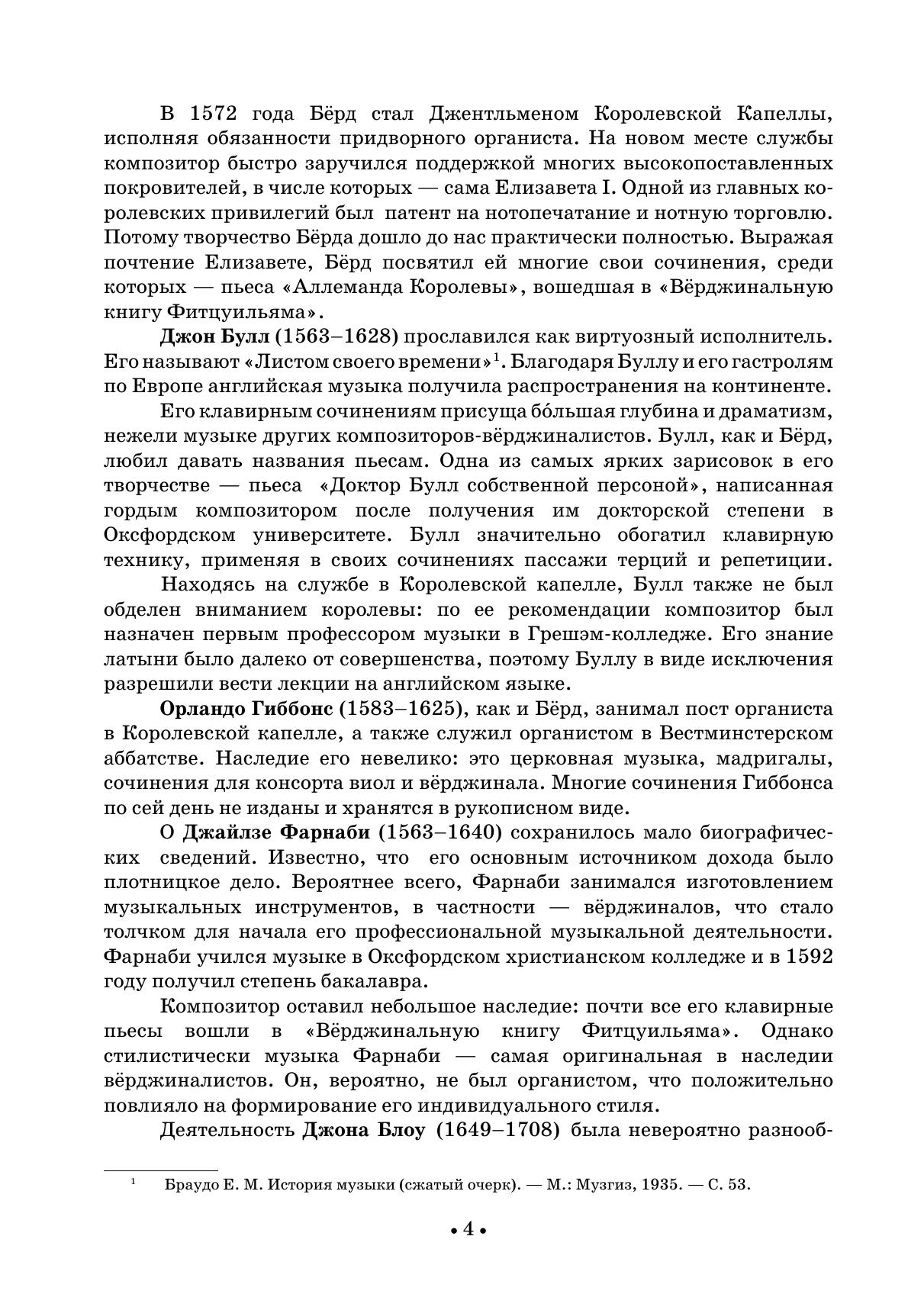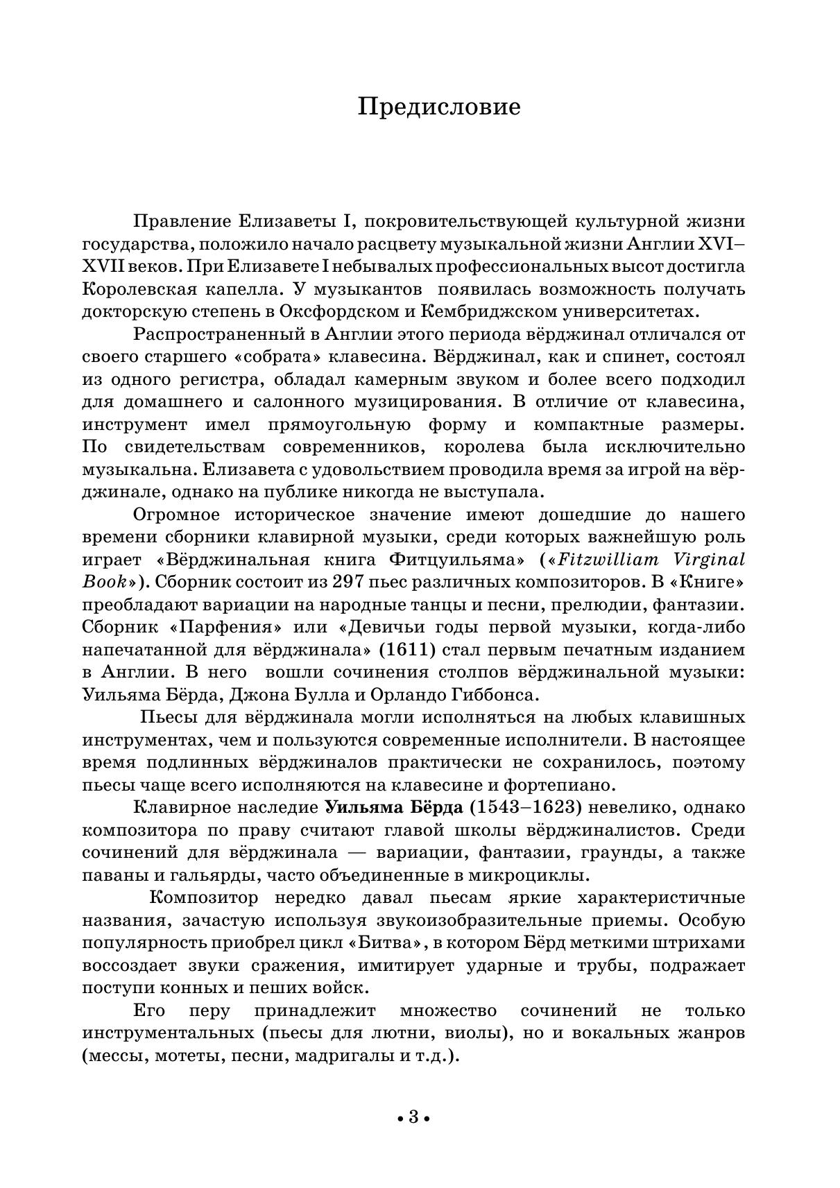 Задача настоящего сборника — дать общее представление об английском вёрджинальном искусстве и композиторах, к нему относящихся. В издание вошли пьесы У. Берда, Дж. Булла, О. Гиббонса, Дж, Блоу, Дж. Фарнеби, Г. Перселла. Сборник адресовано широкому кругу музыкантов и любителей инструментального исполнительства.