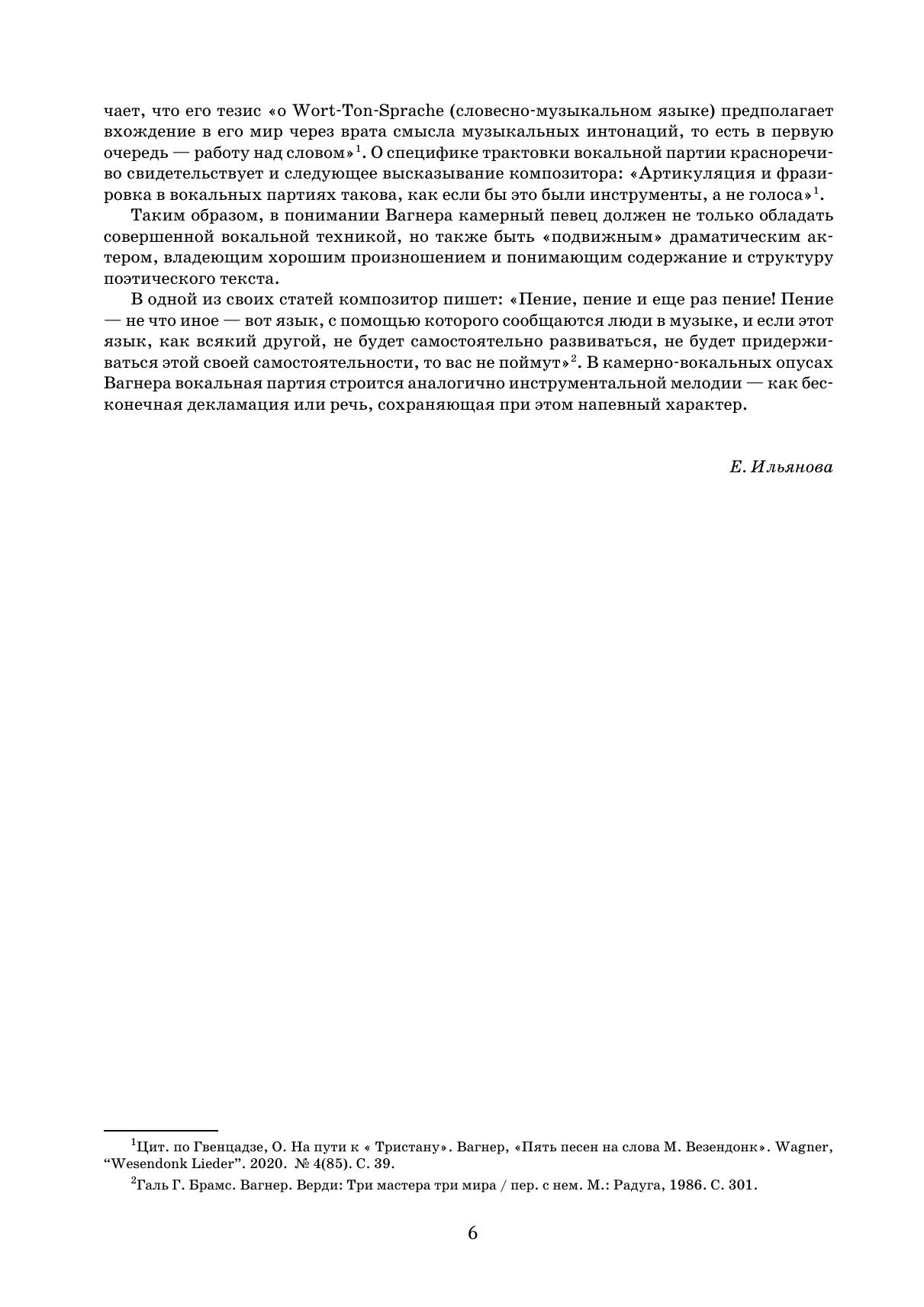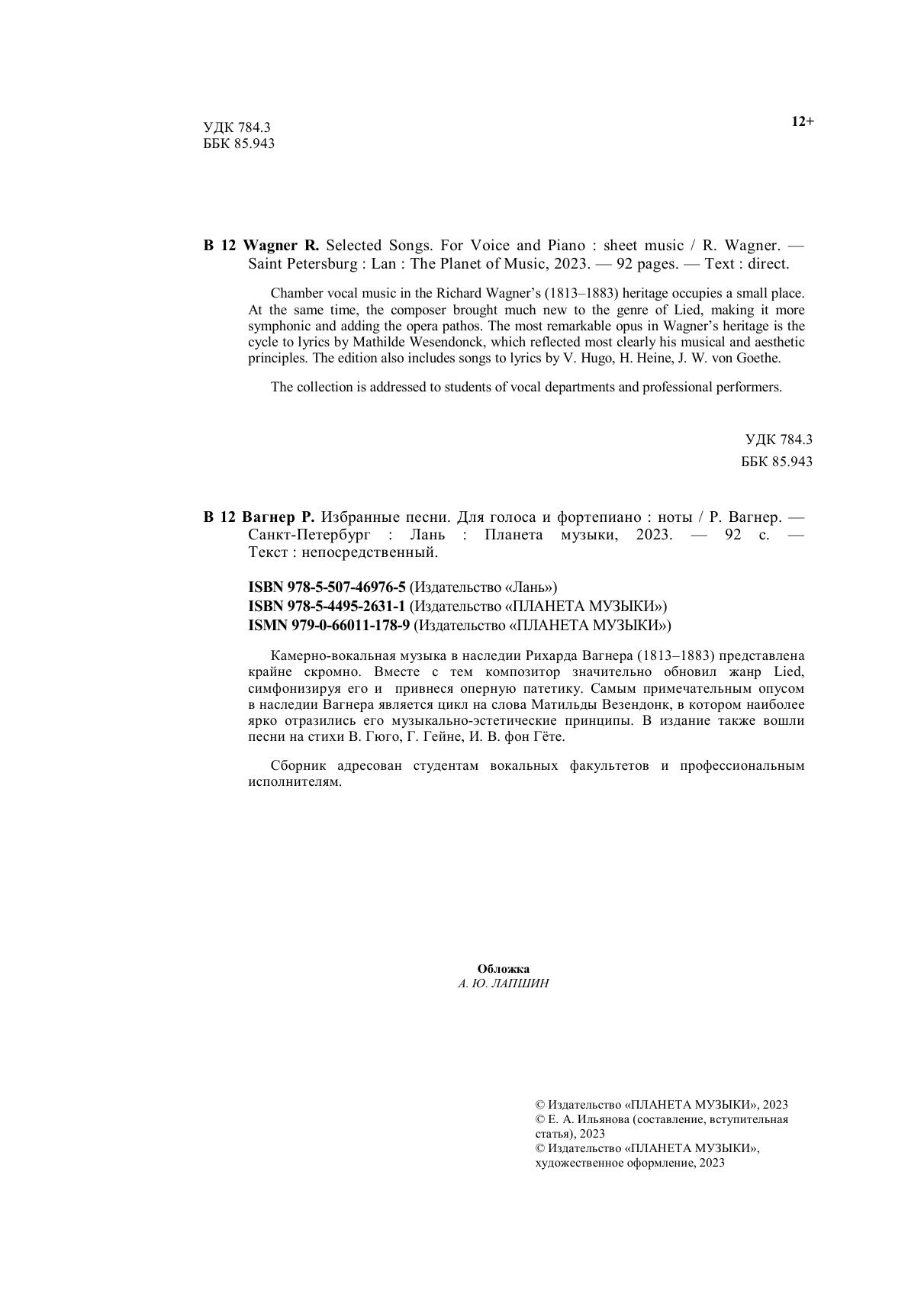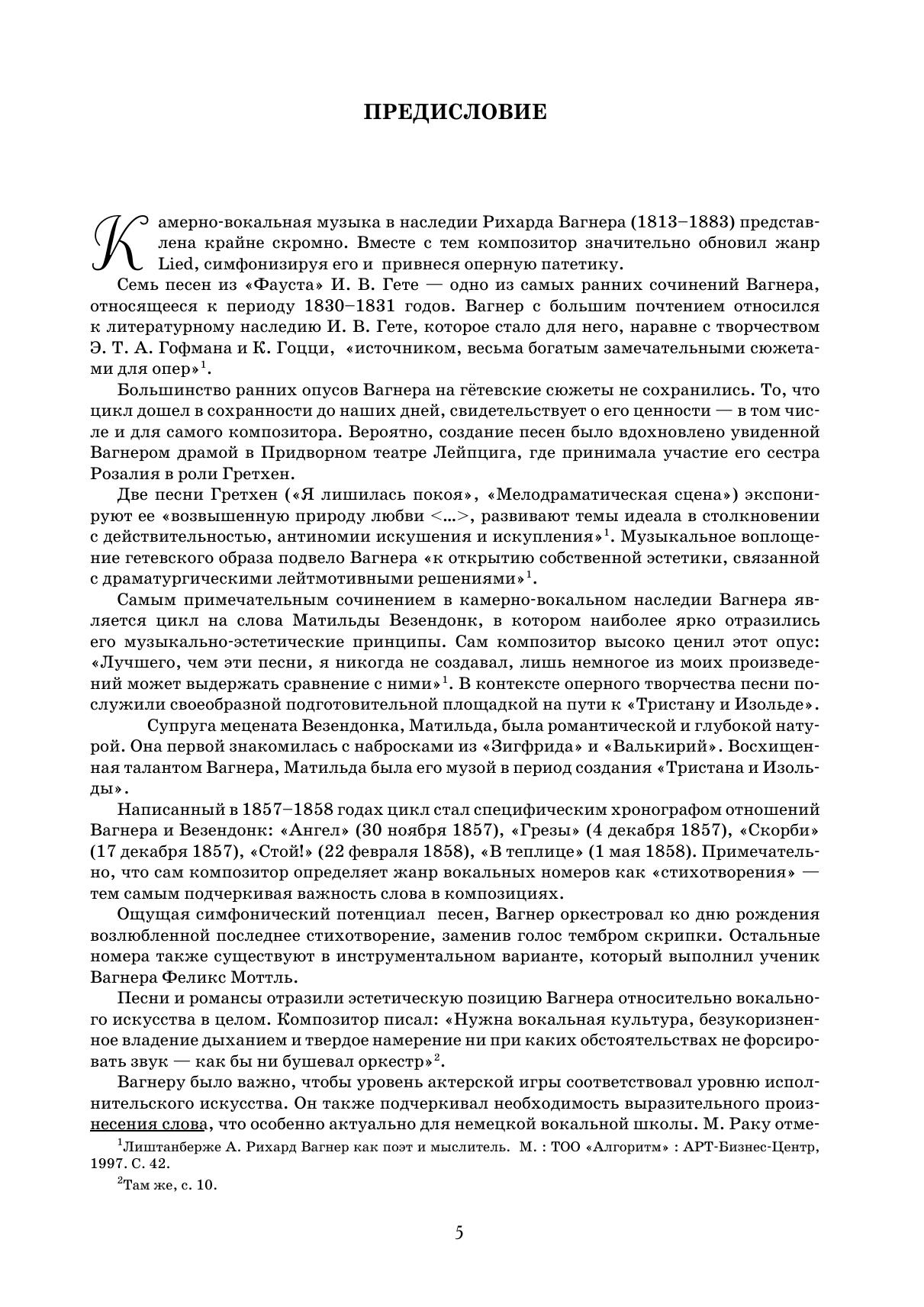 Камерно-вокальная музыка в наследии Рихарда Вагнера (1813-1883) представлена крайне скромно. Вместе с тем композитор значительно обновил жанр Lied, симфонизируя его и привнеся оперную патетику. Самым примечательным опусом в наследии Вагнера является цикл на слова Матильды Везендонк, в котором наиболее ярко отразились его музыкально-эстетические принципы. В издание также вошли песни на стихи В. Гюго, Г. Гейне, И. В. фон Гёте. Сборник адресован студентам вокальных факультетов и профессиональным исполнителям. Chamber vocal music in the Richard Wagner’s (1813–1883) heritage occupies a small place. At the same time, the composer brought much new to the genre of Lied, making it more symphonic and adding the opera pathos. The most remarkable opus in Wagner’s heritage is the cycle to lyrics by Mathilde Wesendonck, which reflected most clearly his musical and aesthetic principles. The edition also includes songs to lyrics by V. Hugo, H. Heine, J. W. von Goethe. The collection is addressed to students of vocal departments and professional performers.