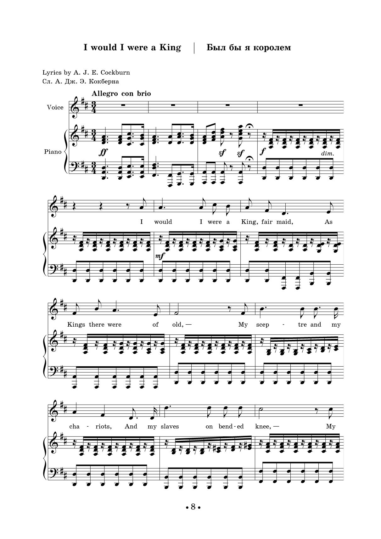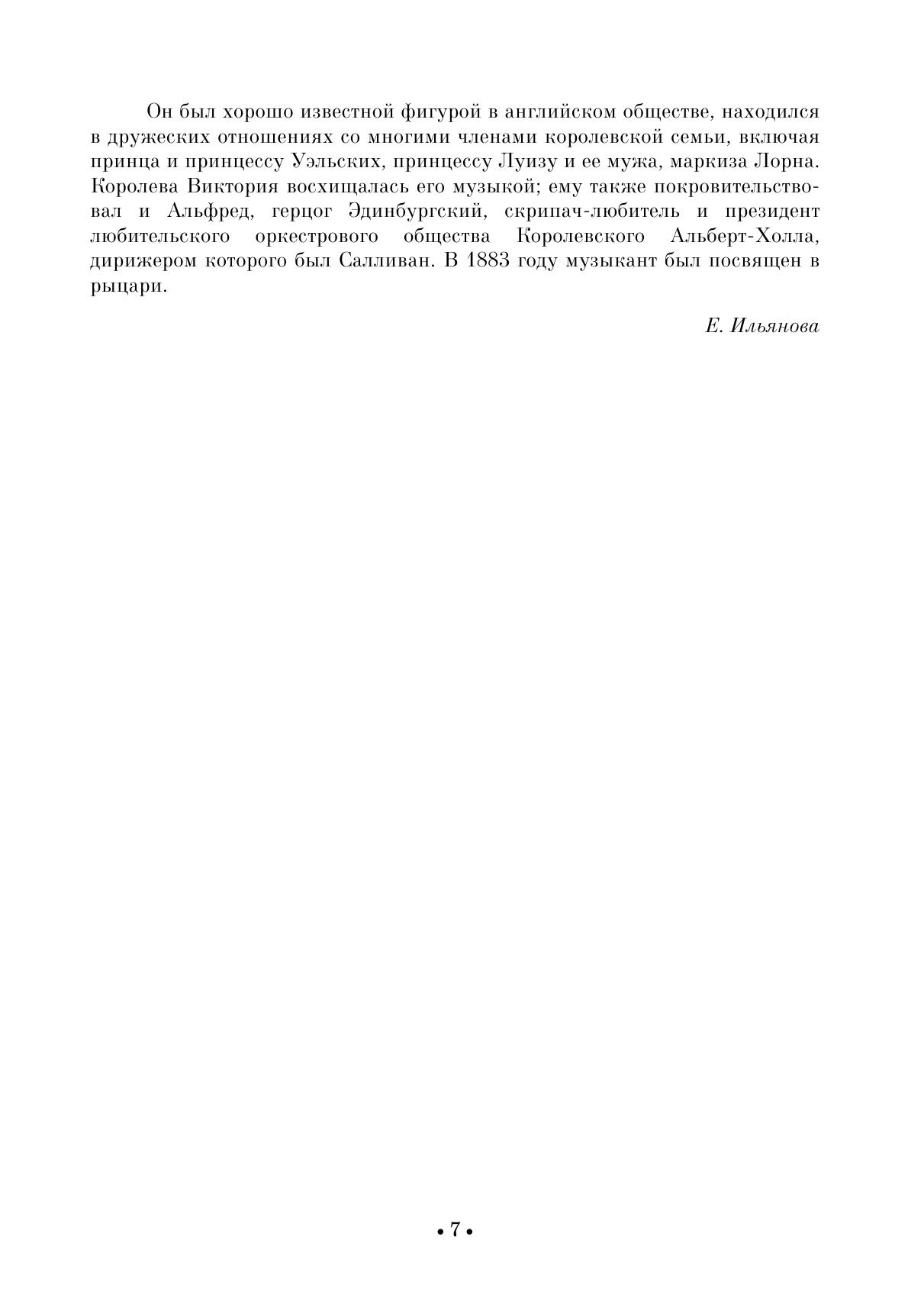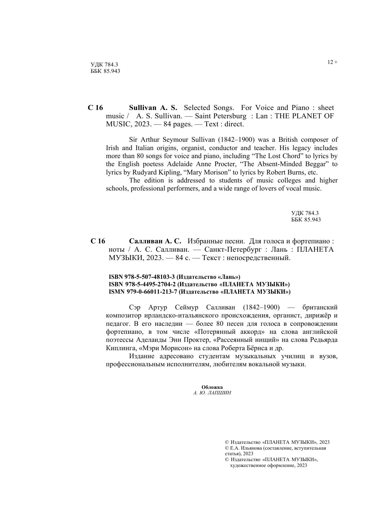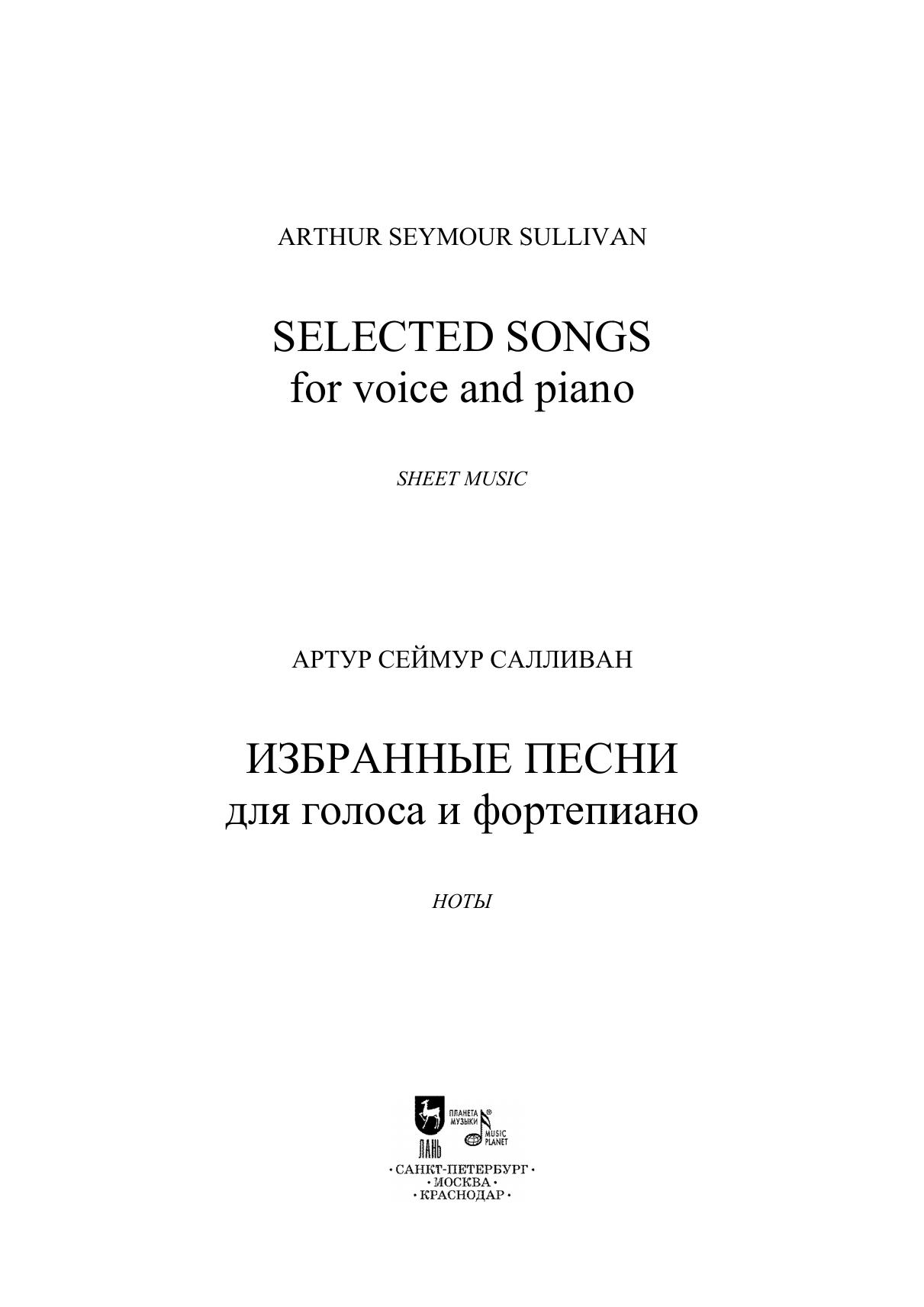 Сэр Артур Сеймур Салливан — британский композитор ирландско-итальянского происхождения, органист, дирижёр и педагог. В его наследии — более 80 песен для голоса в сопровождении фортепиано, в том числе «Потерянный аккорд» на слова английской поэтессы Аделаиды Энн Проктер, «Рассеянный нищий» на слова Редьярда Киплинга, «Мэри Морисон» на слова Роберта Бёрнса и др. Издание адресовано студентам музыкальных училищ и вузов, профессиональным исполнителям, любителям вокальной музыки. Sir Arthur Seymour Sullivan (1842–1900) was a British composer of Irish and Italian origins, organist, conductor and teacher. His legacy includes more than 80 songs for voice and piano, including “The Lost Chord” to lyrics by the English poetess Adelaide Anne Procter, “The Absent-Minded Beggar” to lyrics by Rudyard Kipling, “Mary Morison” to lyrics by Robert Burns, etc. The edition is addressed to students of music colleges and higher schools, professional performers, and a wide range of lovers of vocal music.