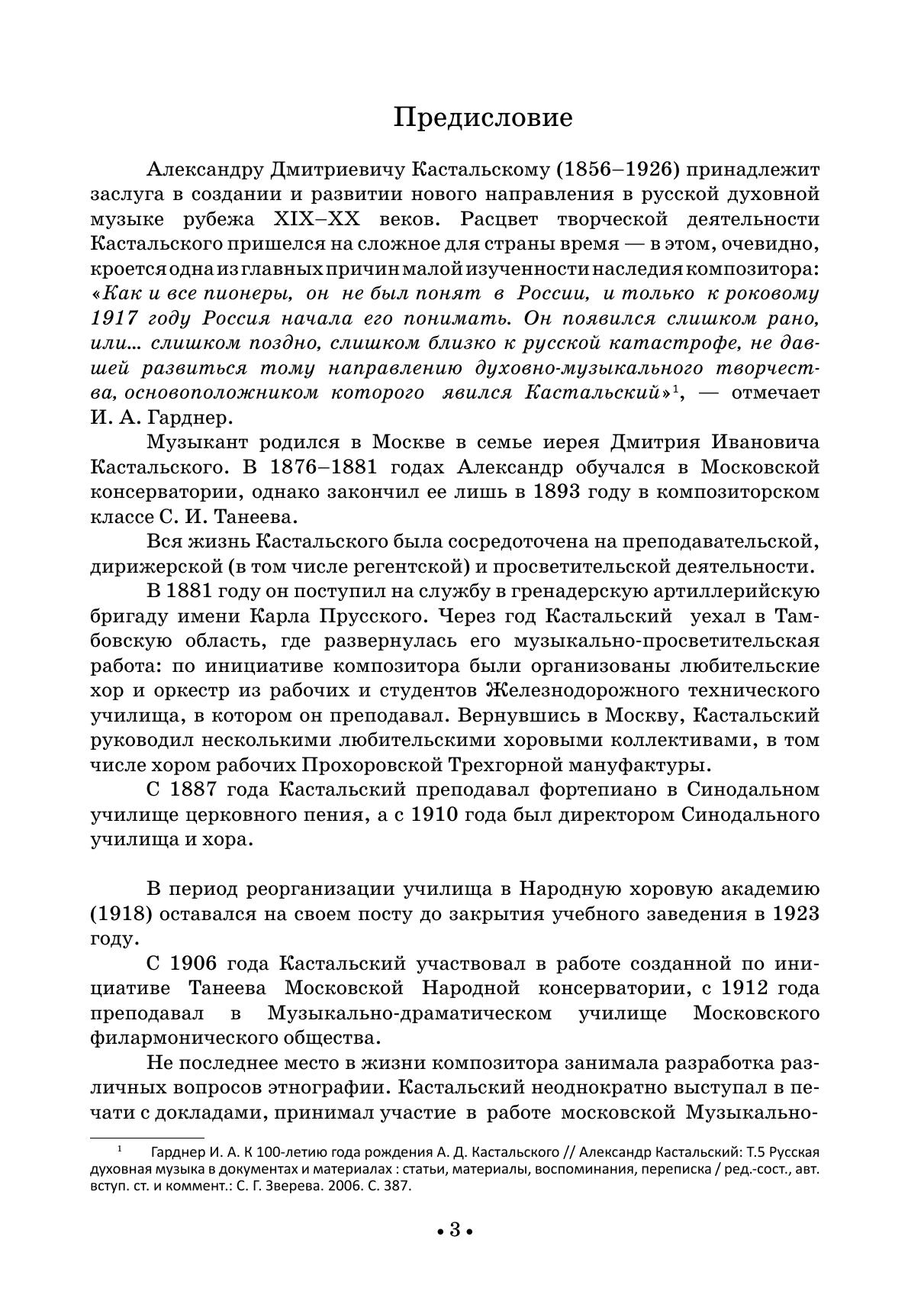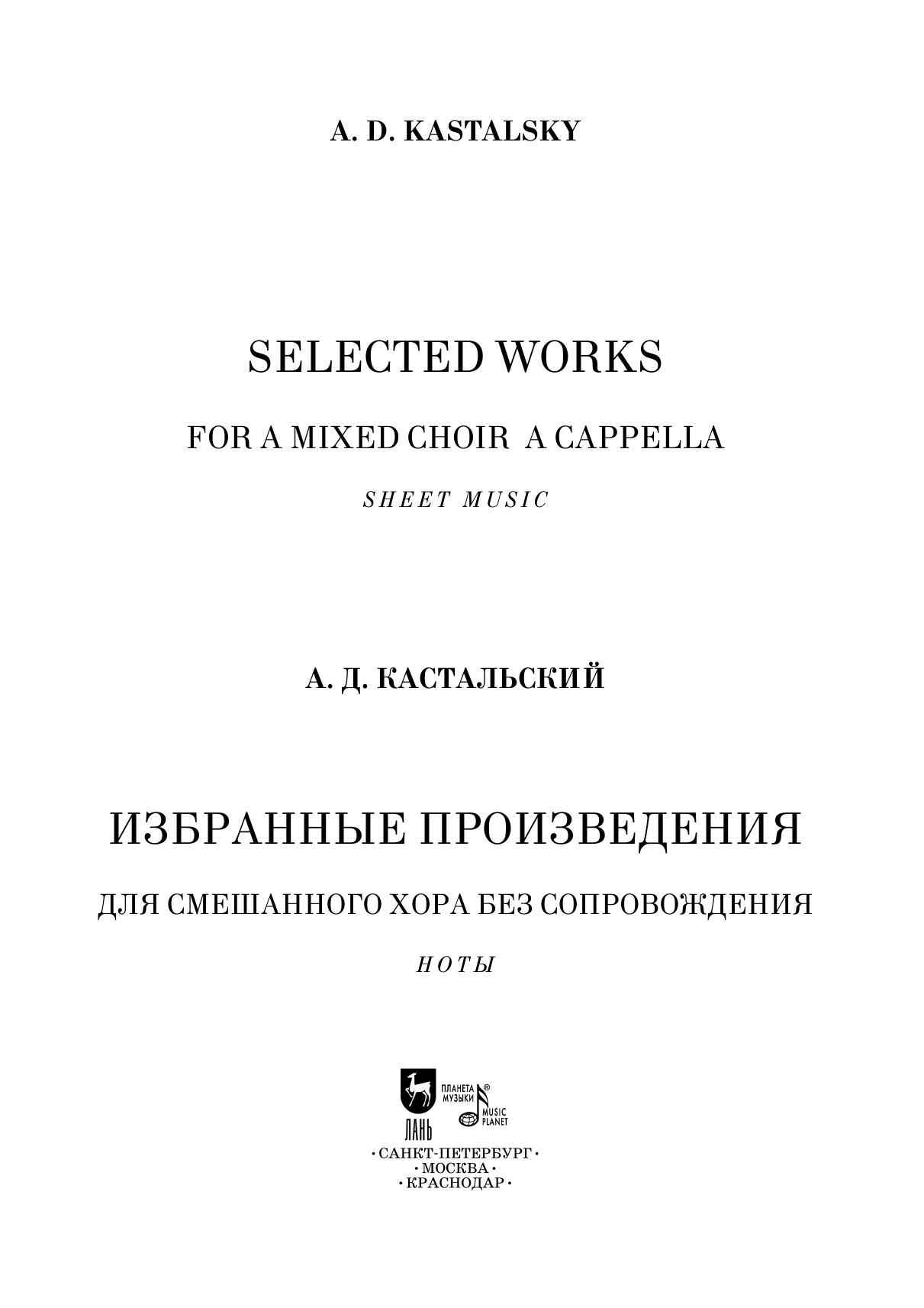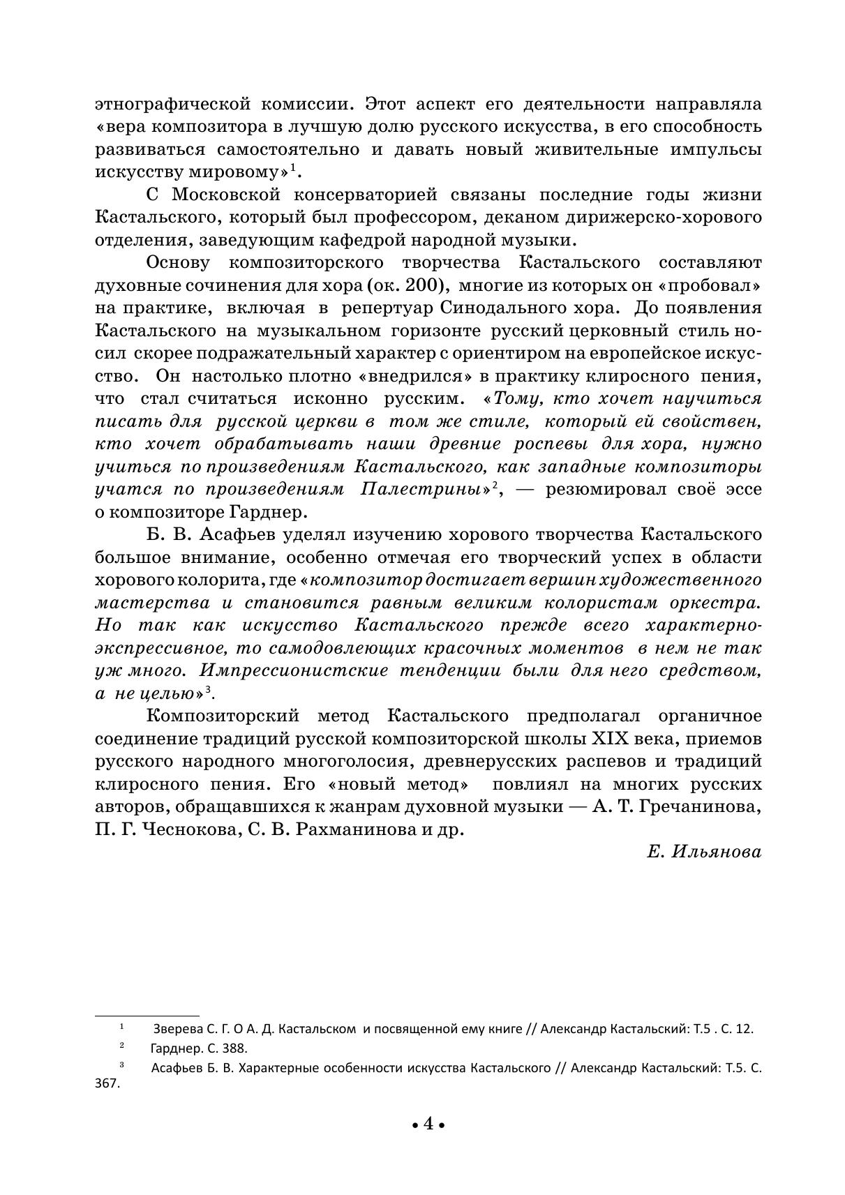 Александру Дмитриевичу Кастальскому (1856-1926) принадлежит заслуга в создании и развитии «нового направления» в русской духовной музыке рубежа XIX-XX веков. Композиторский метод Кастальского предполагал органичное соединение традиций русской композиторской школы XIX века, приемов народного многоголосия, древнерусских распевов и традиций клиросного пения. В настоящий сборник вошли избранные песнопения из Всенощного бдения и Божественной литургии, обработки народных песен, произведения на стихи русских поэтов.