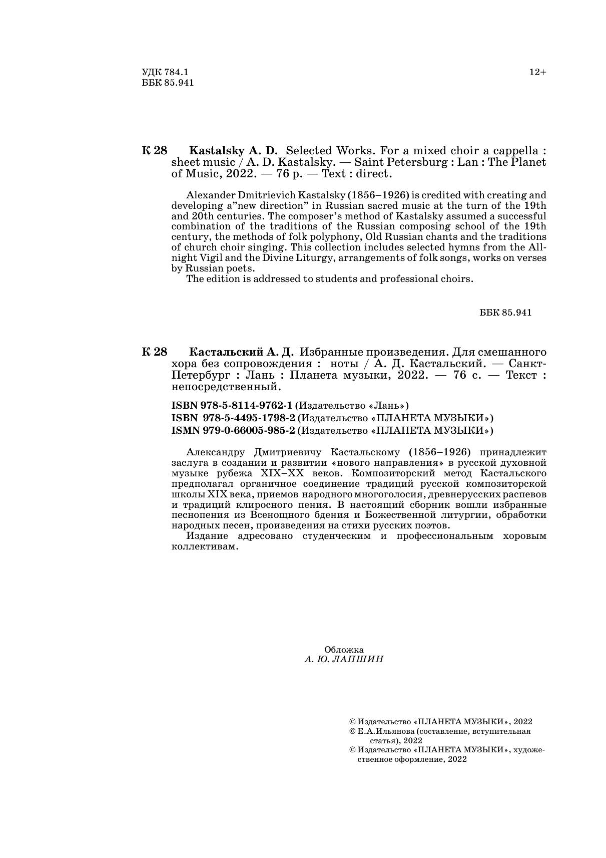 Alexander Dmitrievich Kastalsky (1856–1926) is credited with creating and developing a”new direction” in Russian sacred music at the turn of the 19th and 20th centuries. The composer’s method of Kastalsky assumed a successful combination of the traditions of the Russian composing school of the 19th century, the methods of folk polyphony, Old Russian chants and the traditions of church choir singing. This collection includes selected hymns from the All-night Vigil and the Divine Liturgy, arrangements of folk songs, works on verses by Russian poets.