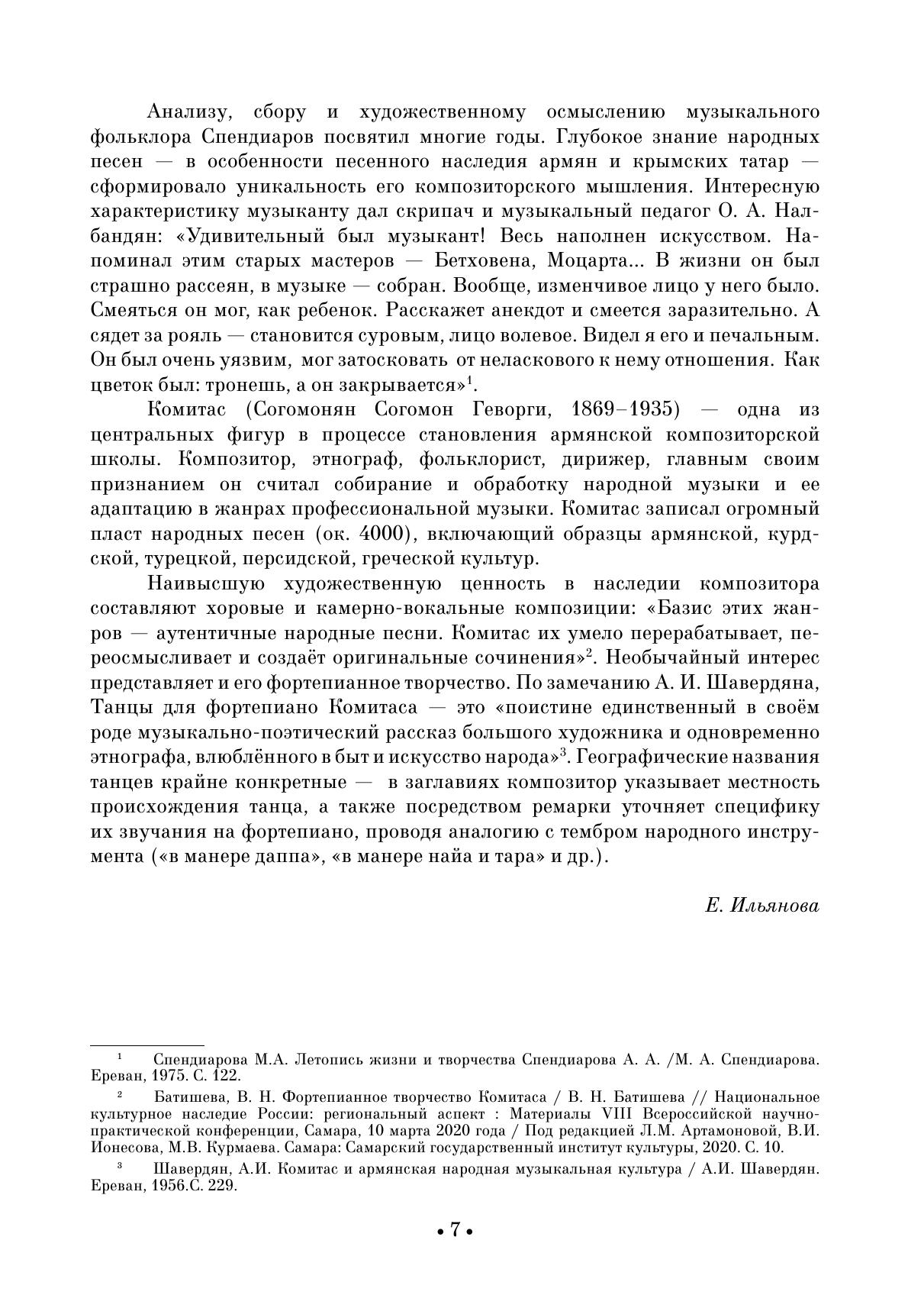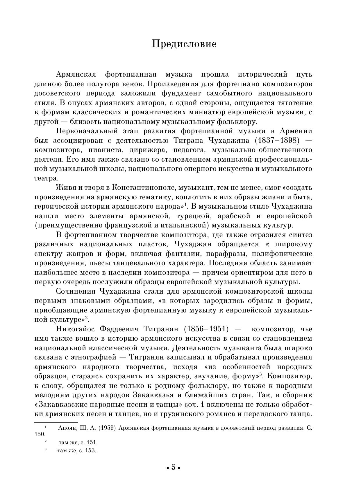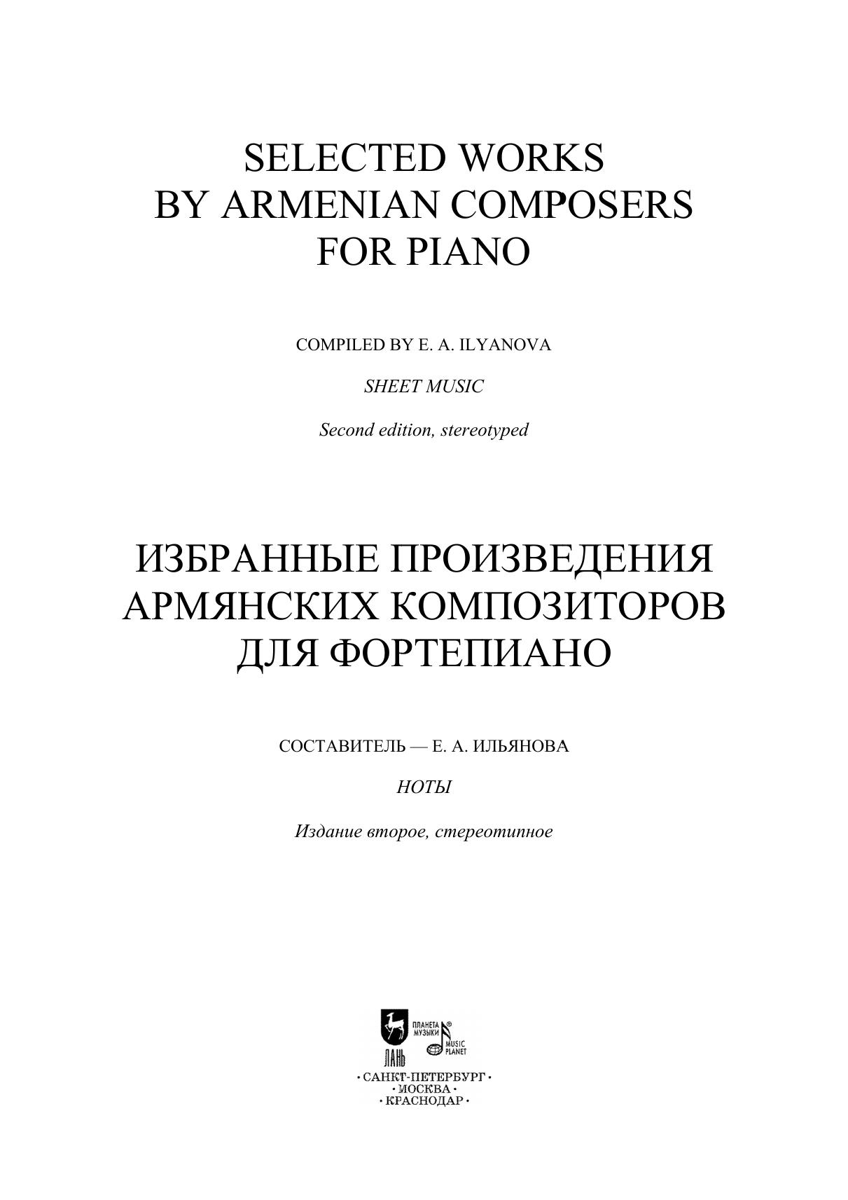 Армянская фортепианная музыка прошла исторический путь длиною более полутора веков. Произведения для фортепиано композиторов досоветского периода заложили фундамент самобытного национального стиля. В опусах армянских авторов с одной стороны ощущается тяготение к формам классических и романтических миниатюр европейской музыки, с другой — близость национальному музыкальному фольклору. В сборник вошли избранные пьесы Т. Чухаджяна, М. Екмаляна, Н. Тиграняна, Комитаса, А. Спендиарова. Издание адресовано студентам музыкальных училищ, вузов, профессиональным исполнителям, любителям фортепианной музыки. The armenian piano music has gone a way of more than one and a half century long. The works for piano by composers of the pre-Soviet period laid the foundation for a special national style. In the opuses of Armenian authors there is, on the one hand, a trend towards the forms of European classical and romantic miniatures, and on the other hand, a closeness to national musical folklore. The collection includes selected pieces by D. Tchouhadjian, M. Ekmalian, N. Tigranian, Komitas, A. Spendiarov. The edition is addressed to students of music colleges, higher schools, performing pianists, and piano music lovers.