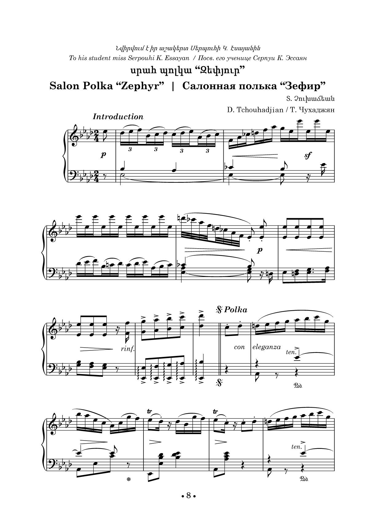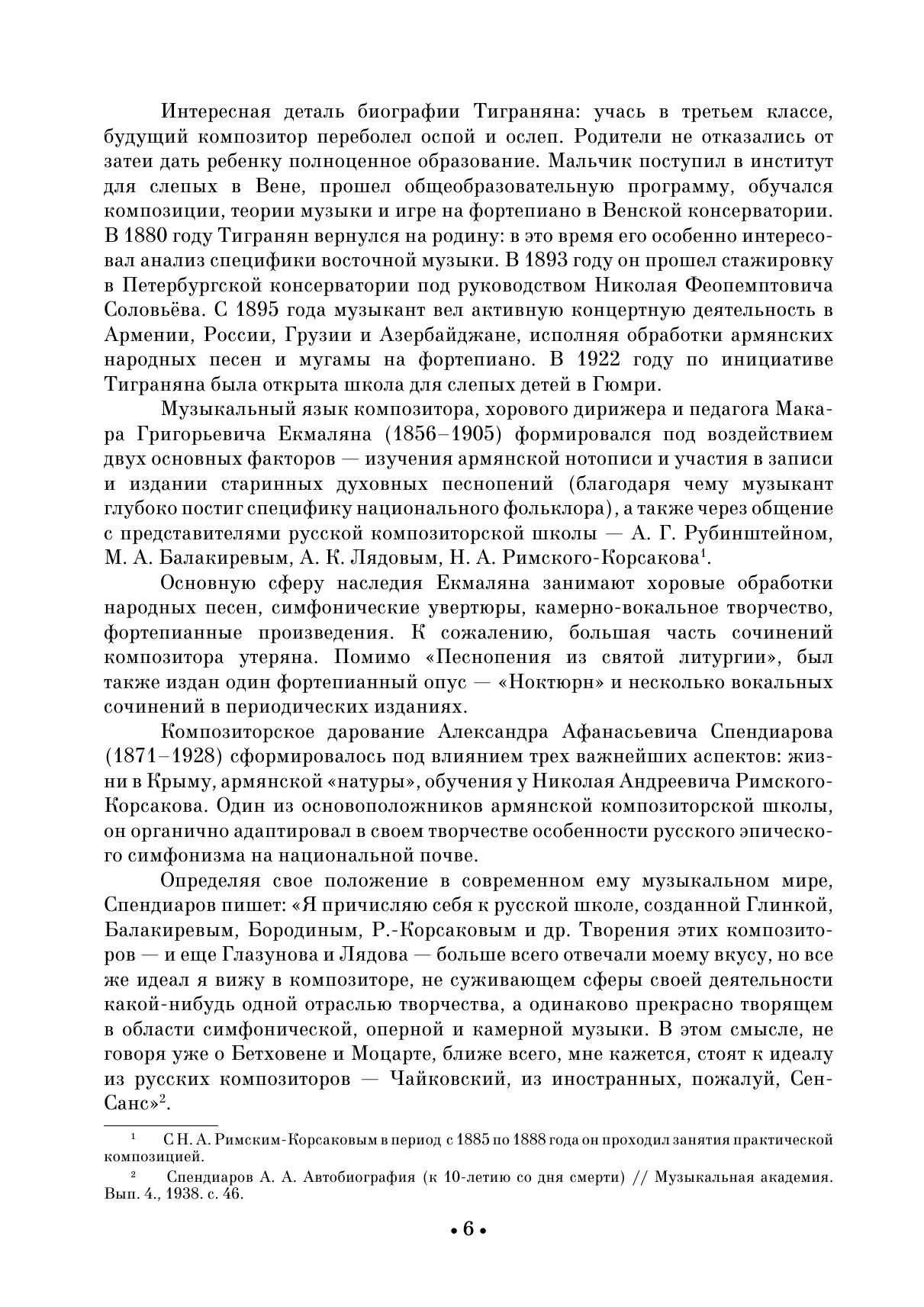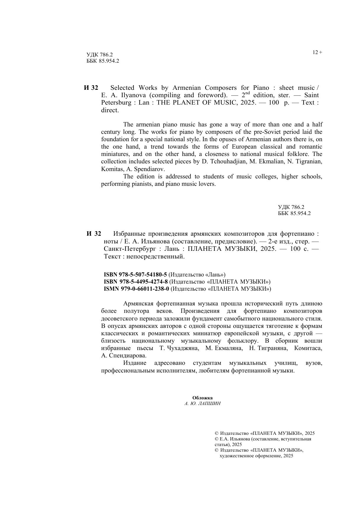 Армянская фортепианная музыка прошла исторический путь длиною более полутора веков. Произведения для фортепиано композиторов досоветского периода заложили фундамент самобытного национального стиля. В опусах армянских авторов с одной стороны ощущается тяготение к формам классических и романтических миниатюр европейской музыки, с другой — близость национальному музыкальному фольклору. В сборник вошли избранные пьесы Т. Чухаджяна, М. Екмаляна, Н. Тиграняна, Комитаса, А. Спендиарова. Издание адресовано студентам музыкальных училищ, вузов, профессиональным исполнителям, любителям фортепианной музыки. The armenian piano music has gone a way of more than one and a half century long. The works for piano by composers of the pre-Soviet period laid the foundation for a special national style. In the opuses of Armenian authors there is, on the one hand, a trend towards the forms of European classical and romantic miniatures, and on the other hand, a closeness to national musical folklore. The collection includes selected pieces by D. Tchouhadjian, M. Ekmalian, N. Tigranian, Komitas, A. Spendiarov. The edition is addressed to students of music colleges, higher schools, performing pianists, and piano music lovers.