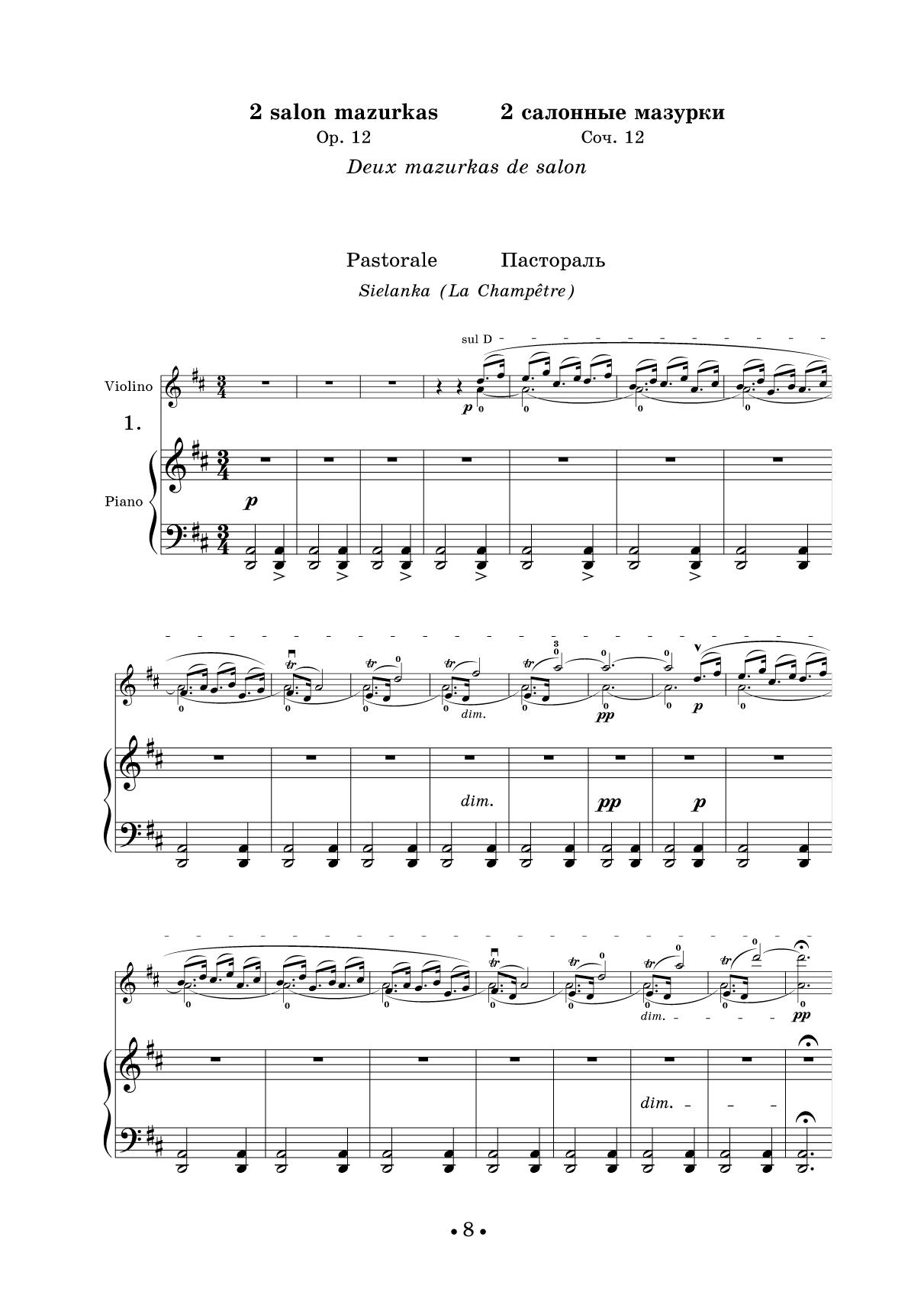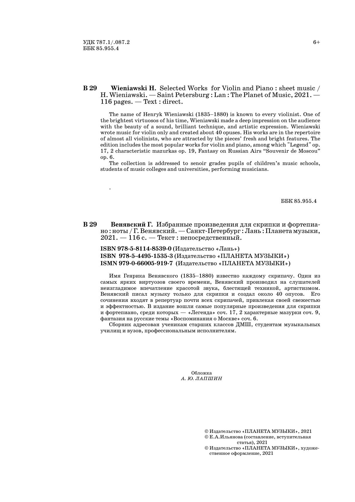 The name of Henryk Wieniawski (1835–1880) is known to every violinist. One of the brightest virtuosos of his time, Wieniawski made a deep impression on the audience with the beauty of a sound, brilliant technique, and artistic expression. Wieniawski wrote music for violin only and created about 40 opuses. His works are in the repertoire of almost all violinists, who are attracted by the pieces’ fresh and bright features. The edition includes the most popular works for violin and piano, among which "Legend" op. 17, 2 characteristic mazurkas op. 19, Fantasy on Russian Airs “Souvenir de Moscou” op. 6.