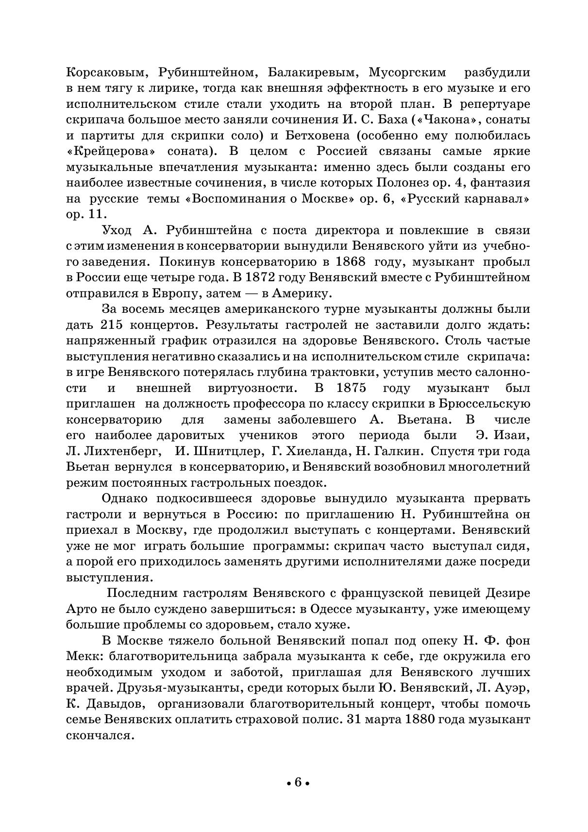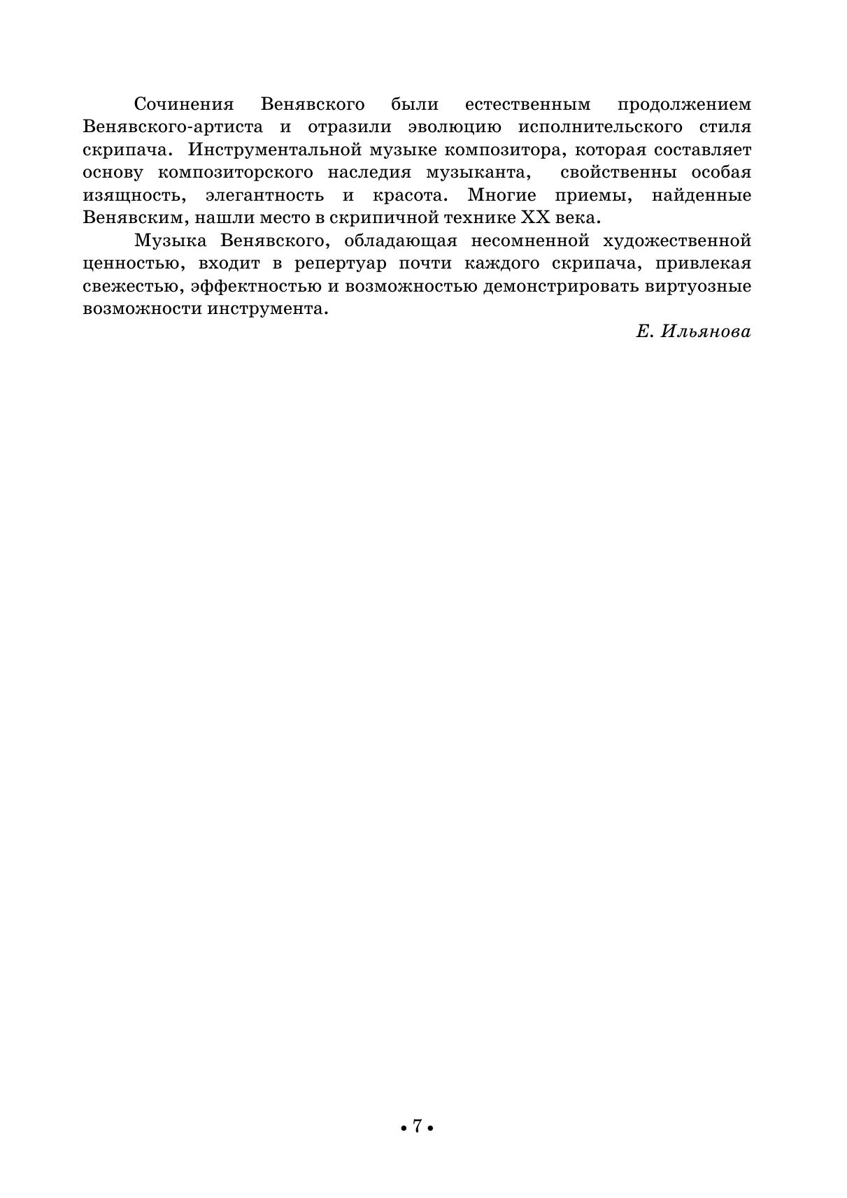 Имя Генрика Венявского (1835-1880) известно каждому скрипачу. Один из самых ярких виртуозов своего времени, Венявский производил на слушателей неизгладимое впечатление красотой звука, блестящей техникой, артистизмом. Венявский писал музыку только для скрипки и создал около 40 опусов. Его сочинения входят в репертуар почти всех скрипачей, привлекая своей свежестью и эффектностью. В издание вошли самые популярные произведения для скрипки и фортепиано, среди которых — «Легенда» соч. 17, 2 характерные мазурки соч. 9, фантазия на русские темы «Воспоминания о Москве» соч. 6.