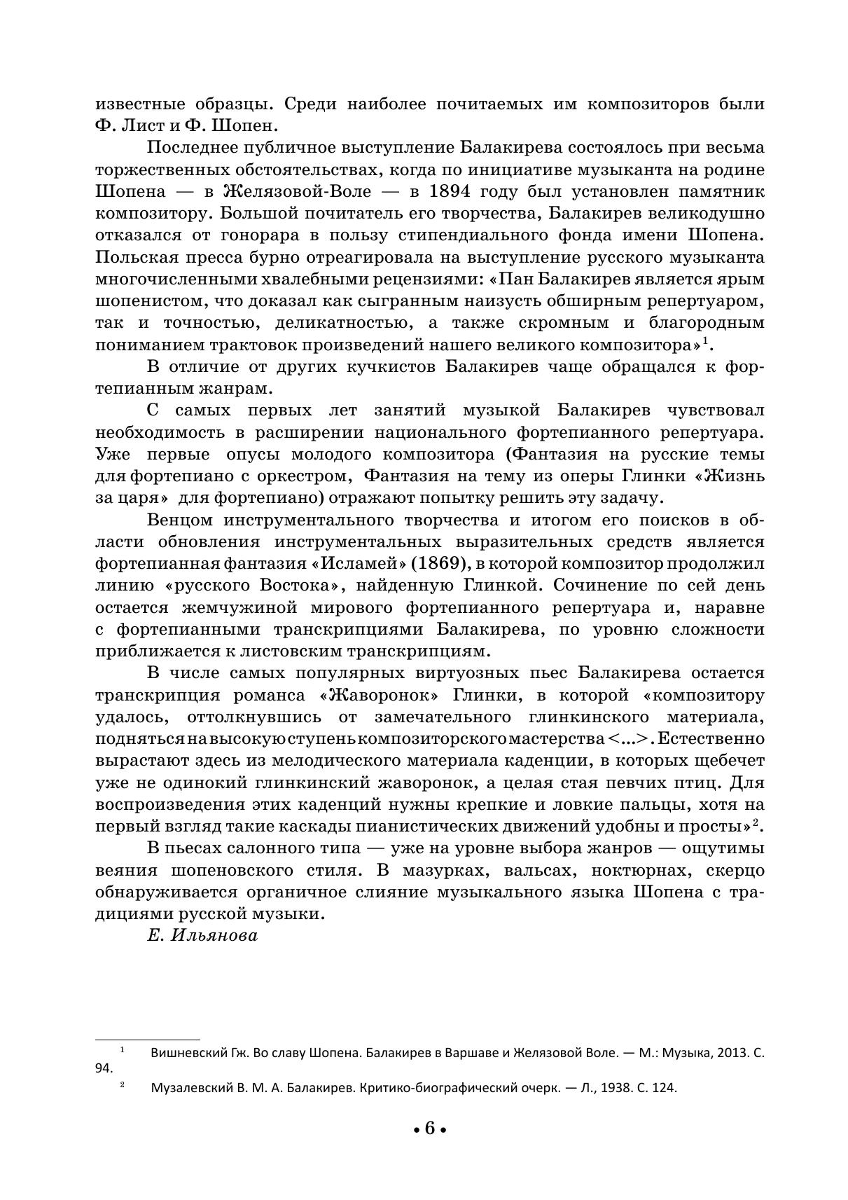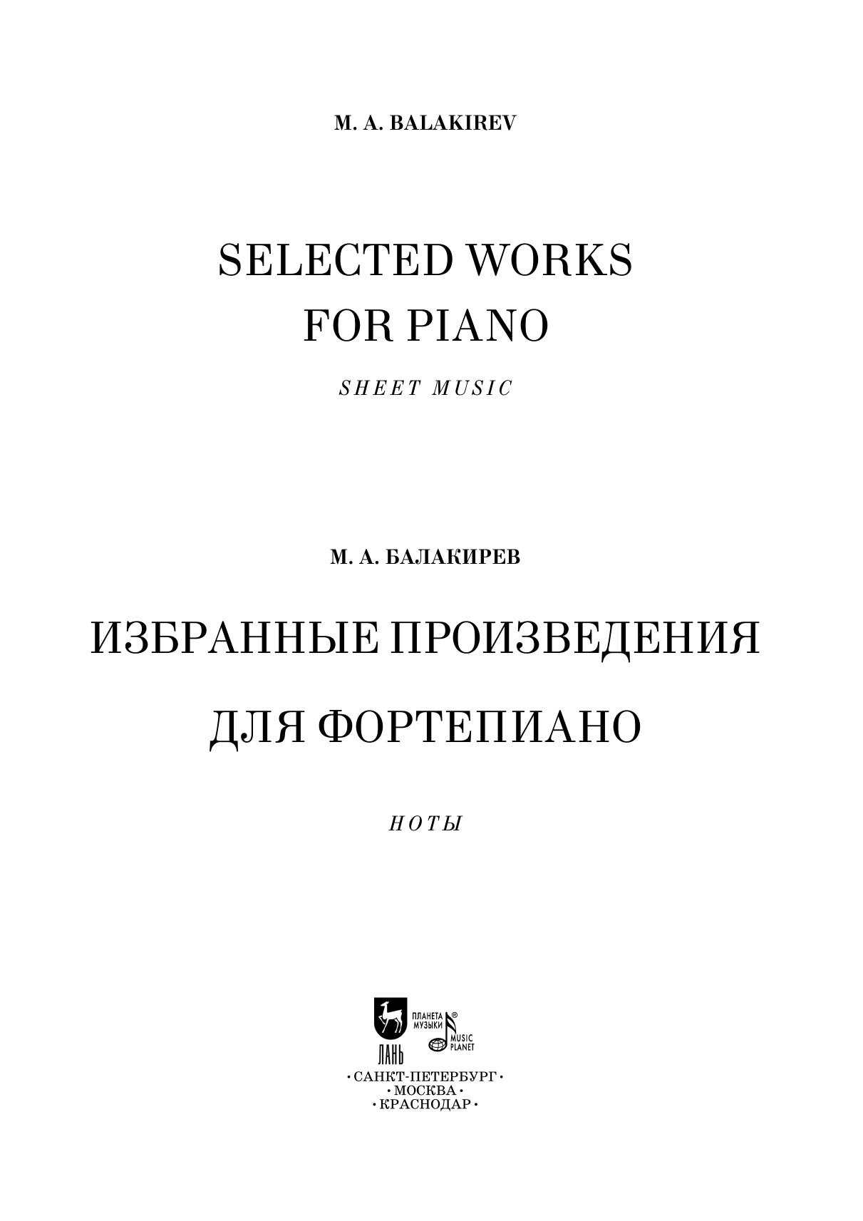 К жанрам фортепианной музыки Милий Алексеевич Балакирев (1837-1910) обращался значительно чаще, чем его коллеги по кружку. Наследие композитора представлено сочинениями виртуозно-концертного плана и салонными пьесами. В числе самых популярных виртуозных пьес Балакирева остается транскрипция романса «Жаворонок» Глинки, в которой, по словам Музалевского, «щебечет уже не одинокий глинкинский жаворонок, а целая стая певчих птиц». В мазурках, вальсах, ноктюрнах, скерцо обнаруживается органичное слияние шопеновского стиля с традициями русской музыки. Издание адресовано студентам музыкальных училищ и вузов, концертирующим пианистам.
