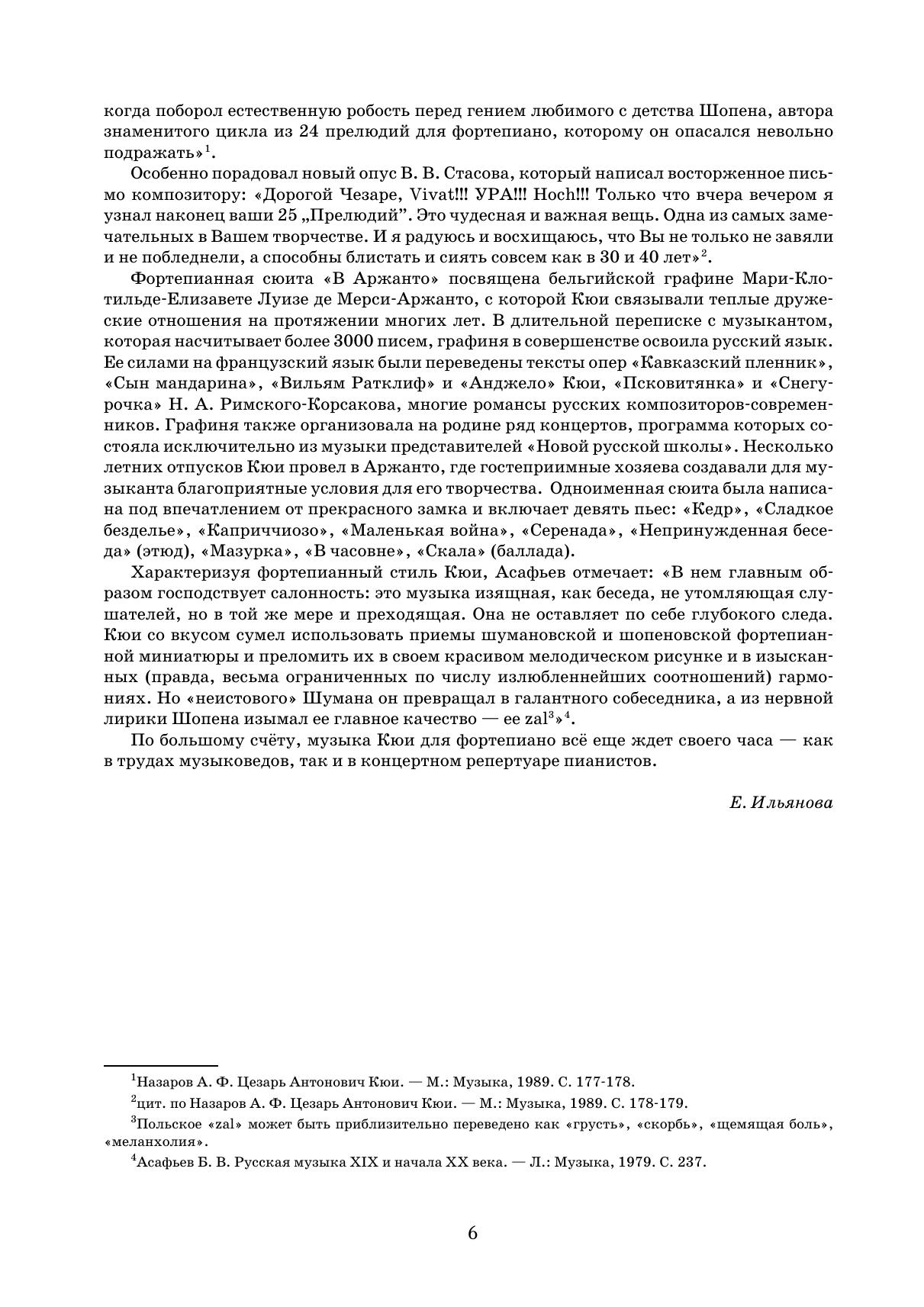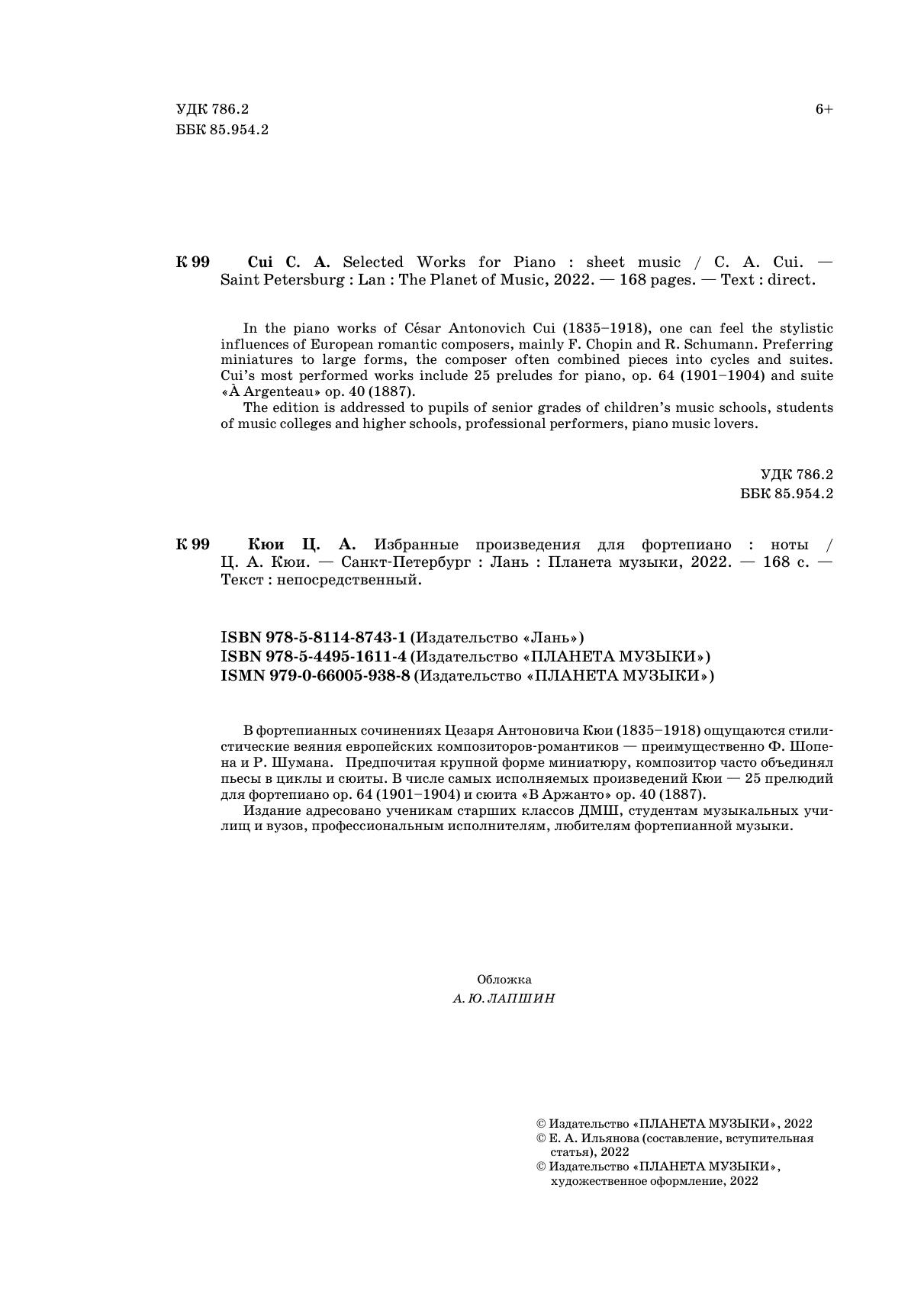 In the piano works of César Antonovich Cui (1835–1918), one can feel the stylistic influences of European romantic composers, mainly F. Chopin and R. Schumann. Preferring miniatures to large forms, the composer often combined pieces into cycles and suites. Cui’s most performed works include 25 preludes for piano, op. 64 (1901–1904) and suite “À Argenteau” op. 40 (1887). The edition is addressed to pupils of senior grades of children’s music schools, students of music colleges and higher schools, professional performers, piano music lovers.