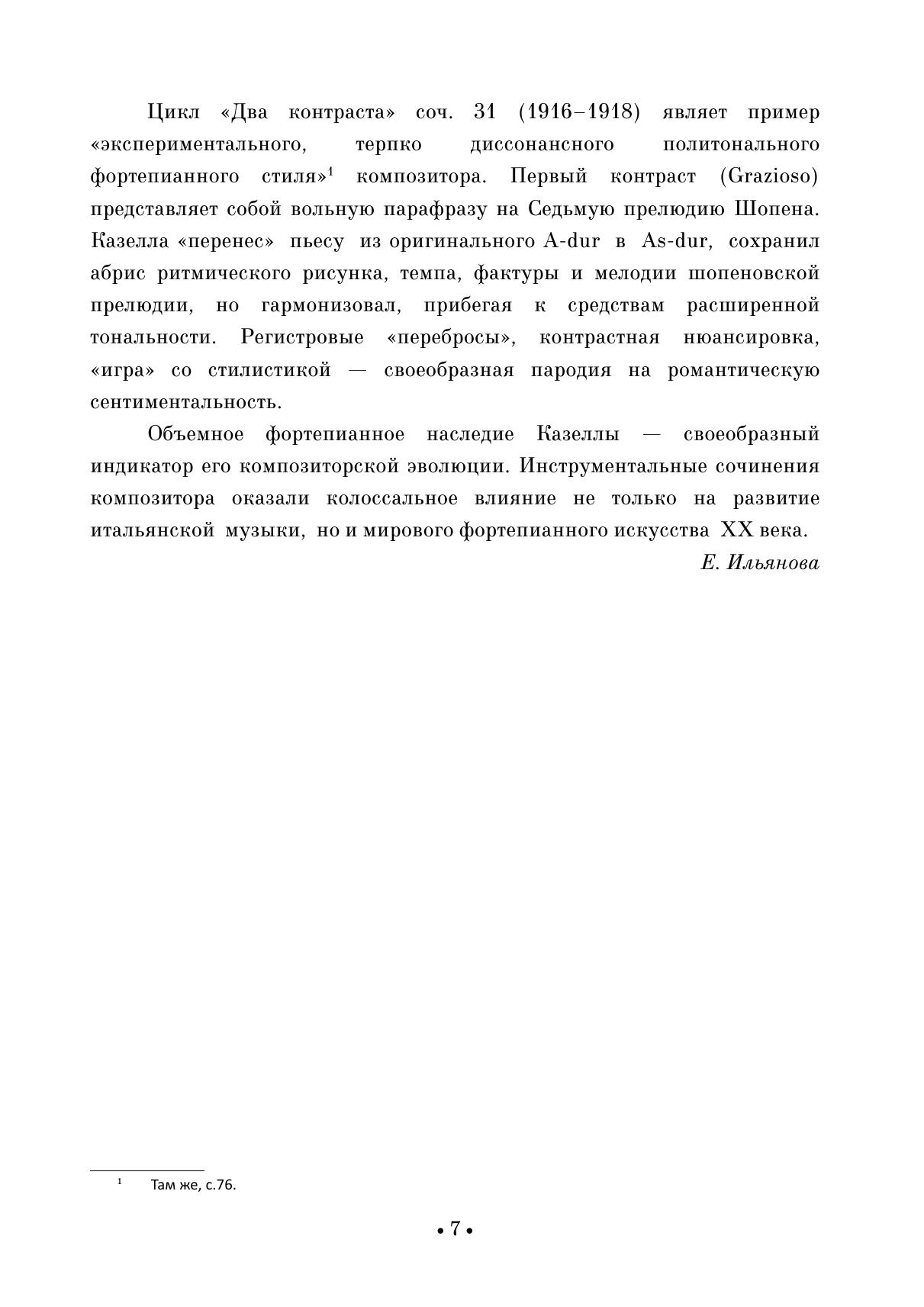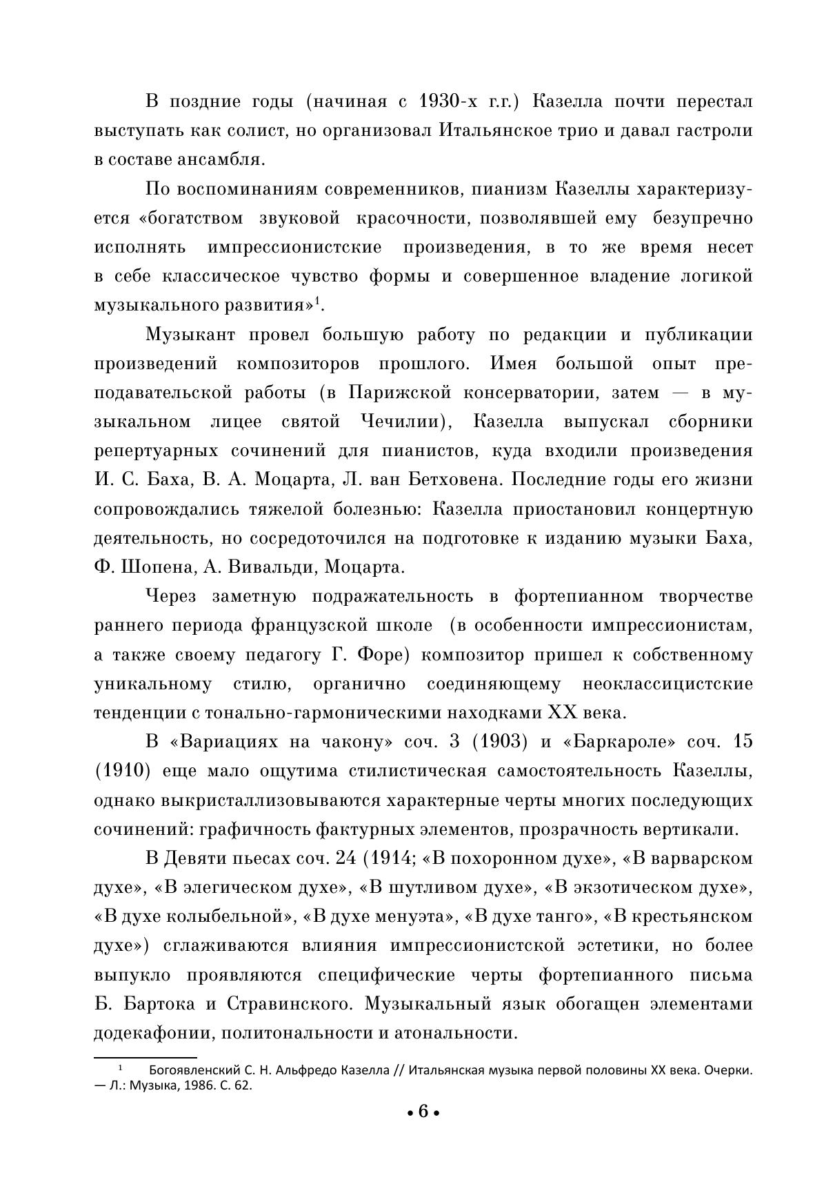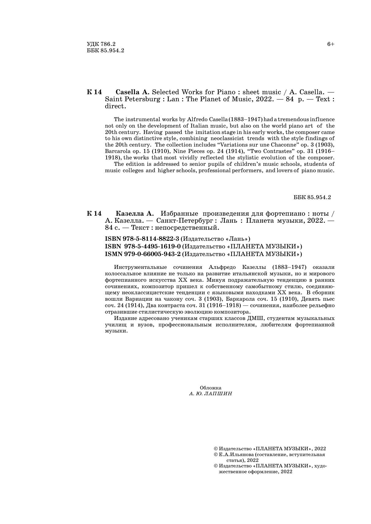 Инструментальные сочинения Альфредо Казеллы (1883-1947) оказали колоссальное влияние не только на развитие итальянской музыки, но и мирового фортепианного искусства XX века. Минуя подражательную тенденцию в ранних сочинениях, композитор пришел к собственному самобытному стилю, соединяющему неоклассицистские тенденции с языковыми находками XX века. В сборник вошли Вариации на чакону соч. 3 (1903), Баркарола соч. 15 (1910), Девять пьес соч. 24 (1914), Два контраста соч. 31 (1916-1918) — сочинения, наиболее рельефно отразившие стилистическую эволюцию композитора. Издание адресовано ученикам старших классов ДМШ, студентам музыкальных училищ и вузов, профессиональным исполнителям, любителям фортепианной музыки.