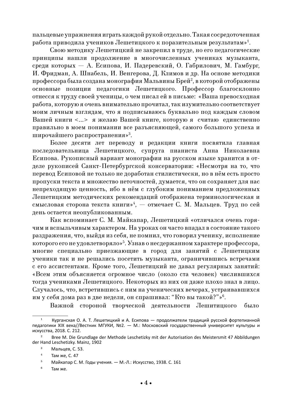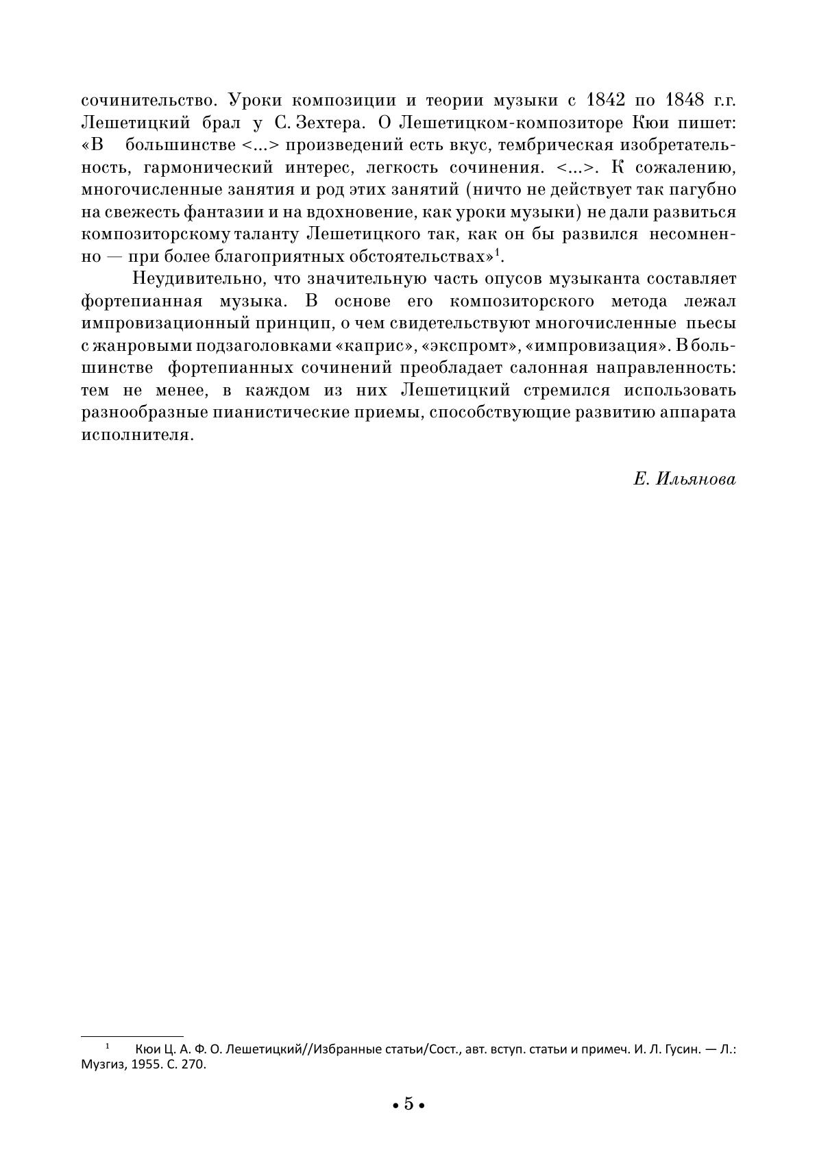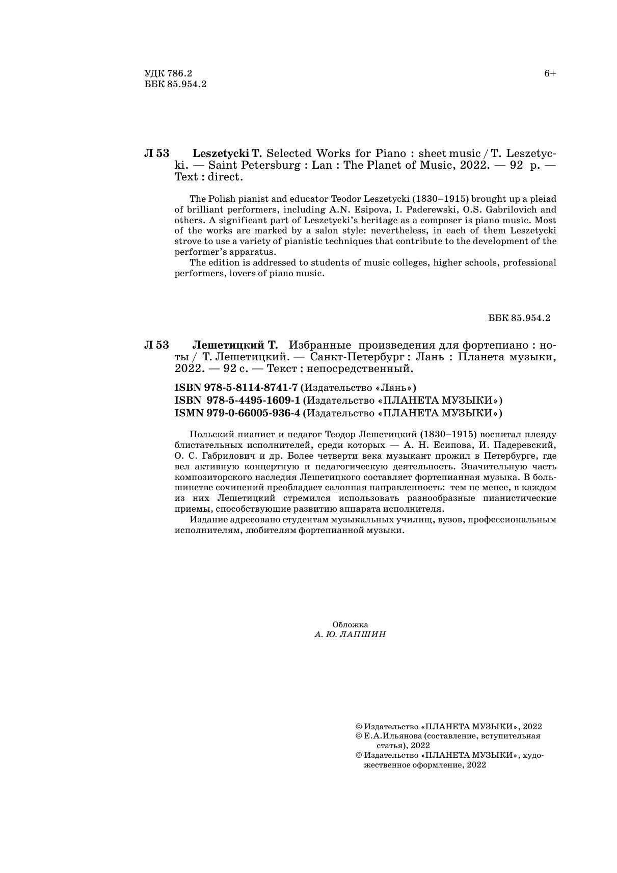 The Polish pianist and educator Teodor Leszetycki (1830-1915) brought up a pleiad of brilliant performers, including A.N. Esipova, I. Paderewski, O.S. Gabrilovich and others. A significant part of Leszetycki’s heritage as a composer is piano music. Most of the works are marked by a salon style: nevertheless, in each of them Leszetycki strove to use a variety of pianistic techniques that contribute to the development of the performer’s apparatus.
